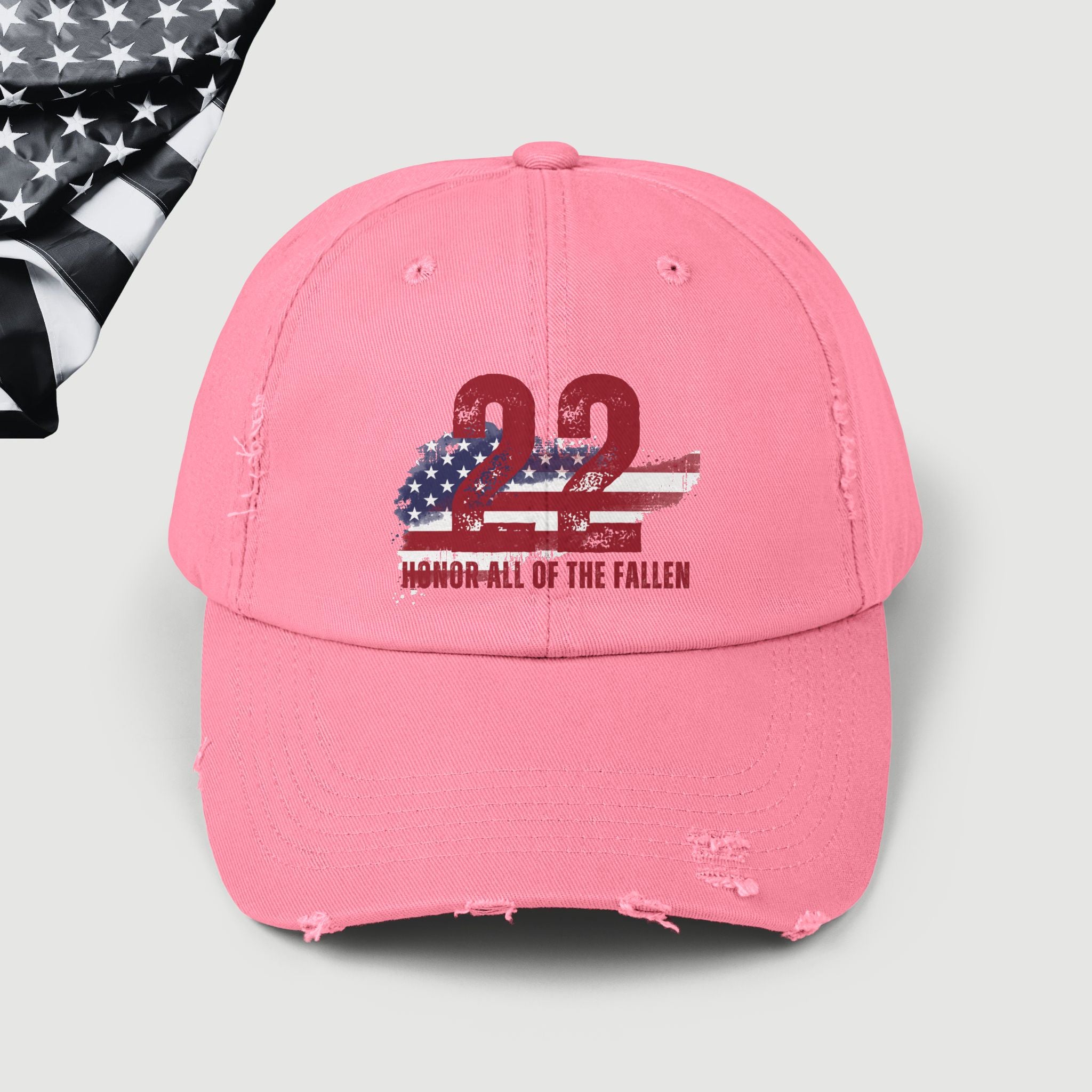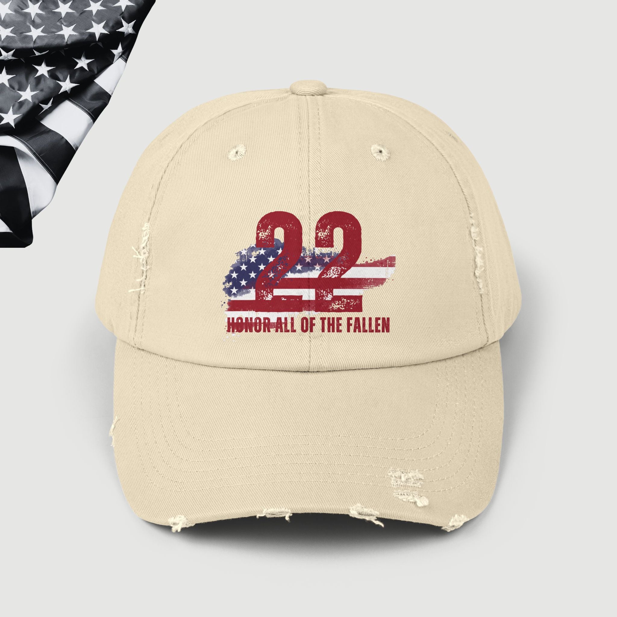 Show your support for American veterans with this distressed style dad hat, featuring a bold design that makes a powerful statement. The cap displays a large distressed American Flag and a prominent "22" on a black background, symbolizing the average 22 veterans who tragically commit suicide each day. Below the flag, the phrase "Honor all of the fallen" is printed in grunge-style red font, serving as a heartfelt tribute to those who have served. This adjustable hat is perfect for daily wear, veteran events, or simply showing your patriotism.