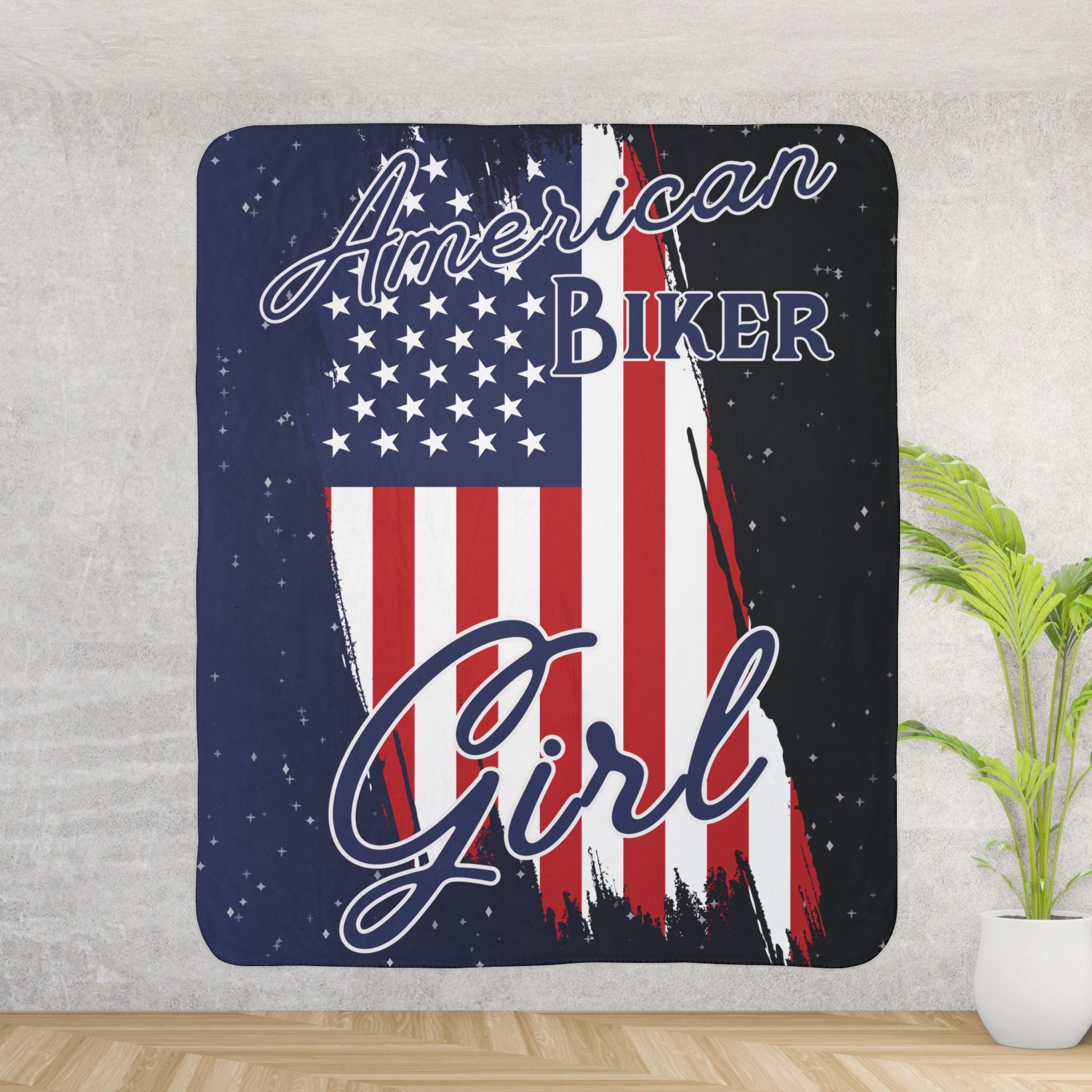Elevate your comfort with our American Biker Girl Flag Sherpa Fleece Blanket. This cozy and stylish Motorcycle Chic, Moto Mom blanket is perfect for keeping you warm during the cooler winter months. Great as a family blanket for the sofa or as a gift for the motorcycle rider in your life.