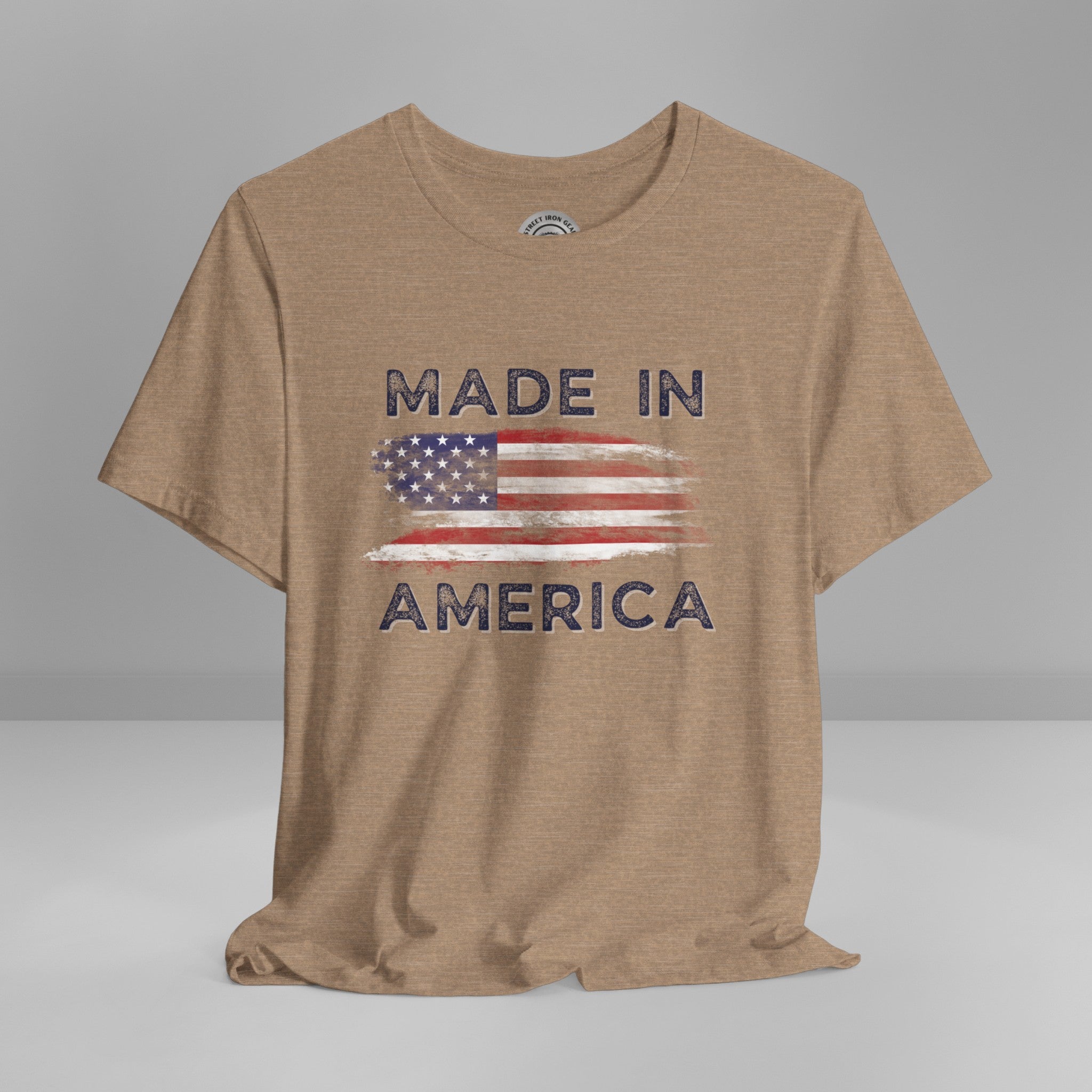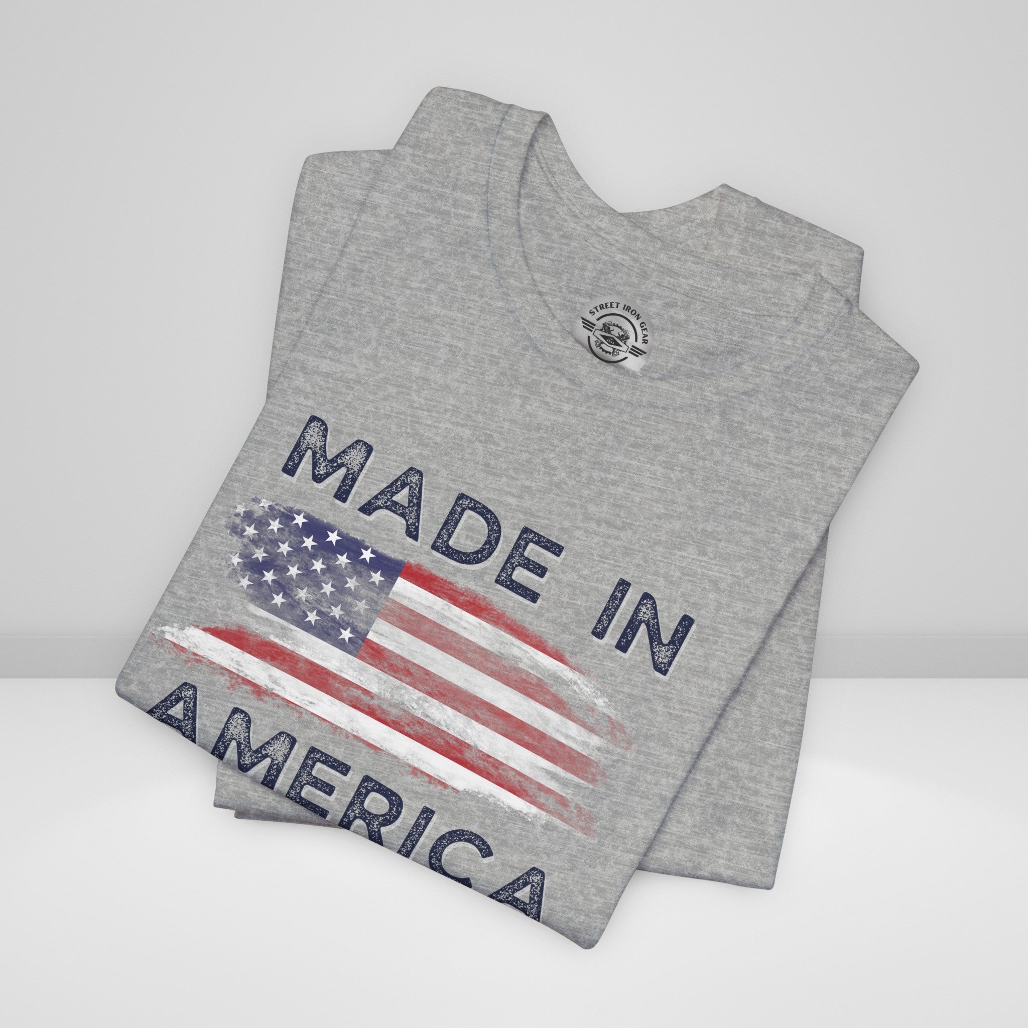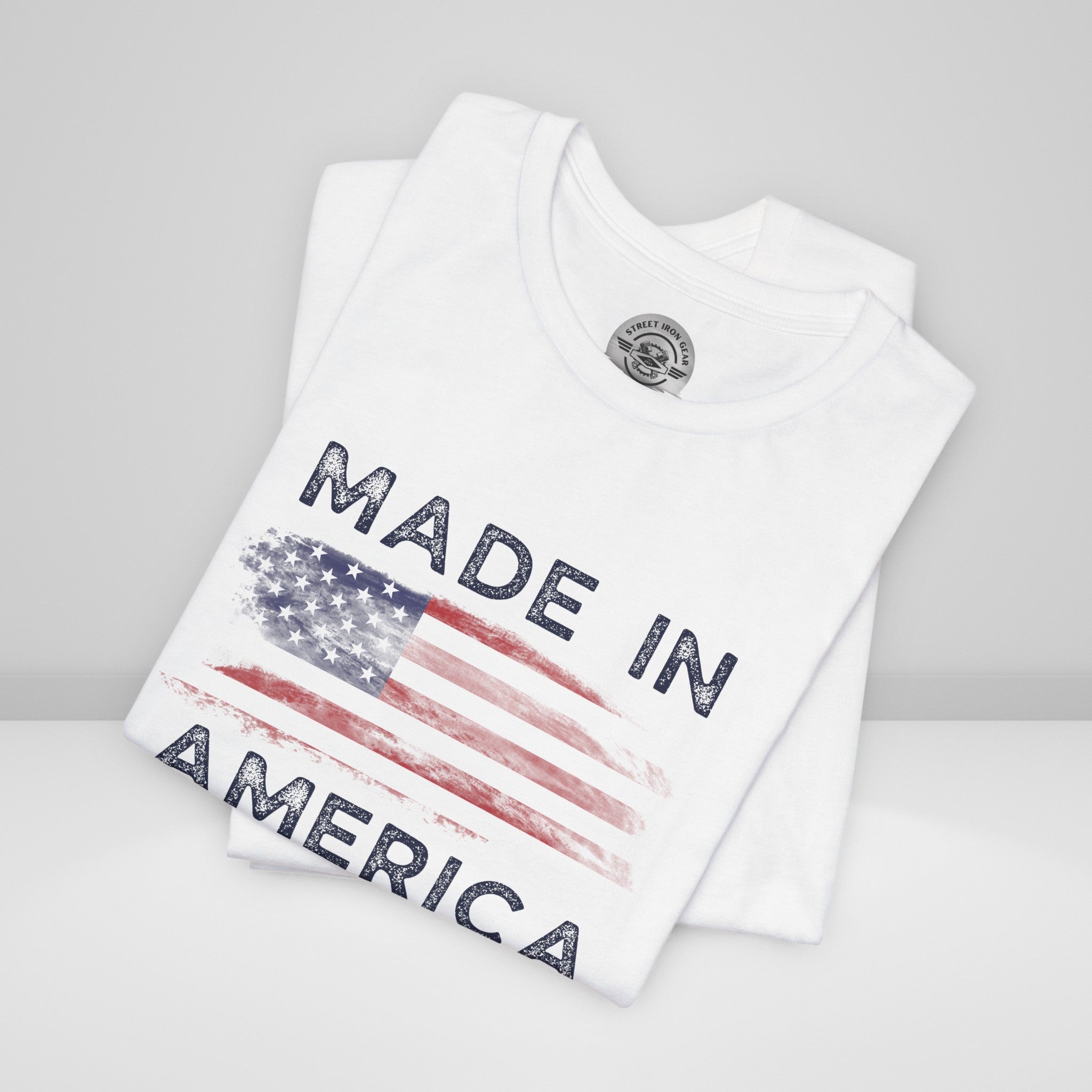 Show your unwavering support with our American Patriot T-shirt! This tee proudly features a grunge style American Flag with the bold statement 'Made in America' making this T-shirt a stylish choice for a true American patriot.