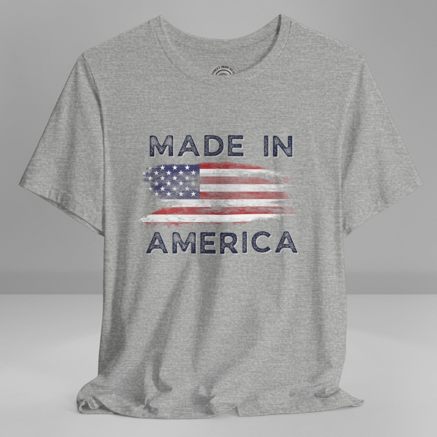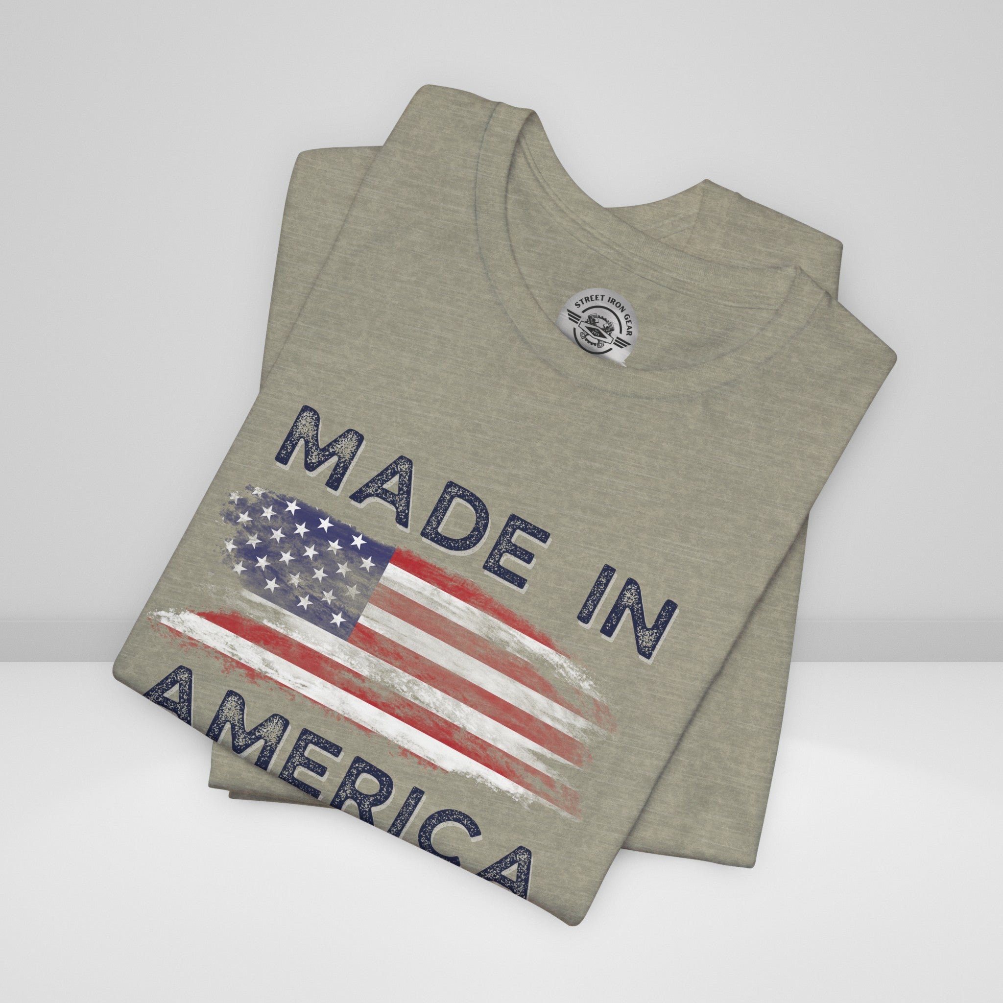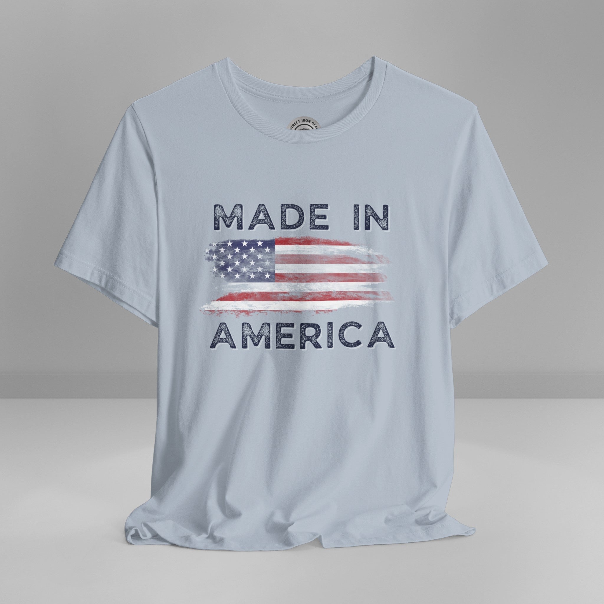 Show your unwavering support with our American Patriot T-shirt! This tee proudly features a grunge style American Flag with the bold statement 'Made in America' making this T-shirt a stylish choice for a true American patriot.