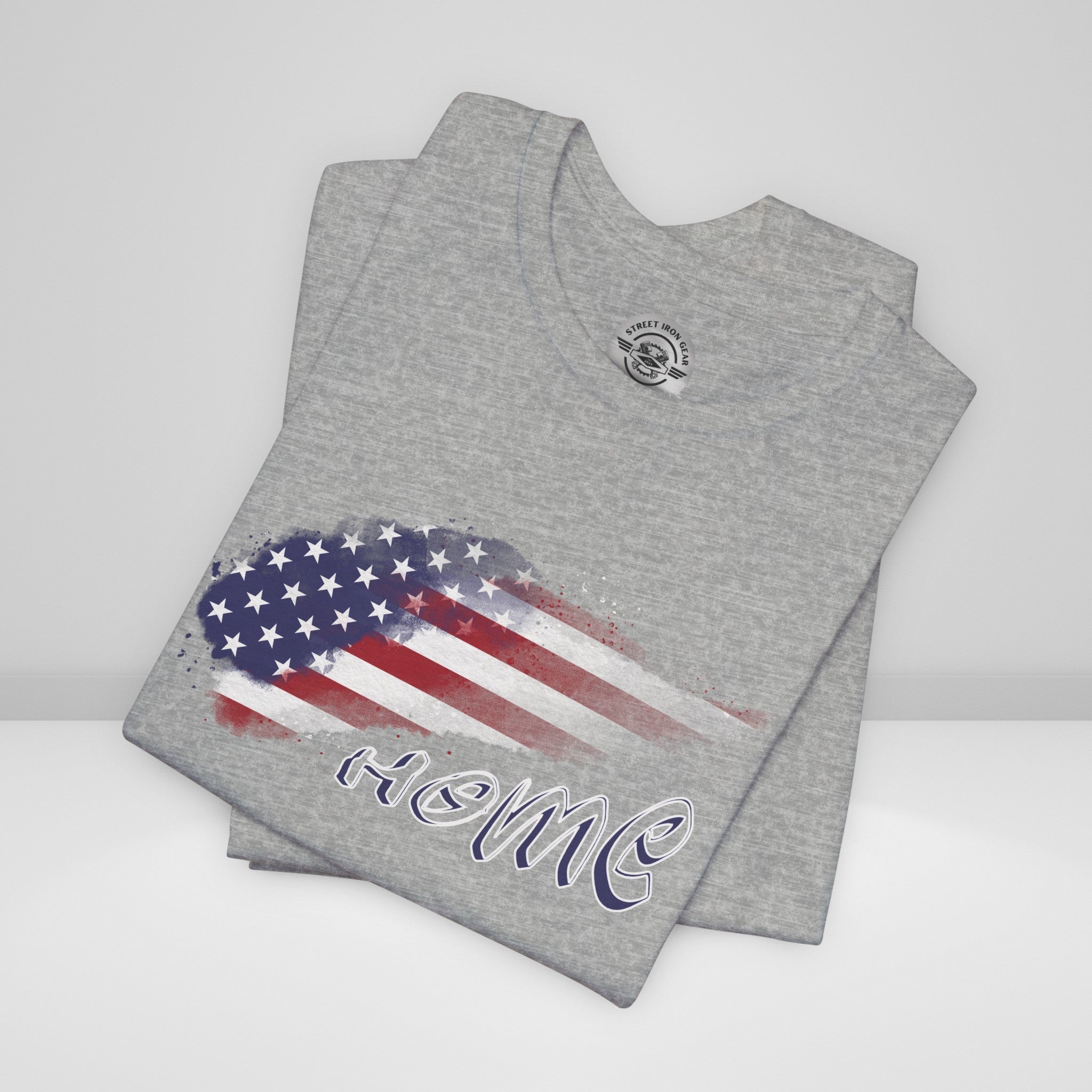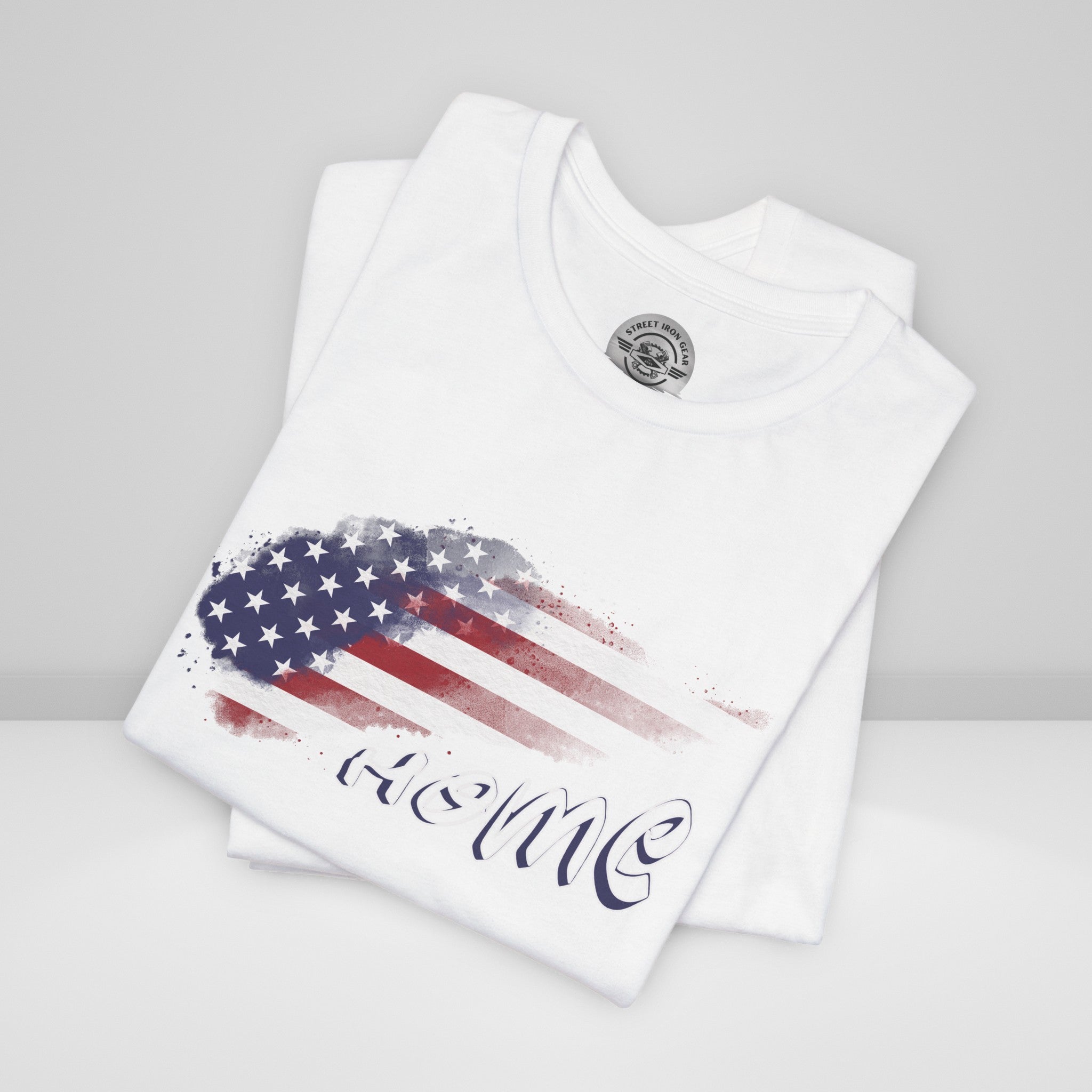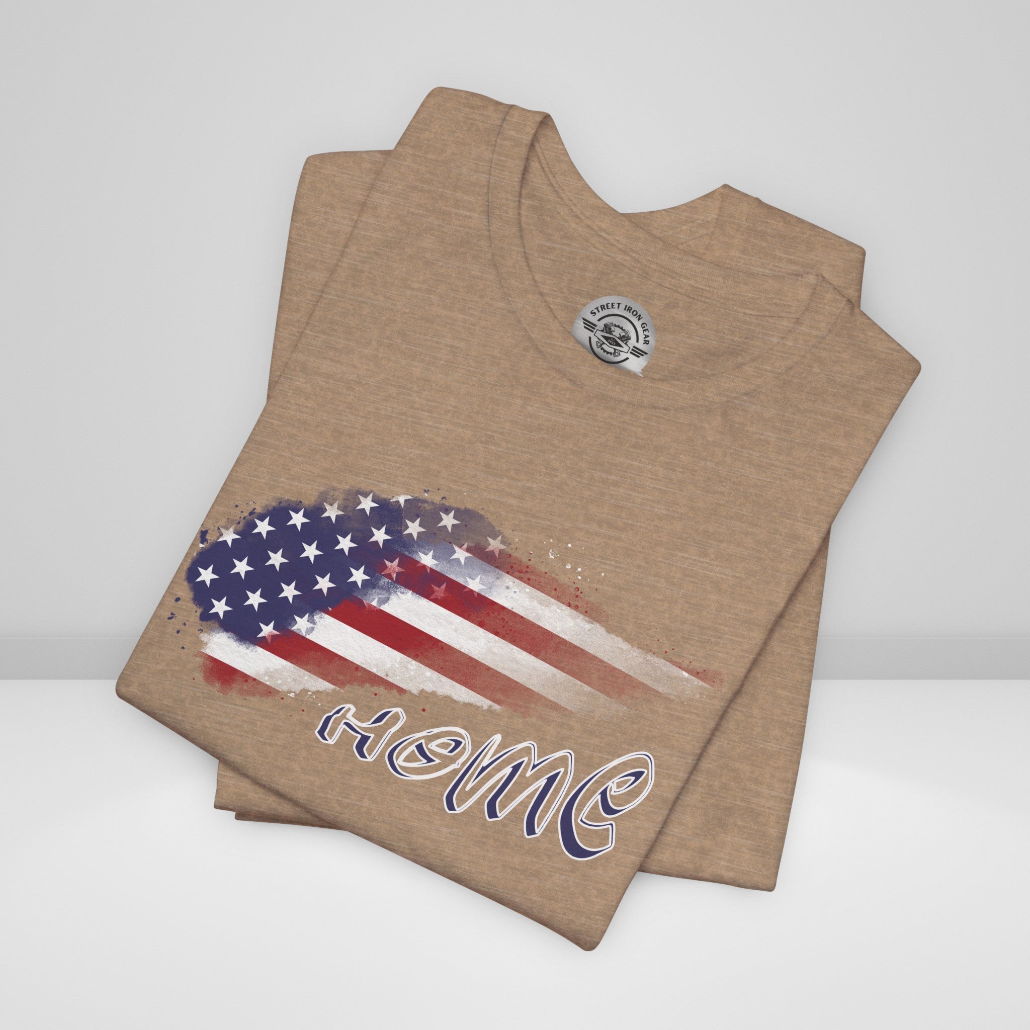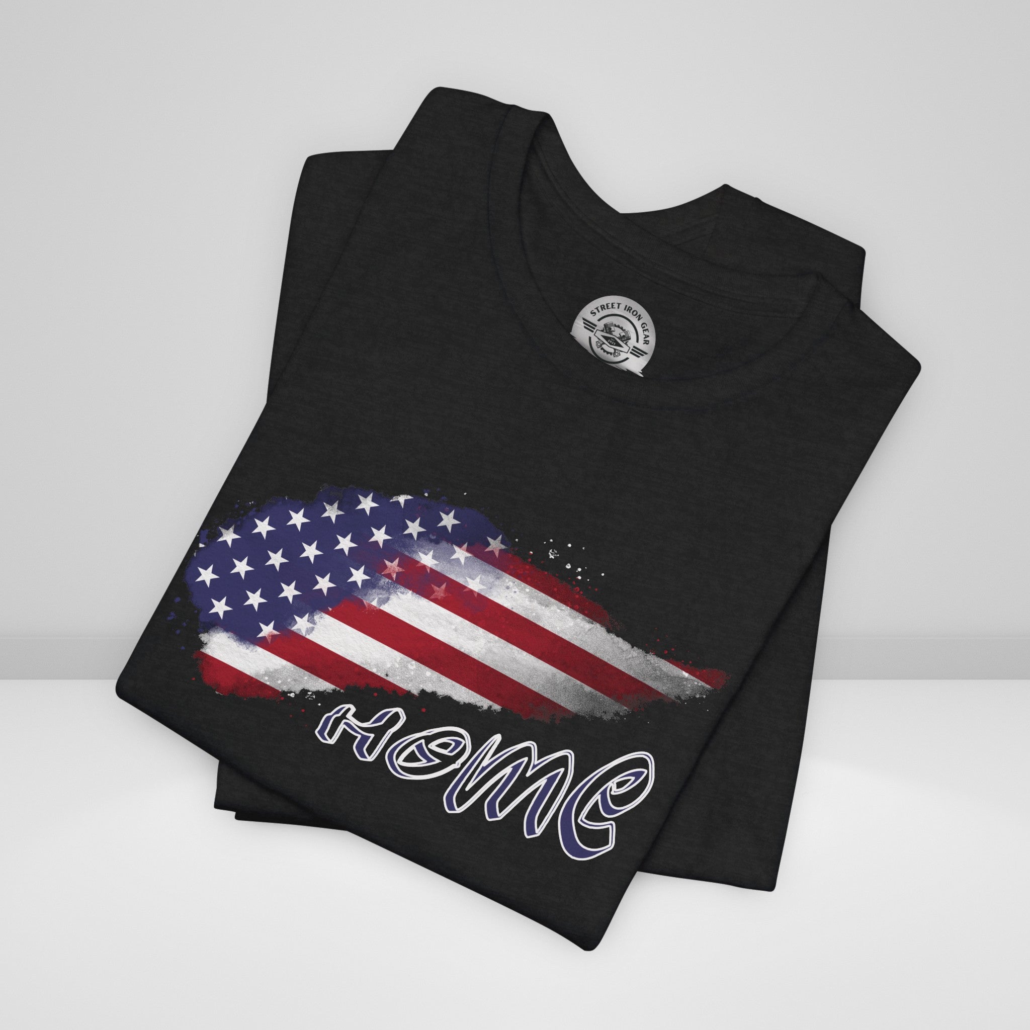 Show your unwavering support with our "American Patriot" T-shirt! This tee proudly features a grunge style American Flag with the bold statement 'Home' making this T-shirt a stylish choice for a true American patriot.