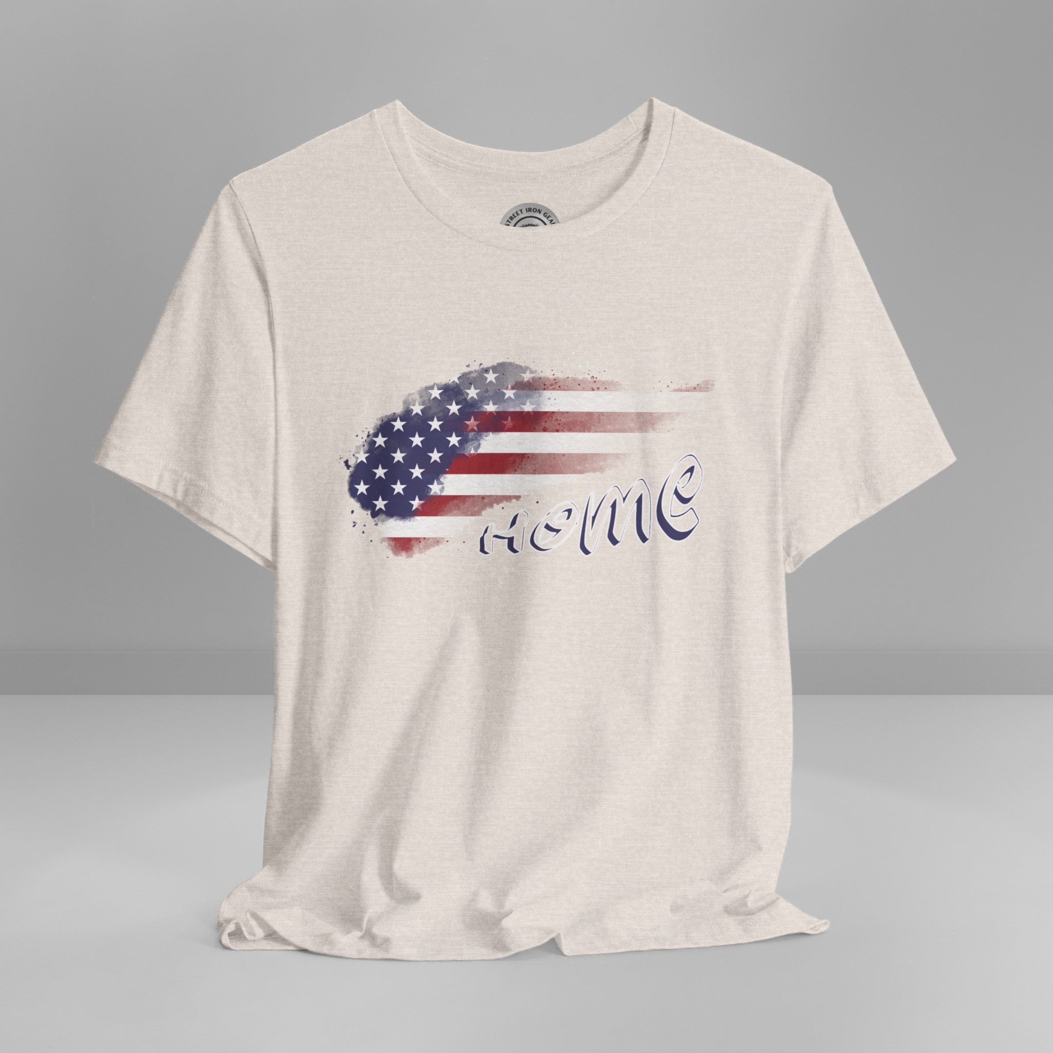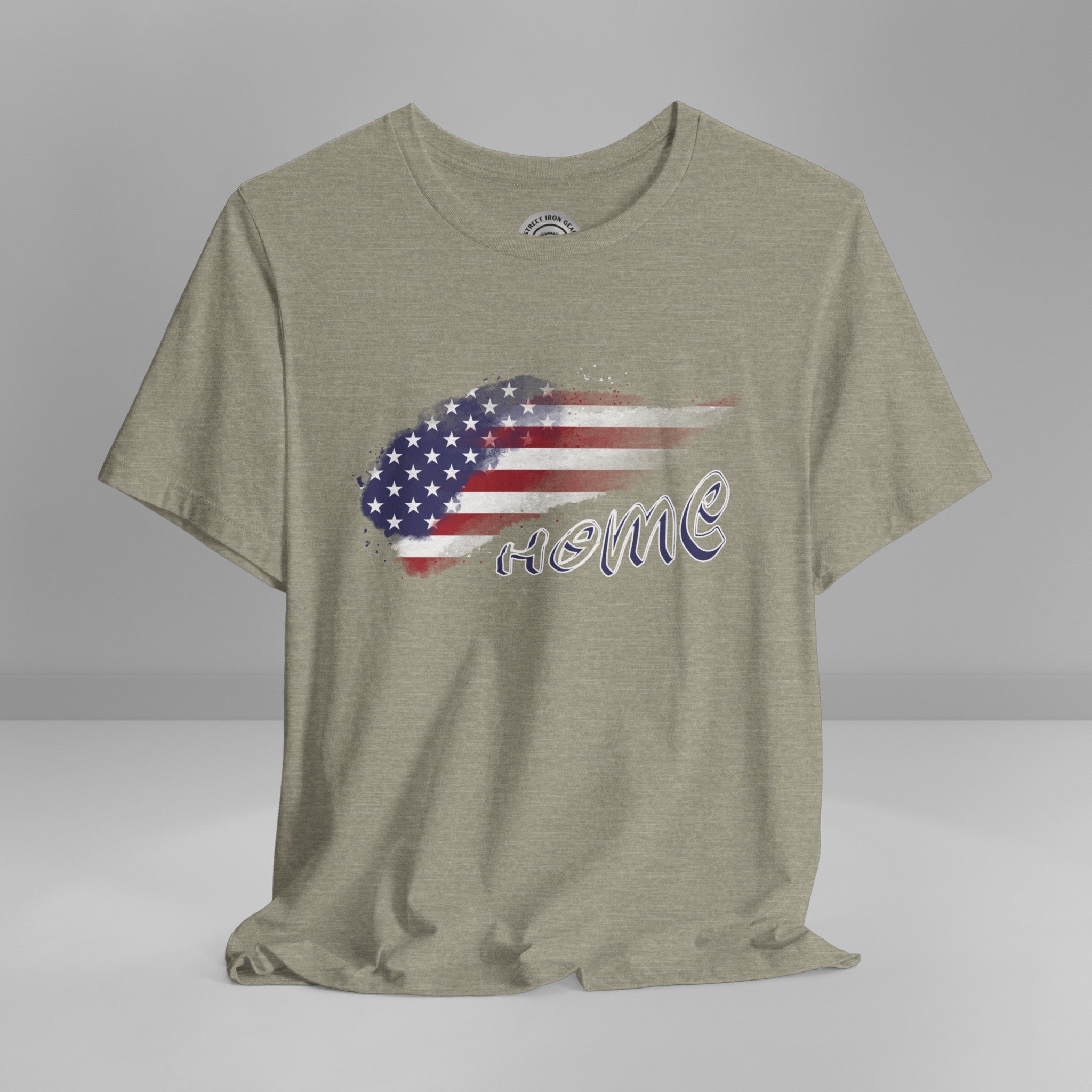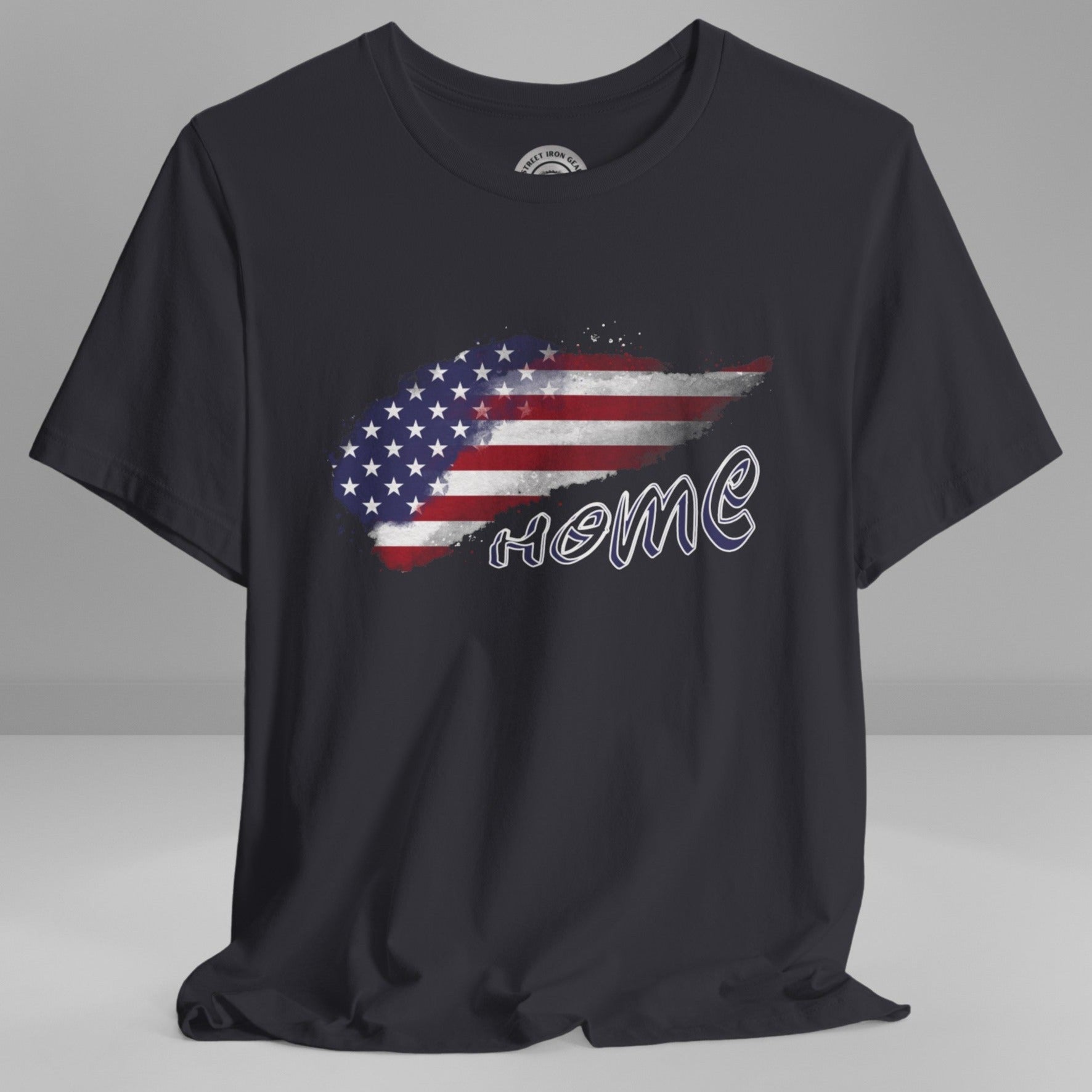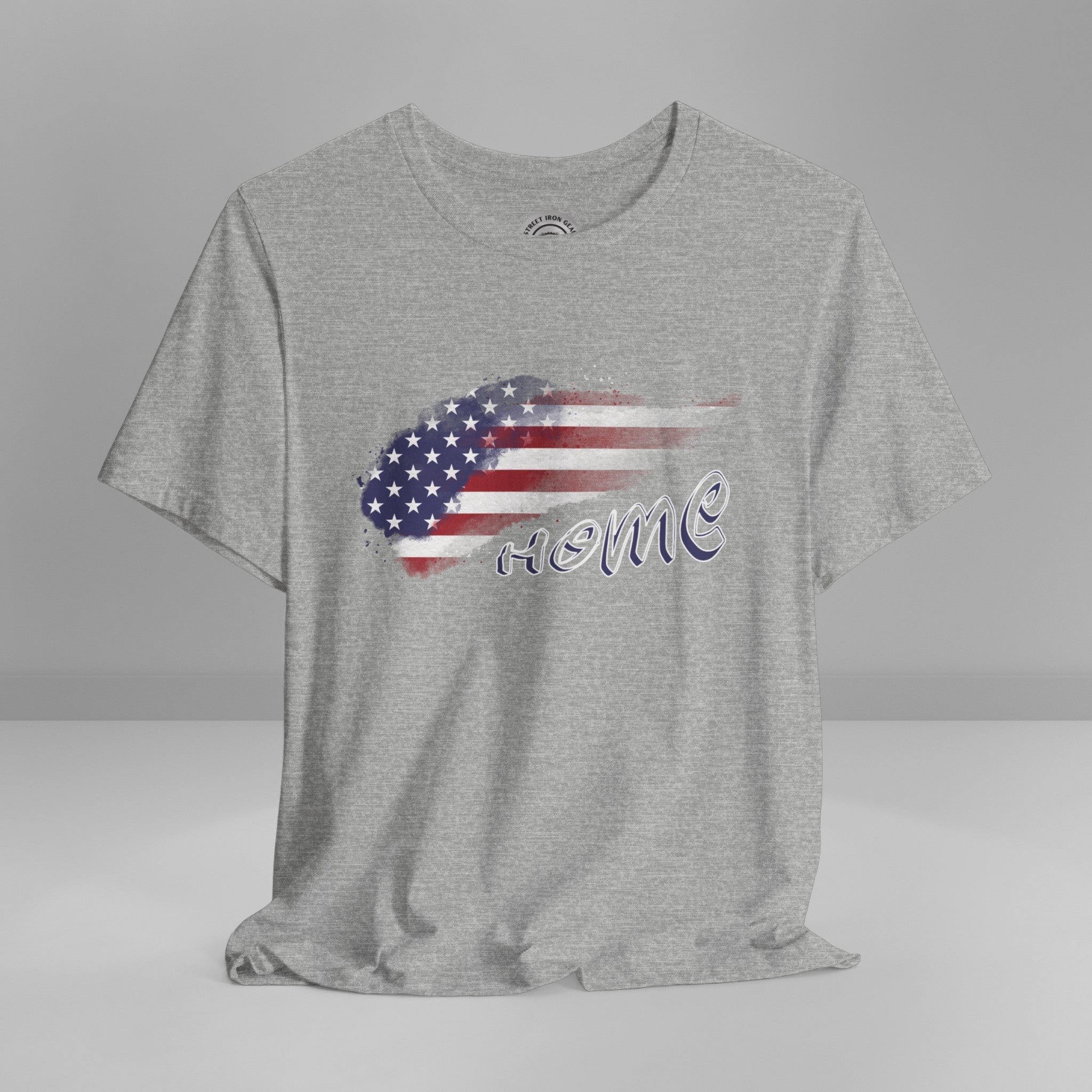 Show your unwavering support with our "American Patriot" T-shirt! This tee proudly features a grunge style American Flag with the bold statement 'Home' making this T-shirt a stylish choice for a true American patriot.