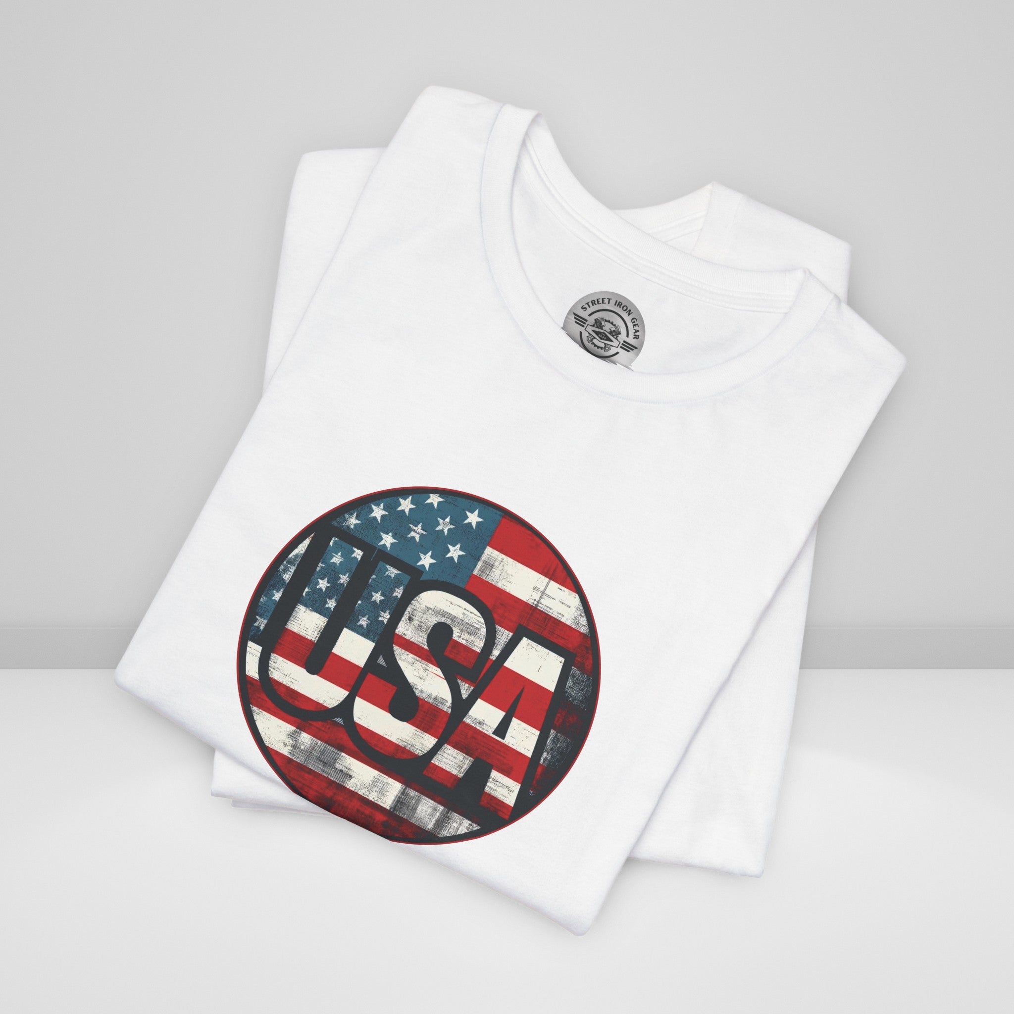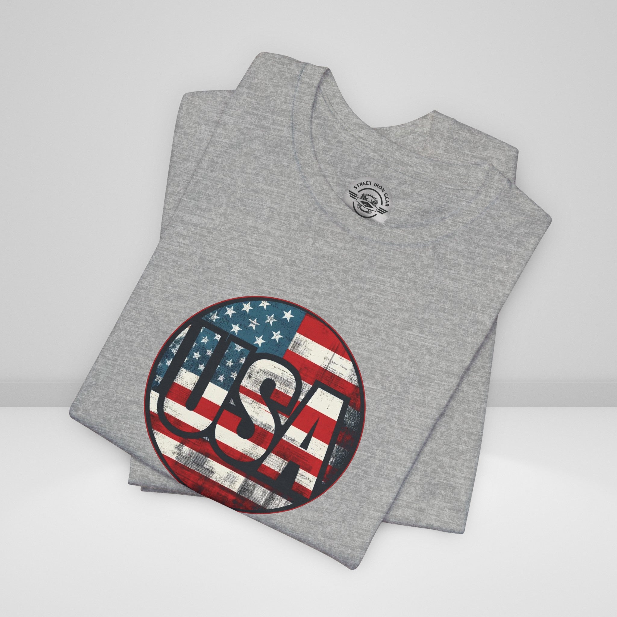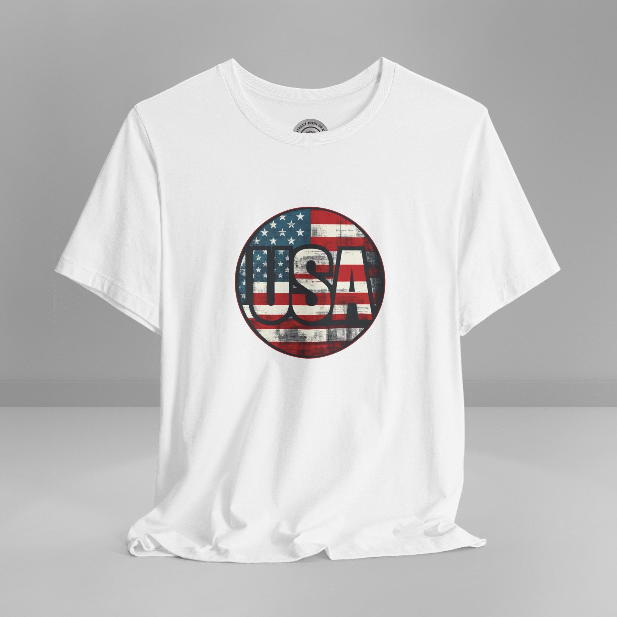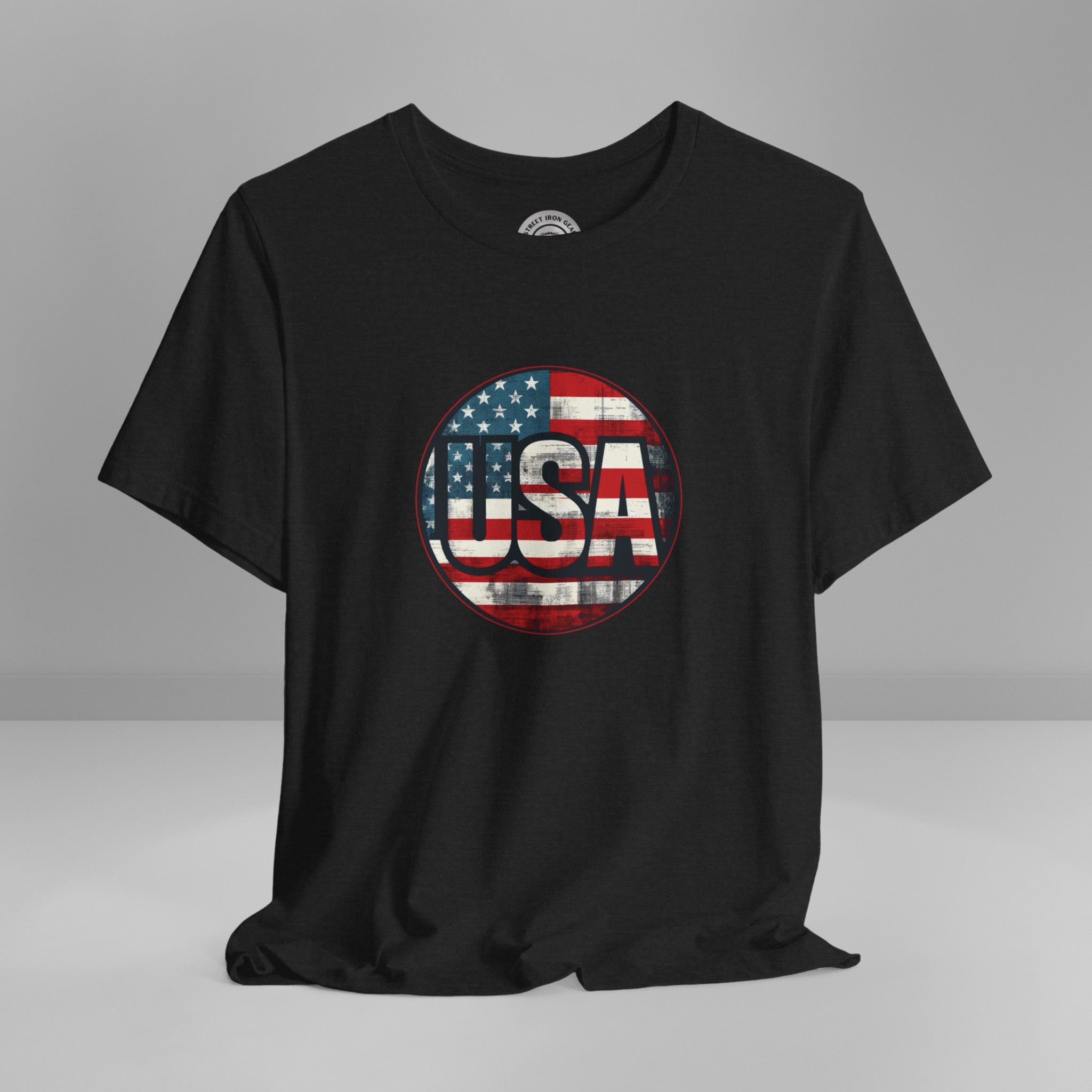 Show your unwavering support with our "American Patriot" T-shirt! This tee proudly features a grunge style American Flag with the bold statement 'USA' making this T-shirt a stylish choice for a true American patriot.