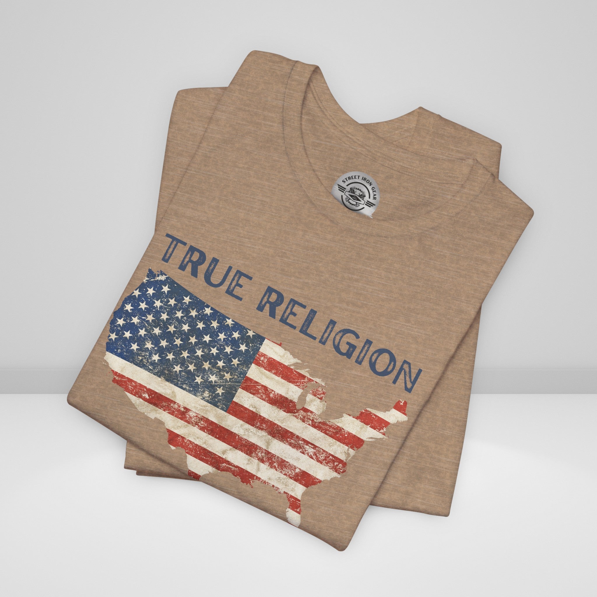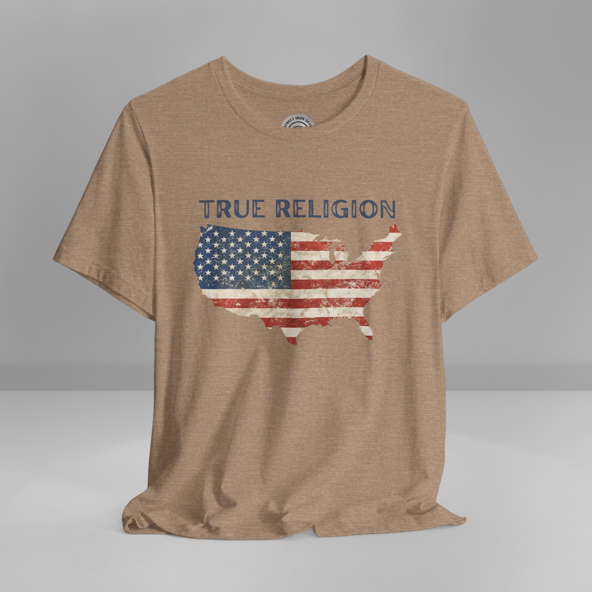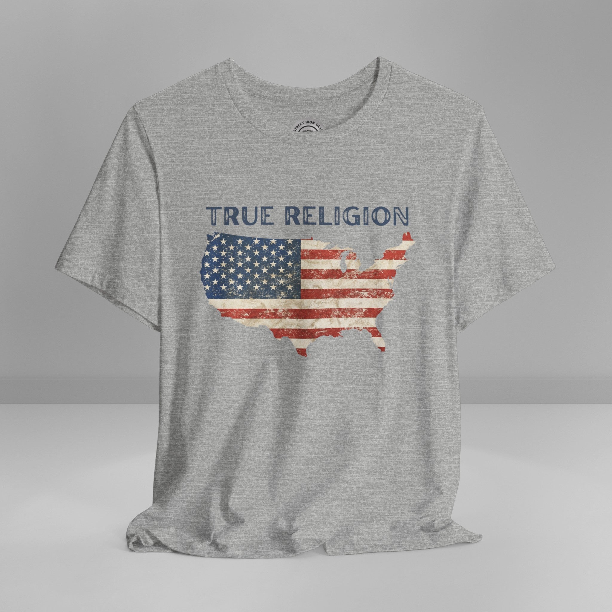 Show your unwavering support with our American Patriot T-shirt! This tee proudly features a grunge style American Flag in the shape of our country with the bold statement ''True Religion making this T-shirt a stylish choice for a true American patriot.