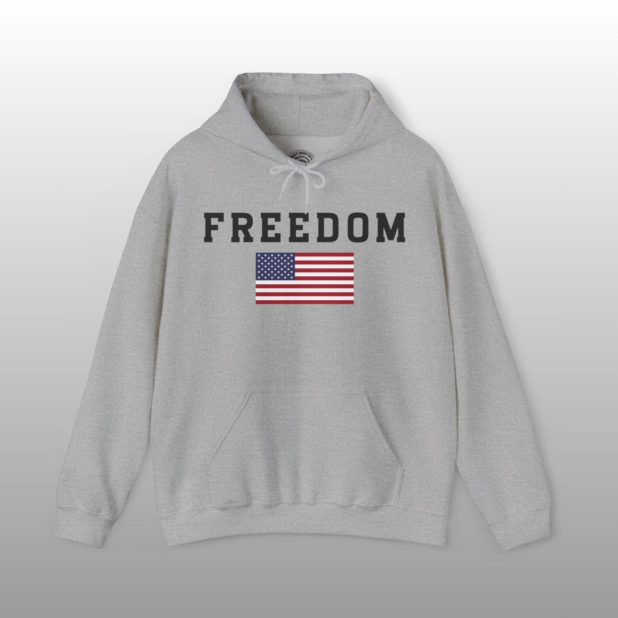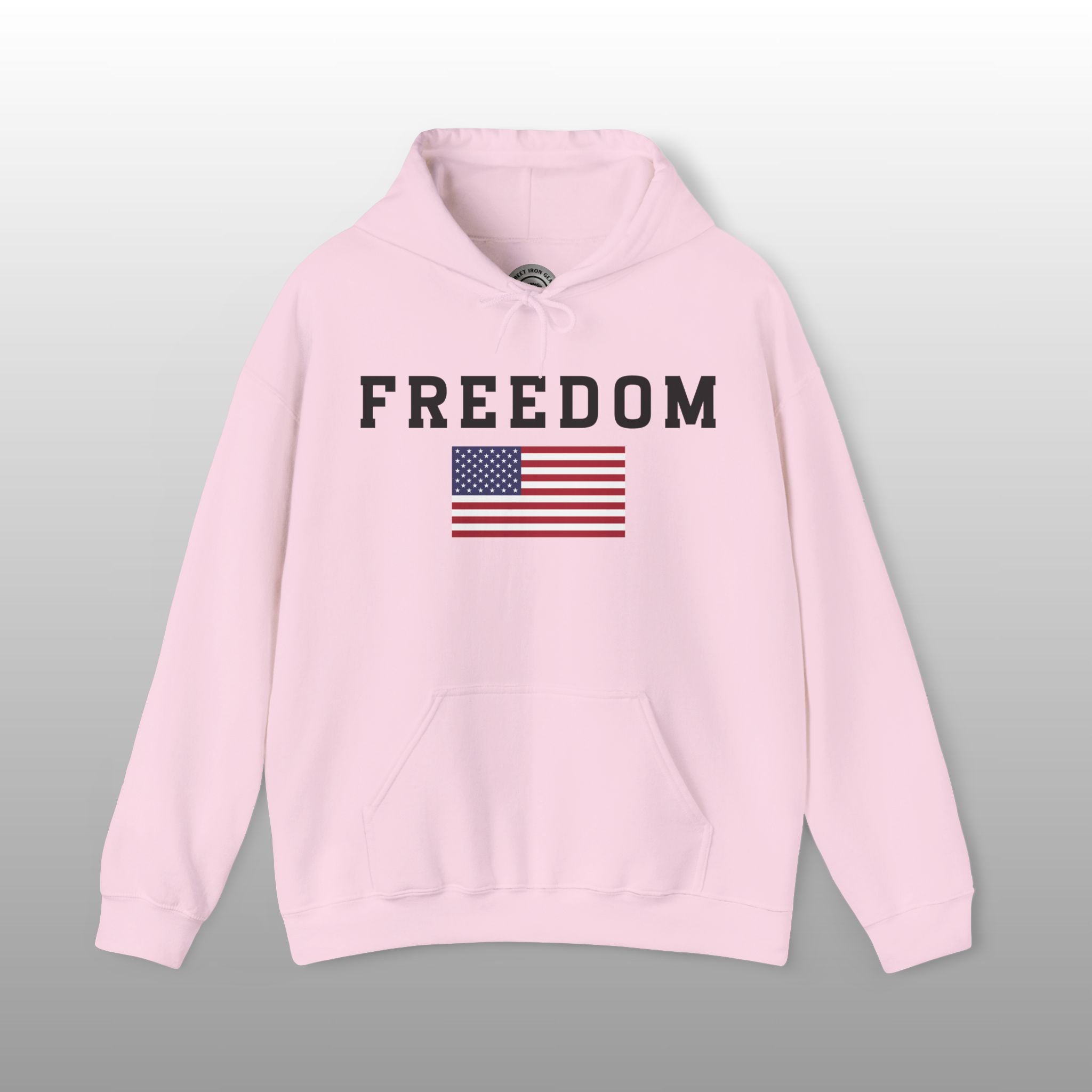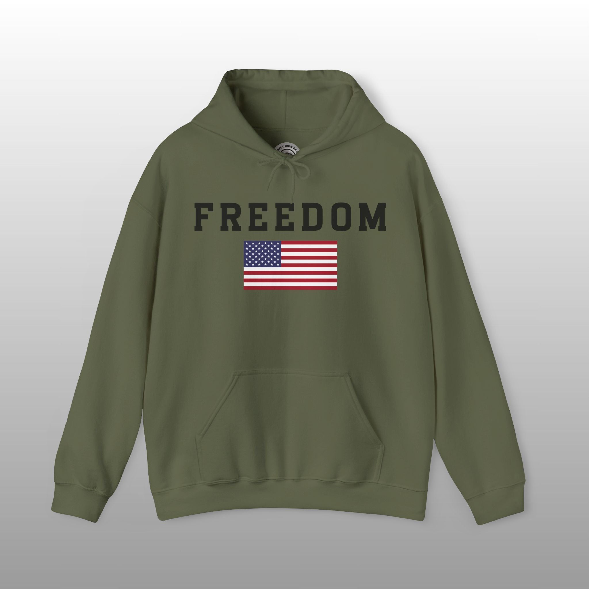 Show your deep American pride with this simple yet powerful hooded pullover sweatshirt, designed for those who value liberty above all else. This ultra-comfortable patriotic hoodie features the bold, unmistakable word "FREEDOM" spelled out in large block letters across the chest, with a classic representation of the US Flag centered right below it. Made from a warm, high-quality fleece, this pullover is perfect for layering on cooler days, celebrating national holidays like the Fourth of July and Veterans Day, or simply making a statement every day. It's an ideal unisex patriotic gift for men and women who are proud American patriots and want to wear their values on their sleeve, making it a highly searchable piece of USA apparel and pro-America clothing.
