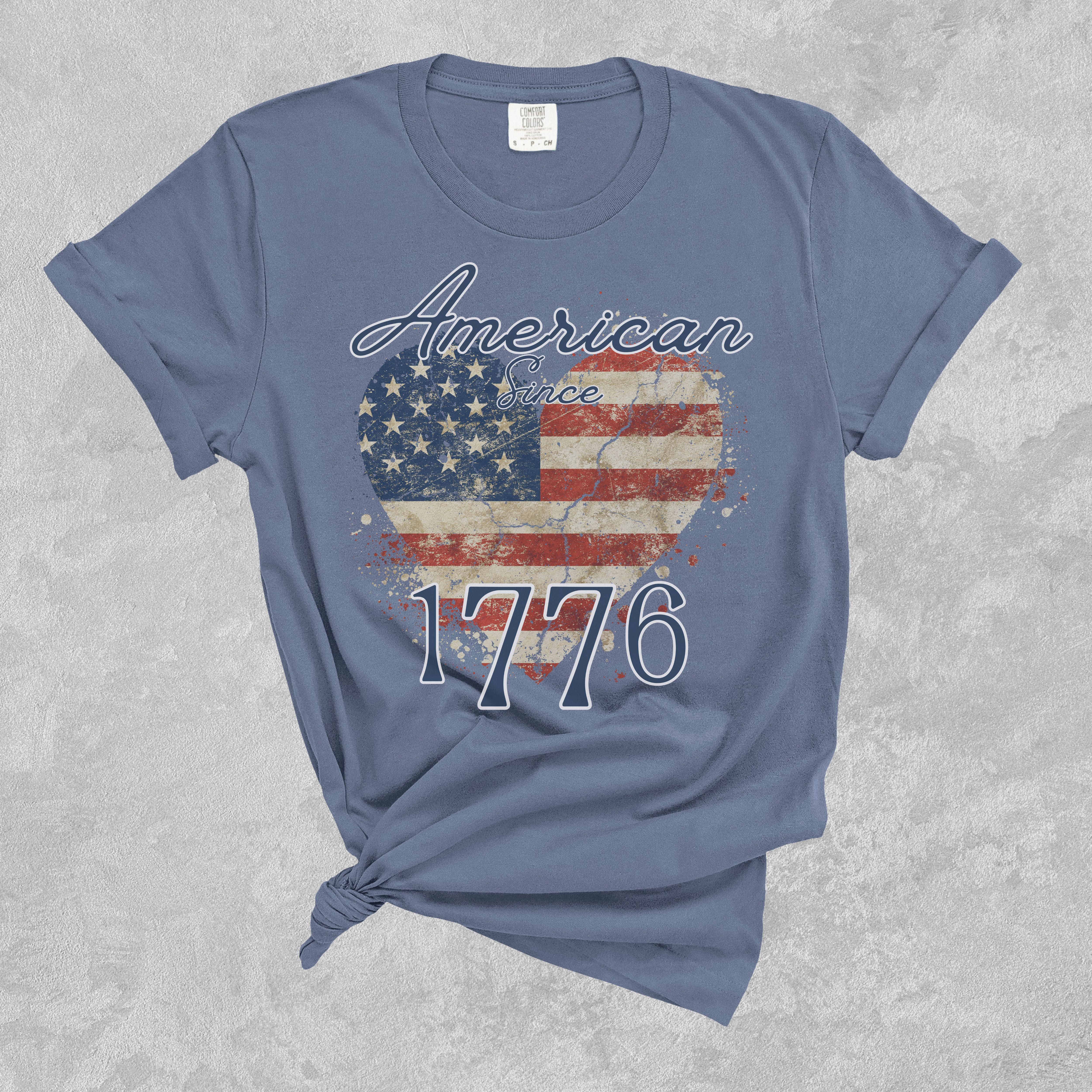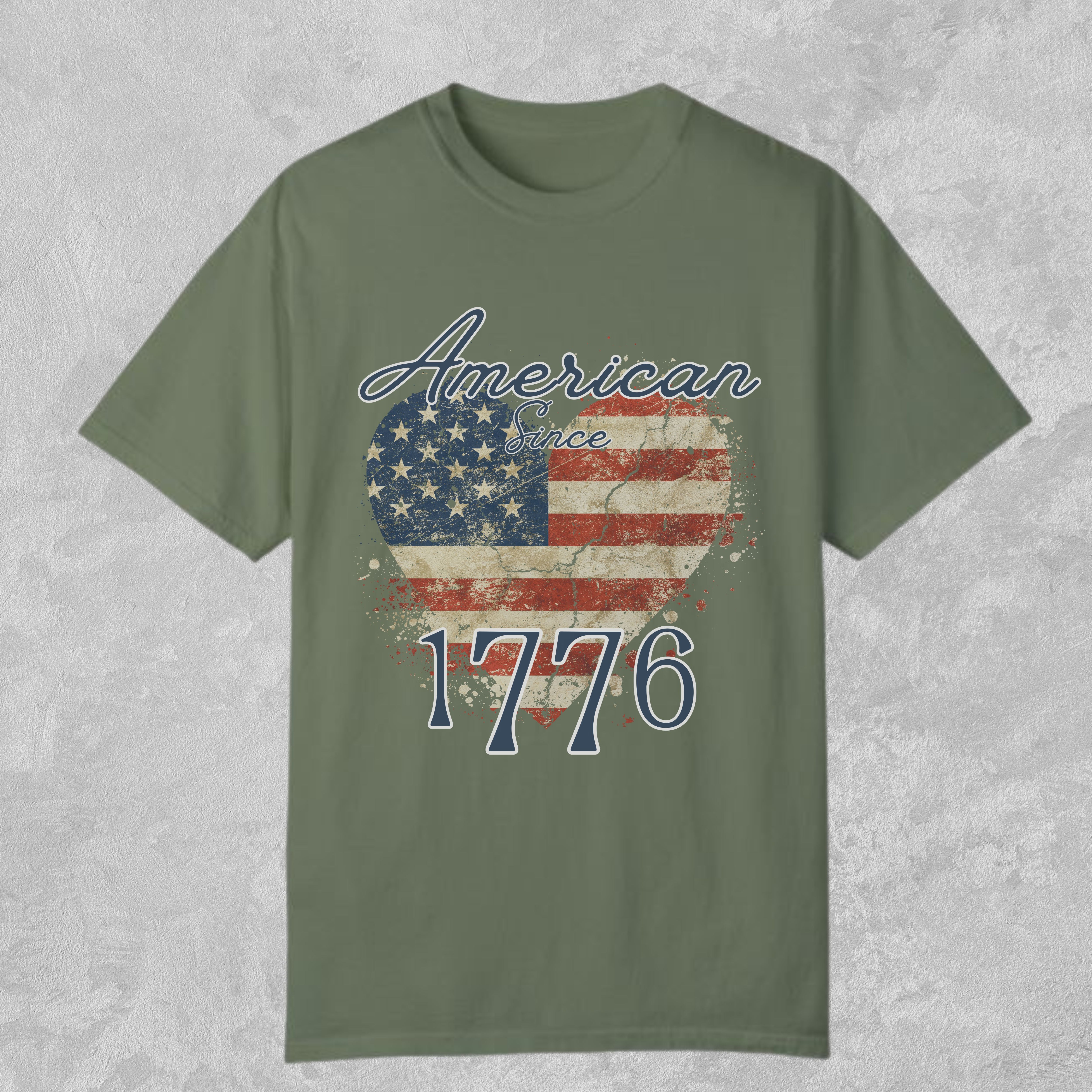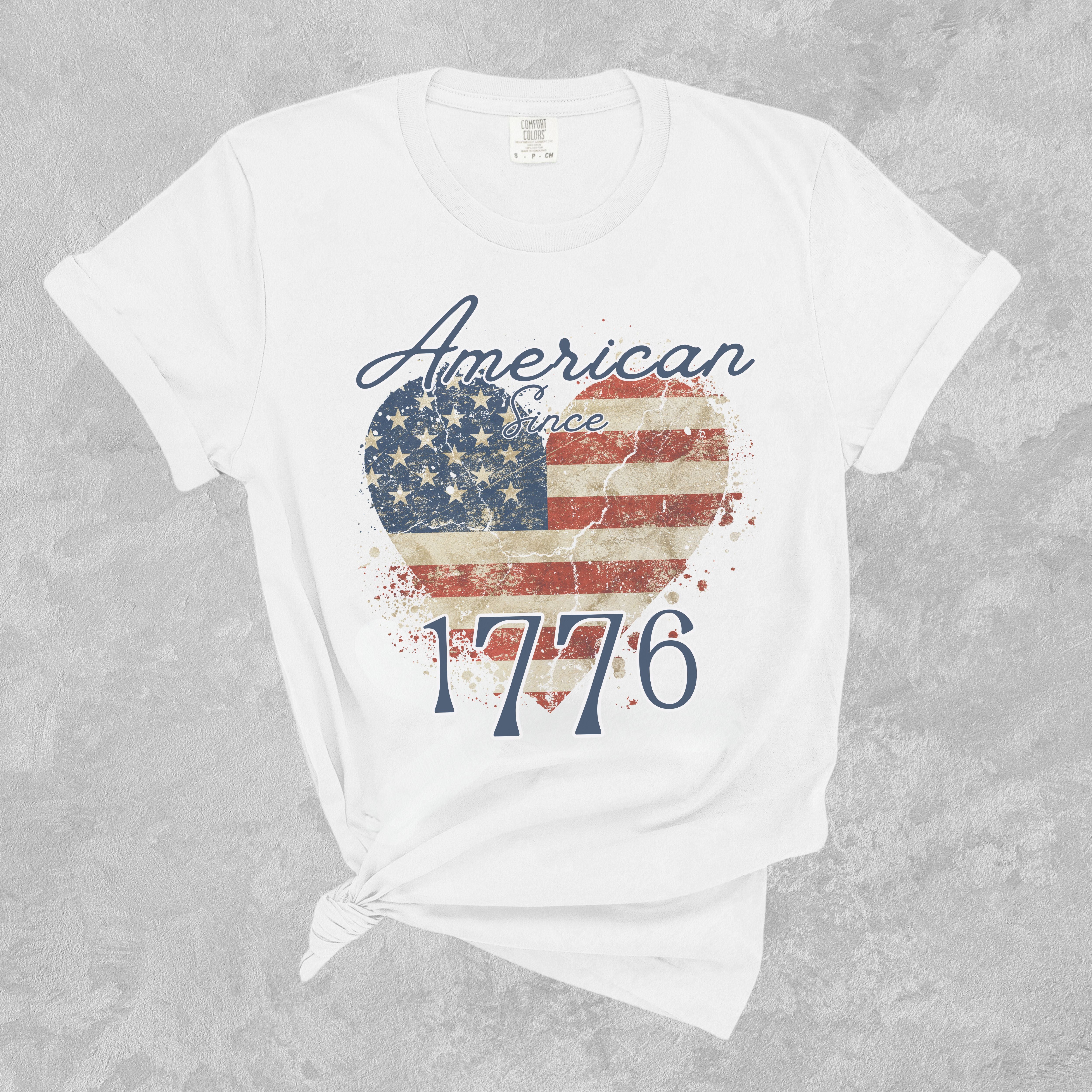 Embrace your American pride with this striking t-shirt, featuring a US Flag in the shape of a Heart at the center. The "American Since 1776" text adds a powerful statement to this patriotic design, making it a perfect choice for anyone looking to showcase their love and pride for their country.