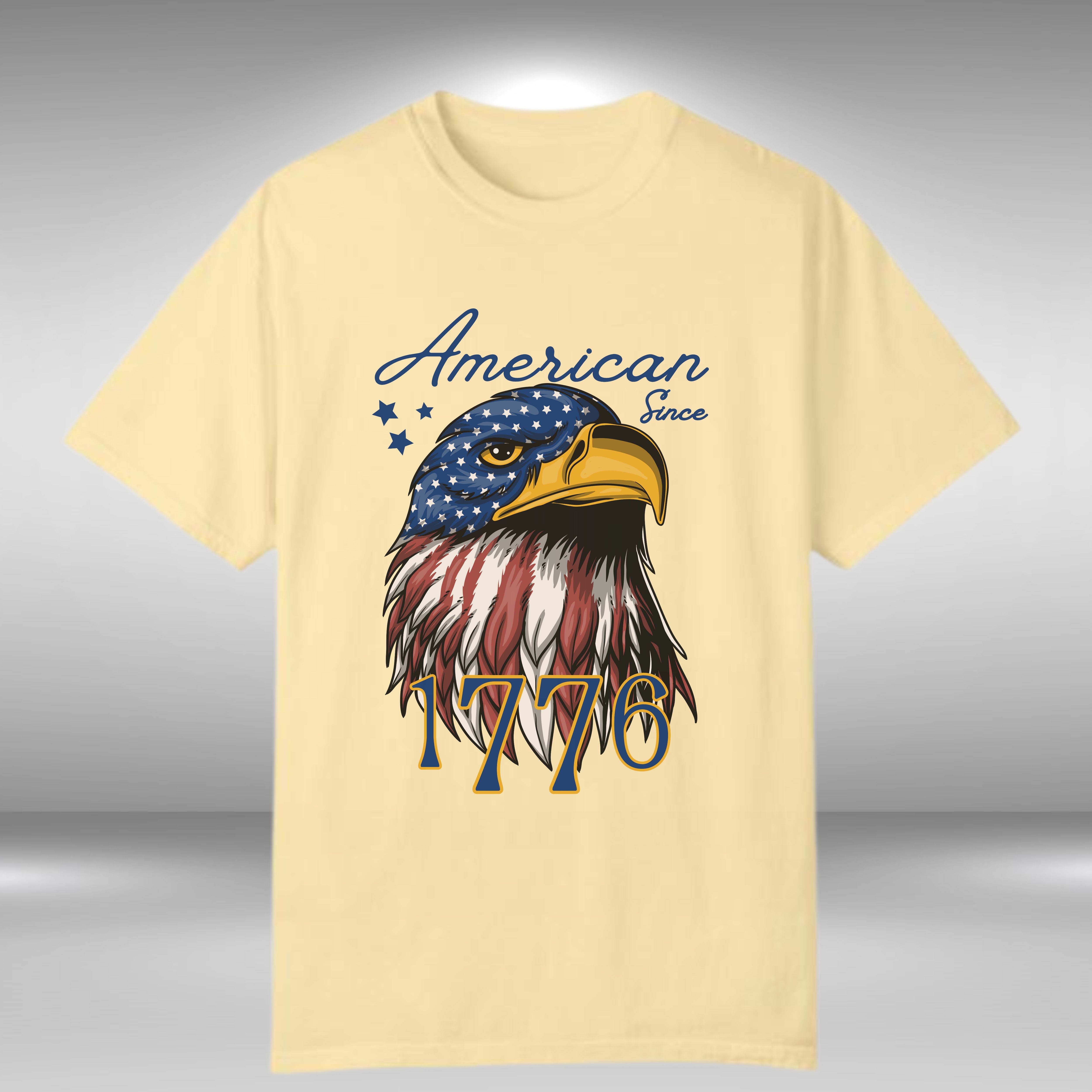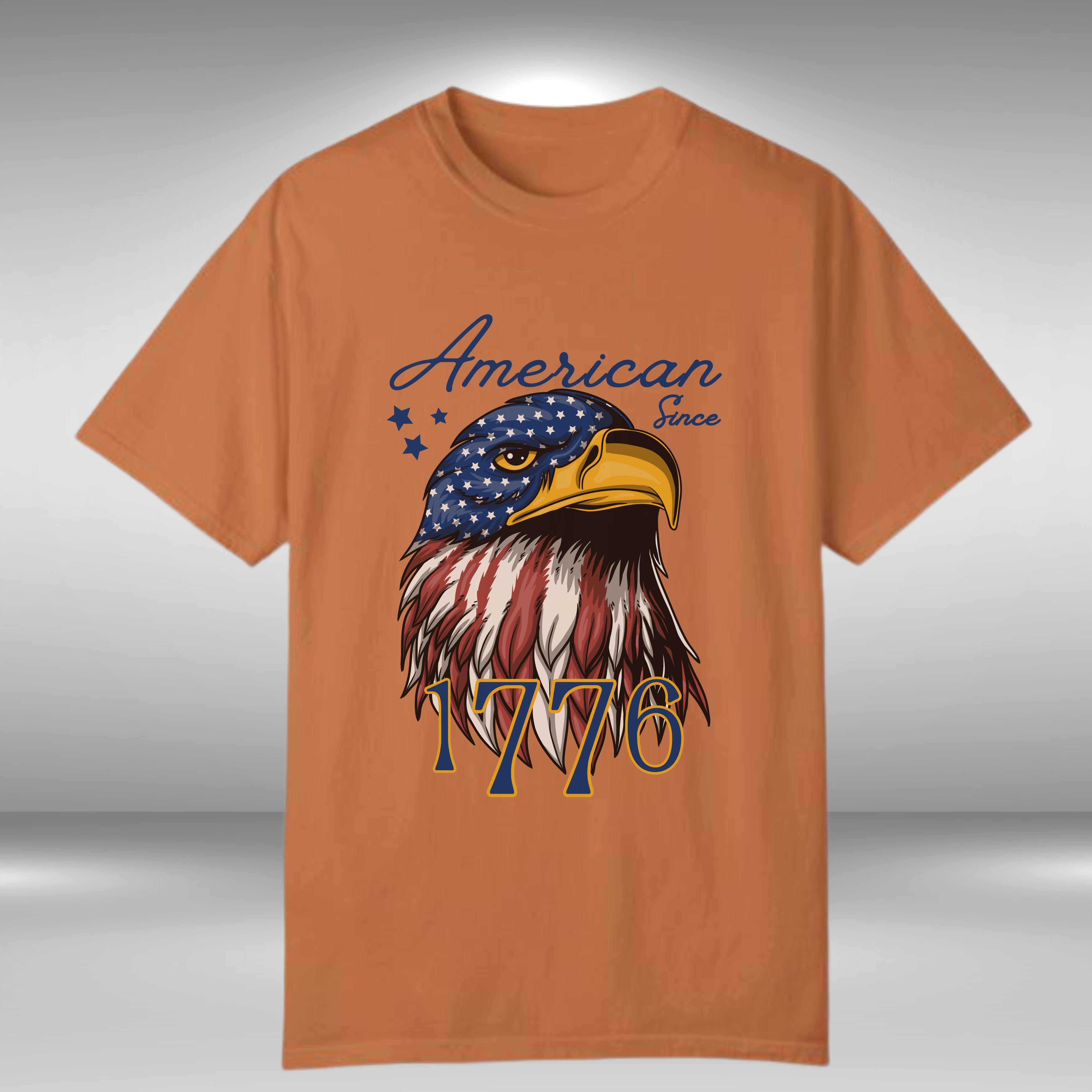 Embrace your American pride with this striking t-shirt, featuring a bold eagle head at the center set against a backdrop of the stars and stripes in vibrant red, white, and blue. The "American Since 1776" text adds a powerful statement to this patriotic design, making it a perfect choice for anyone looking to showcase their love and pride for their country.
