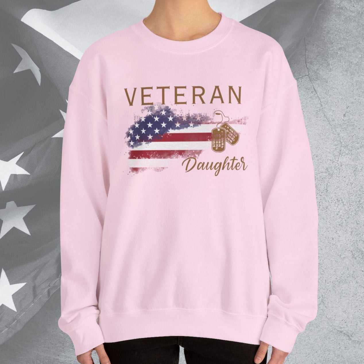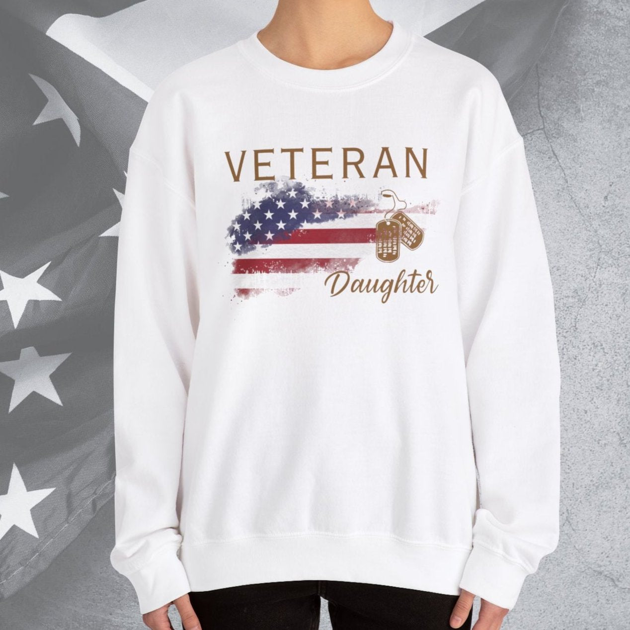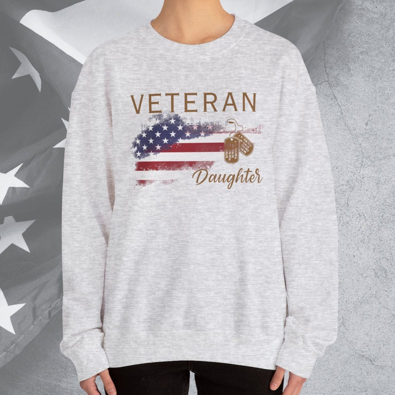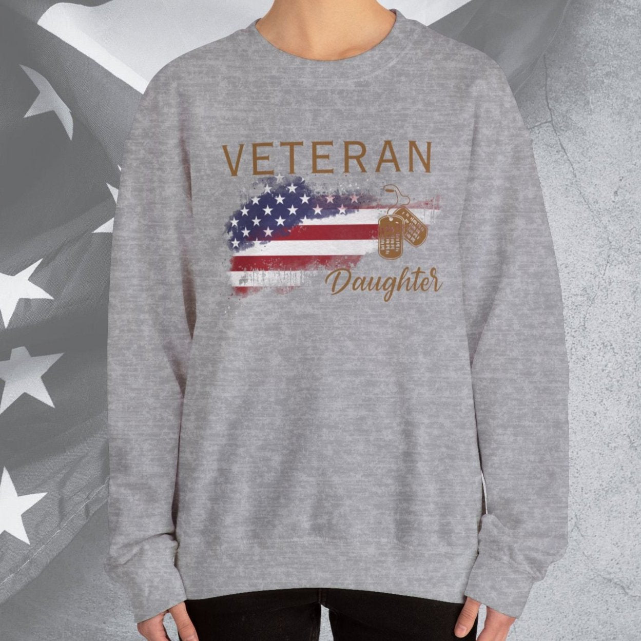 Honor your veteran heritage with our crew neck sweatshirt, featuring a large distressed American Flag and gold dog tags on a classic black background. The words "Veteran Daughter" are displayed in bold block and elegant script gold fonts above and below the flag, making it the perfect statement piece for those who proudly support a family member who served. This comfortable and stylish sweatshirt is ideal for everyday wear or special occasions, offering a meaningful way to show your patriotic pride.