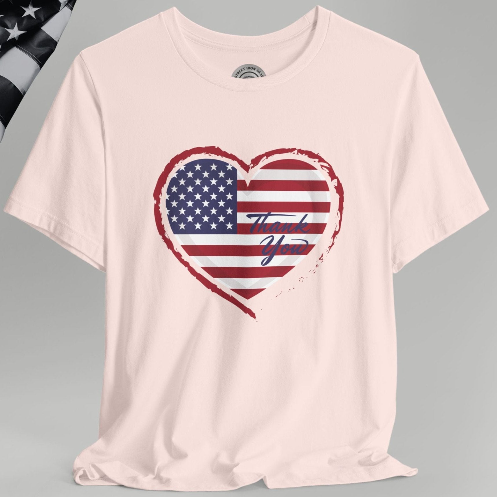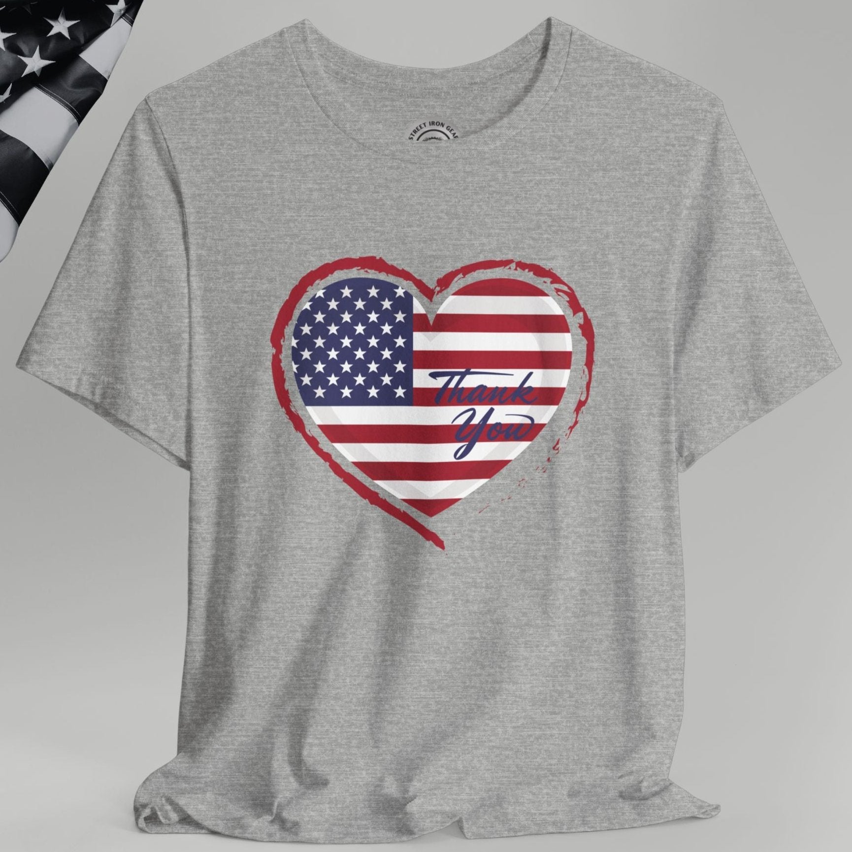 Show your gratitude with our American Veteran Day Crew Neck T-shirt, featuring a beautifully distressed American Flag in a heart shape with the words "Thank you" written in elegant script. This patriotic design is perfect for honoring veterans and showing your support in style. Made from soft, high-quality fabric, this t-shirt is comfortable and ideal for everyday wear or special events like Veterans Day. Whether you're looking for a unique gift or a way to display your American pride, this shirt is a perfect choice.