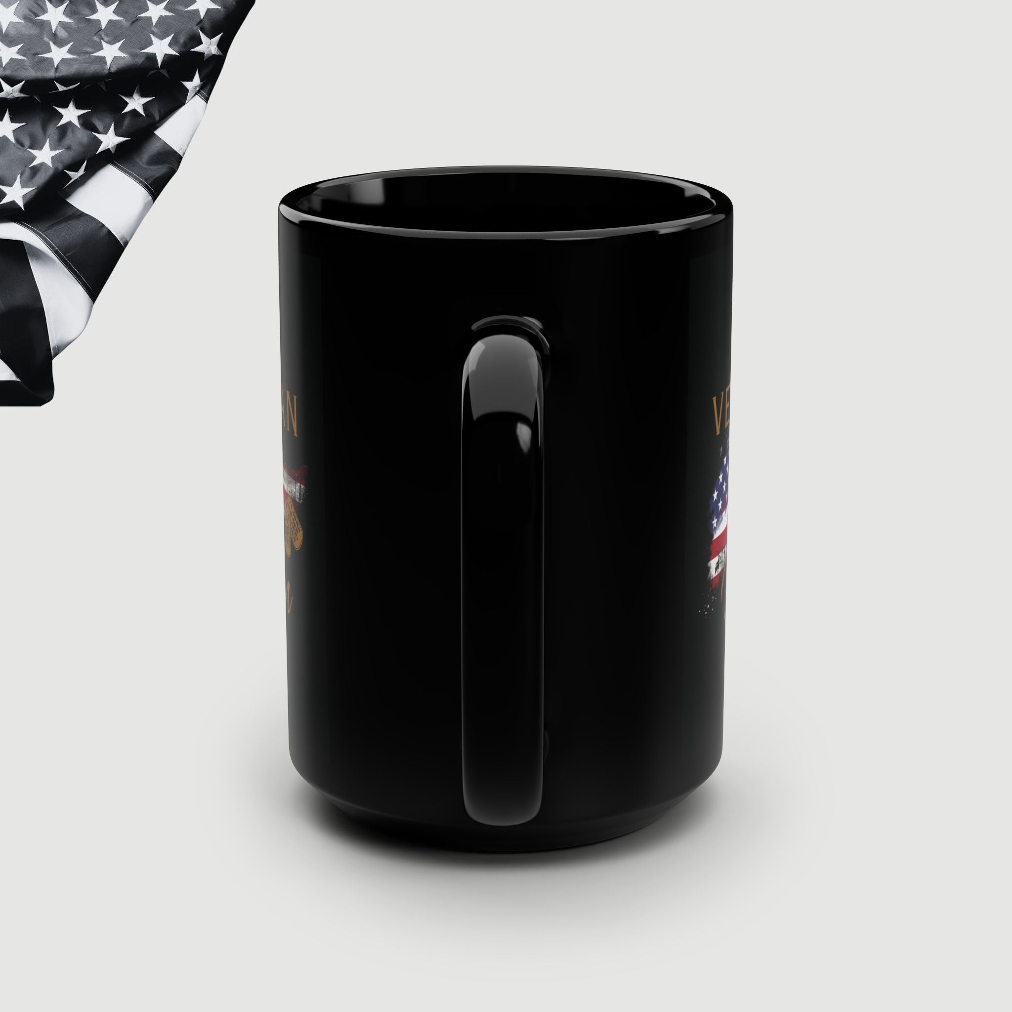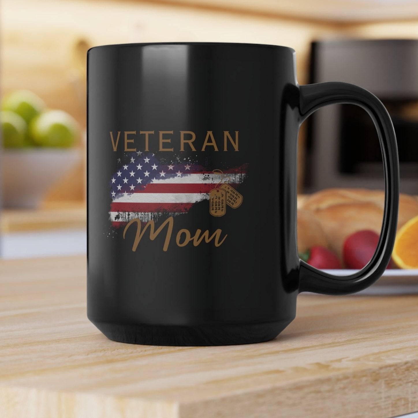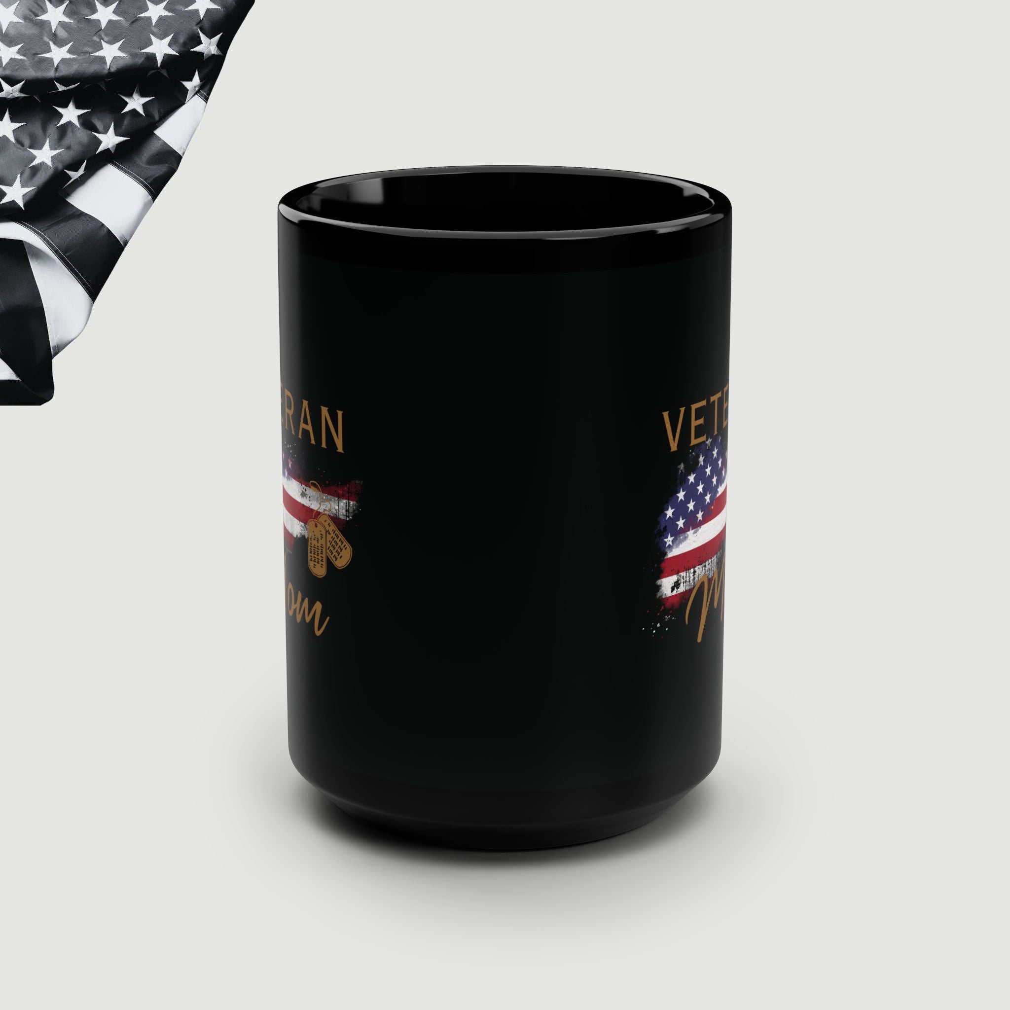 Celebrate your pride and patriotism with our American Veteran Mom 15 oz Black Coffee Mug. Featuring a bold distressed American Flag and gold dog tags on a black background, this mug showcases the words "Veteran Mom" in a stylish combination of block and script gold fonts. Perfect for military moms, this high-quality ceramic mug makes a thoughtful gift or a daily reminder of service and strength.