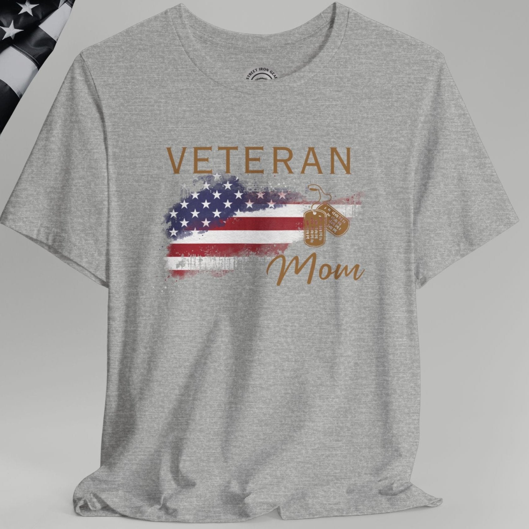 Proudly honor your veteran with our "Mom of American Veteran" Crew Neck T-Shirt, featuring a beautifully distressed American Flag and a set of gold dog tags. The bold "Veteran" in gold block font above the flag and "Mom" in elegant gold script below creates a stunning tribute to your loved one's service. Perfect for patriotic moms, this comfortable and stylish tee is a must-have for showing your support at home, events, or casual outings.