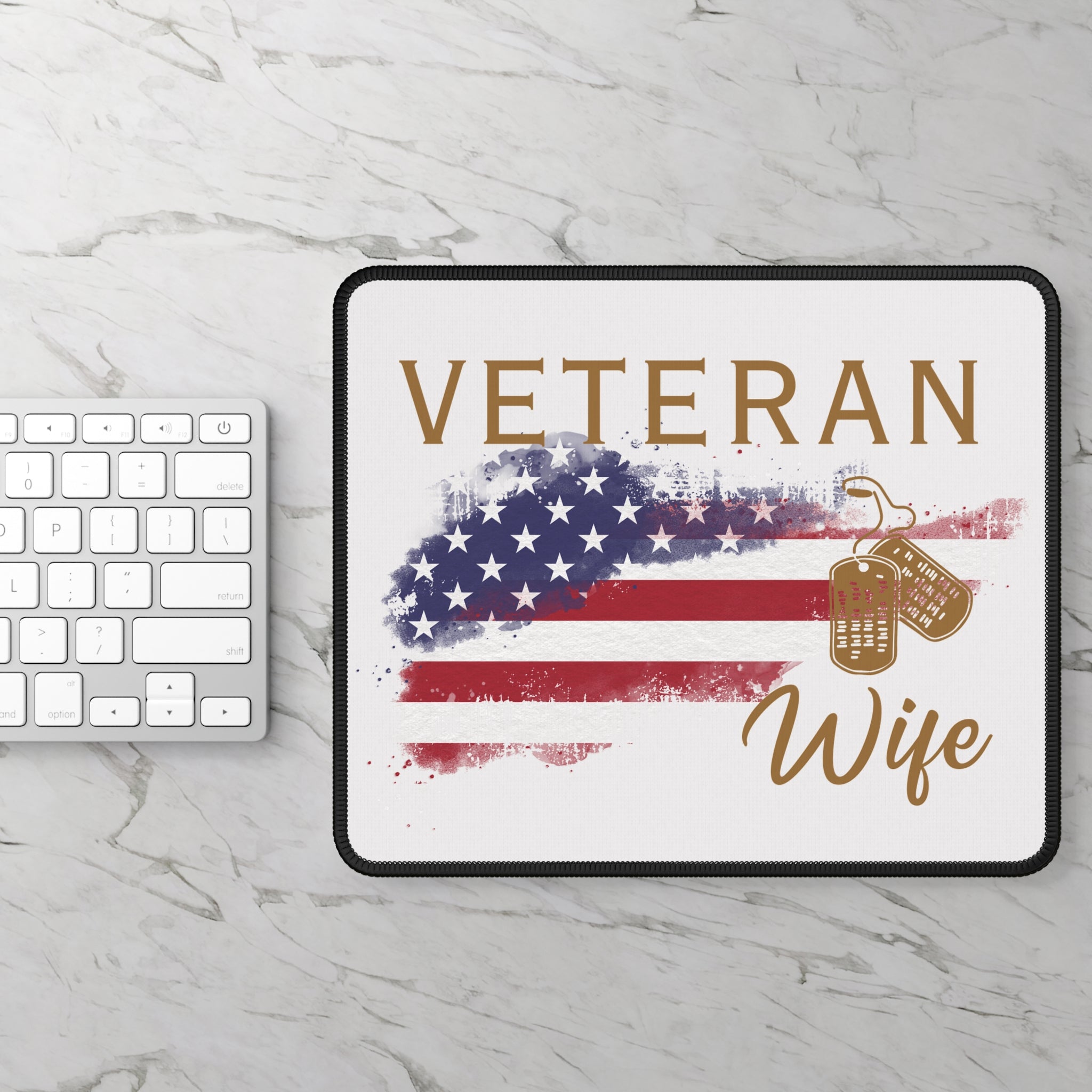 Honor the proud veteran in your life with our American Veteran Themed Mouse Pad, featuring the phrase "Veteran Wife" in bold gold block and script font over a distressed American flag background. This high-quality mouse pad combines patriotic style with functionality, making it the perfect accessory for home or office. Ideal as a thoughtful gift for military families, veterans' wives, or anyone who supports our troops, this durable mouse pad adds a touch of American pride to your workspace.