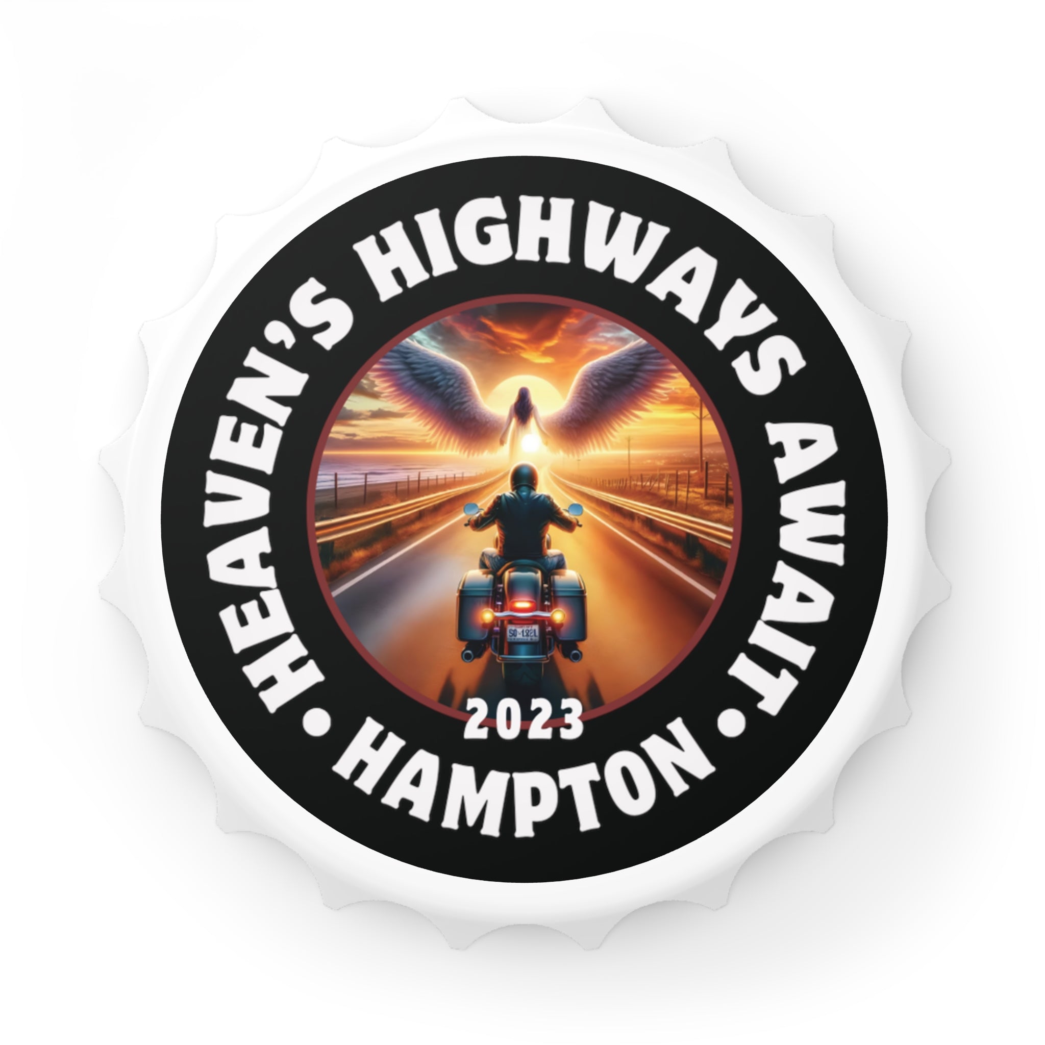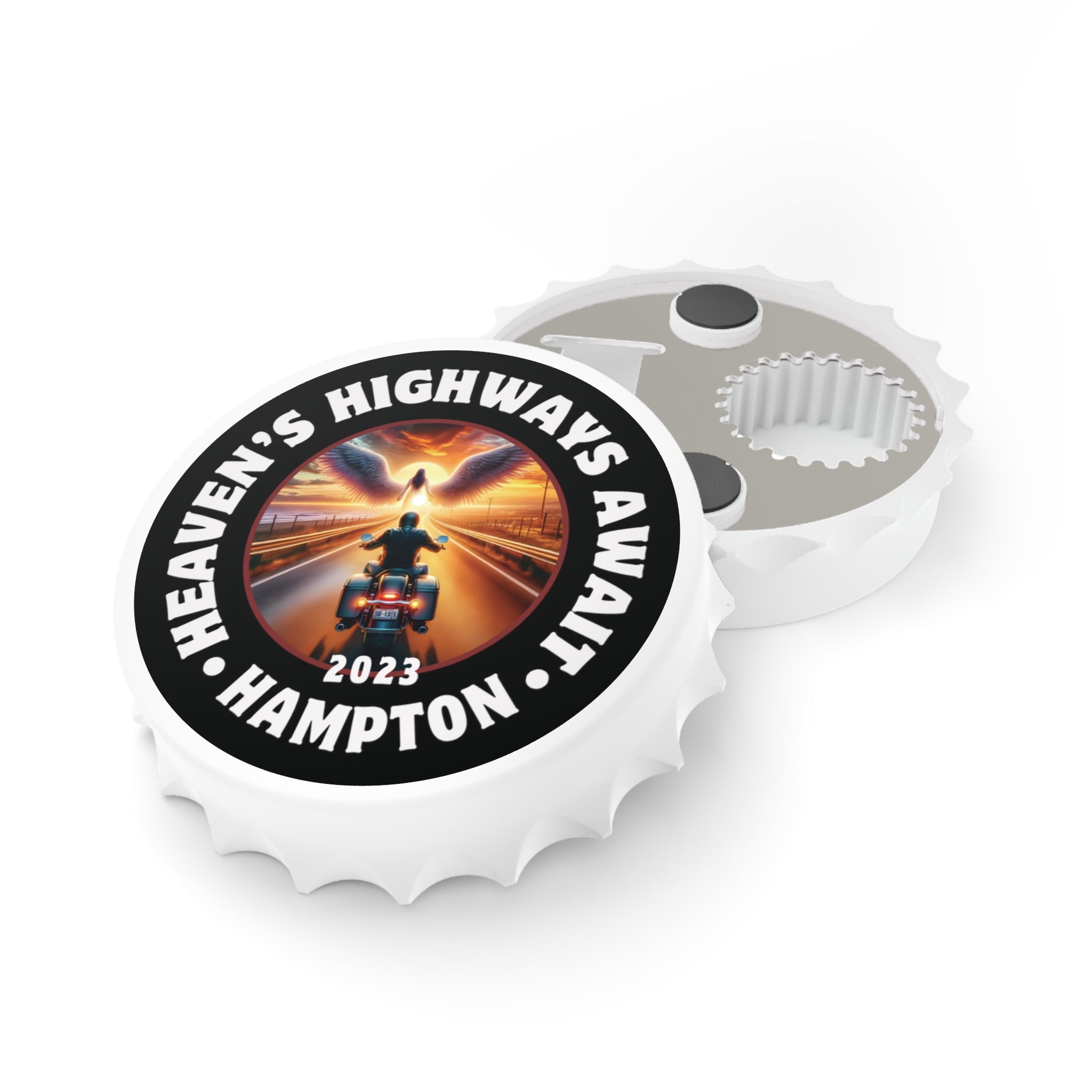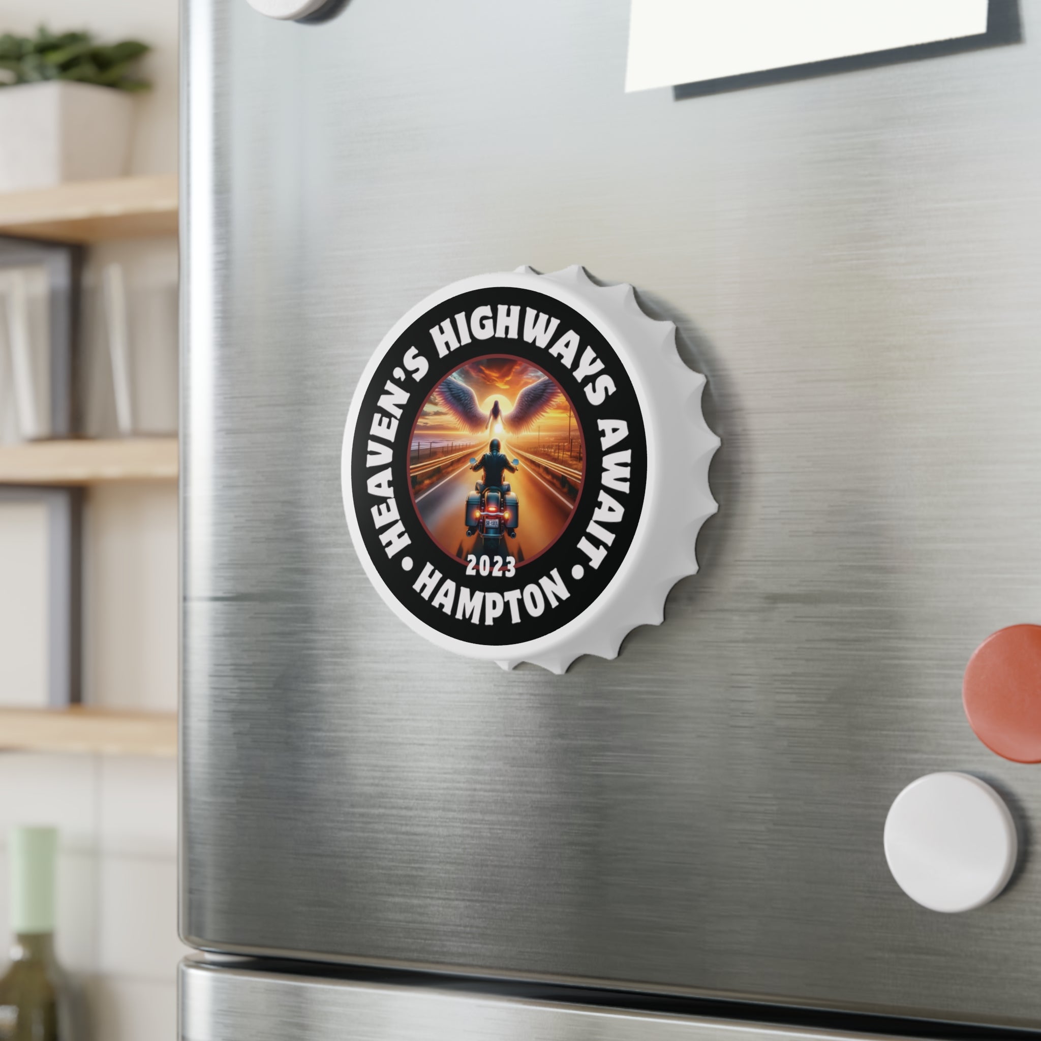 This custom-designed magnetic bottle opener, perfect for biker memorials or poker run events, showcasing a biker riding his cruiser into the sunset towards an angel, symbolizing freedom and remembrance. It offers personalization with areas for a bespoke quote, the recipients' names, and an important date, making each piece a unique and meaningful tribute. Ideal for motorcycle clubs aiming to resell at large gatherings, this magnetic bottle opener serves as a significant fundraising item, providing a way to support impacted families while commemorating the spirit of the ride and the bonds within the biker community.