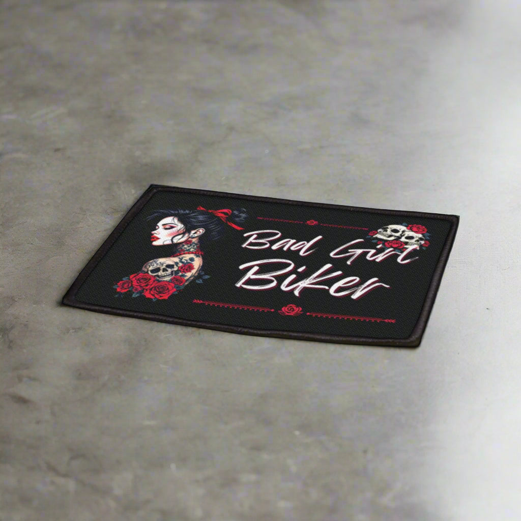 Add bold attitude to your gear with our Bad Girl Biker Printed Patch, featuring a fierce tattooed girl surrounded by skulls and roses. Designed in striking black, gray, red, and white tones, this ladies biker patch is perfect for customizing jackets, vests, backpacks, or saddlebags. Made for strong women who ride with pride, this motorcycle patch for women is a must-have for expressing your rebel spirit and biker lifestyle. A great gift idea for lady riders, biker babes, and anyone who loves edgy, badass biker style!
