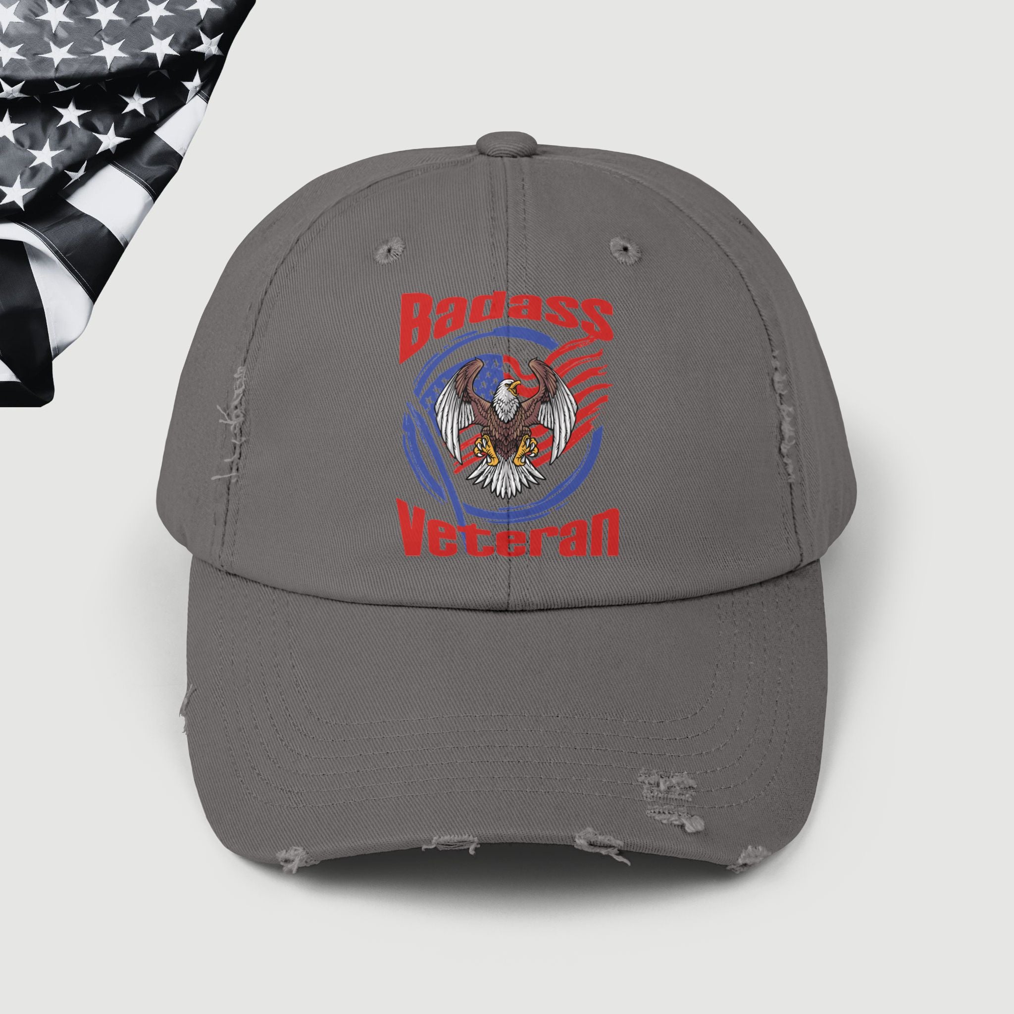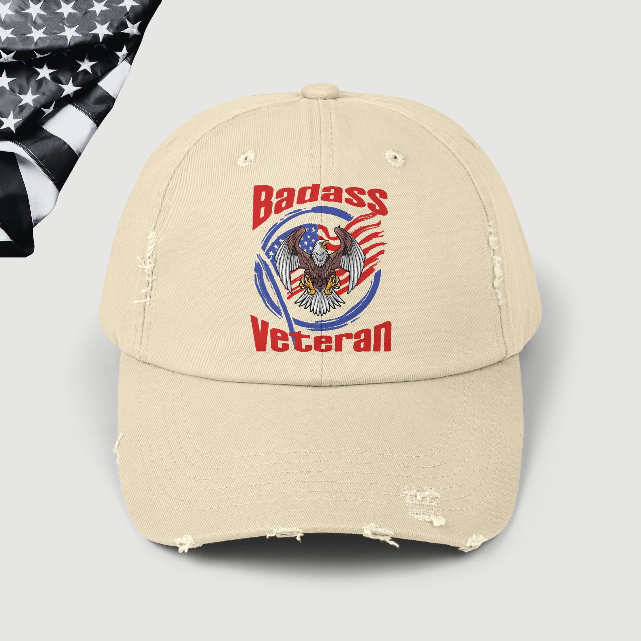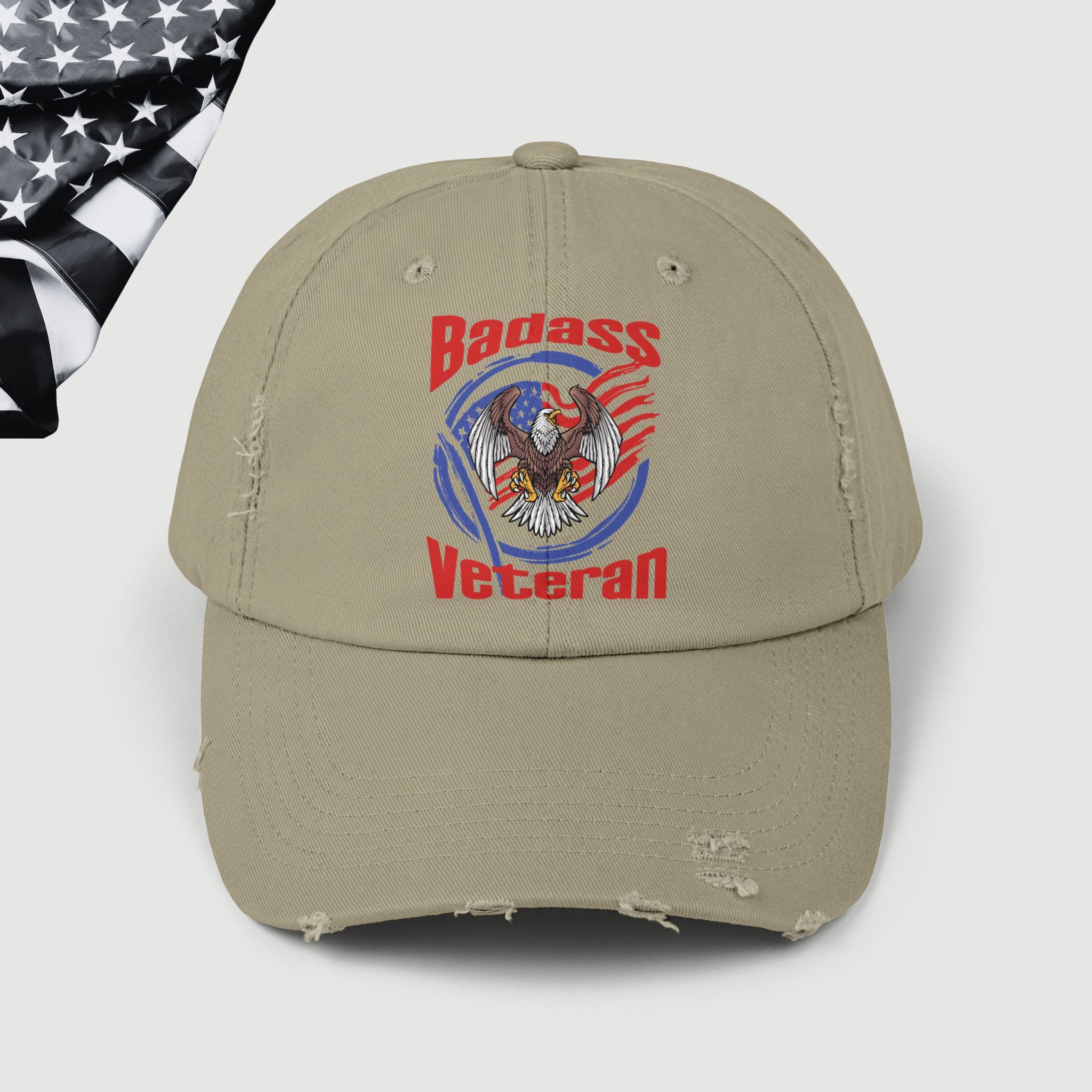 Show your pride with our American Veteran Distressed Dad Hat, featuring a bold design of a large distressed American Flag in a circle shape with a striking American Eagle on a black background. The words "Badass Veteran" are displayed in curved red font above and below the flag, making a statement for any proud veteran. Available in several colors, this comfortable and durable hat is perfect for casual wear, patriotic events, or as a thoughtful gift for military veterans.