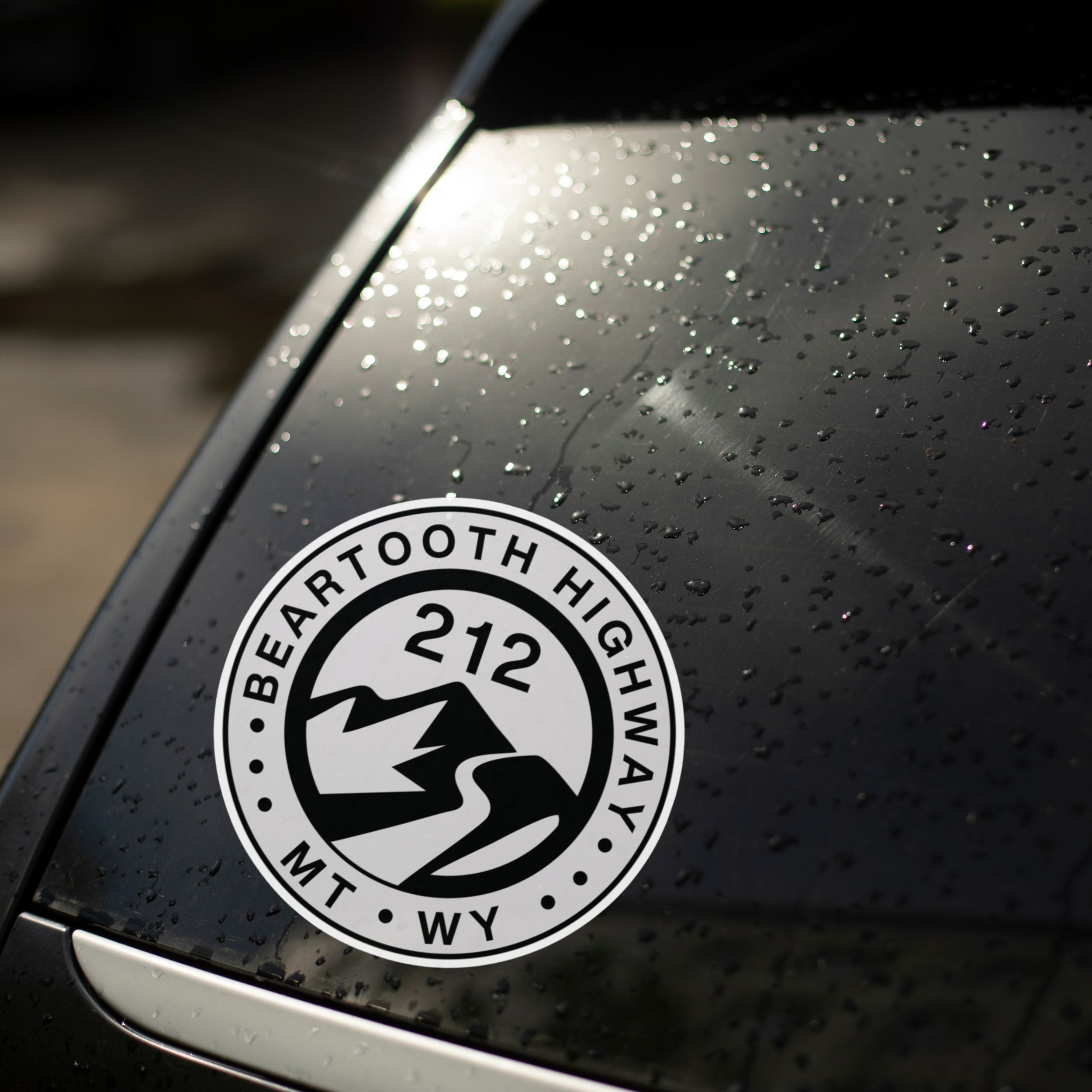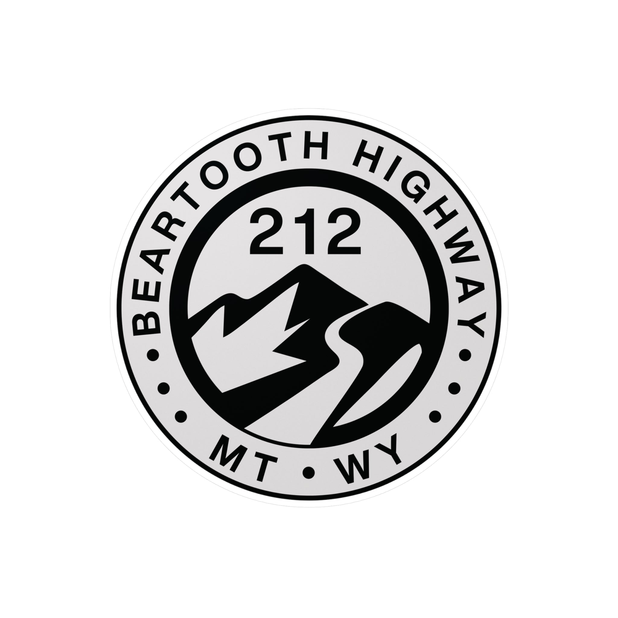 Commemorate your epic ride or scenic adventure on the Beartooth Highway with this durable, weather-resistant vinyl decal. This striking circular design features a mountain graphic and the iconic route number 212 in the center, with the name of the pass and the state abbreviations, MT and WY, encircling the design. The black and gray print is set against a crisp white border, making it pop on any surface. Perfect for indoor or outdoor use, this die-cut sticker is ideal for personalizing motorcycle cases, helmets, car windows, laptops, mobile phones, or water bottles. It's a great souvenir or gift for any road trip enthusiast and adventurer.