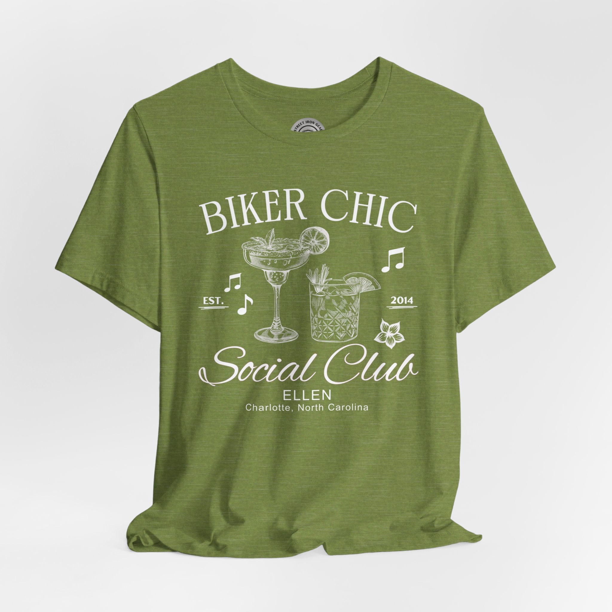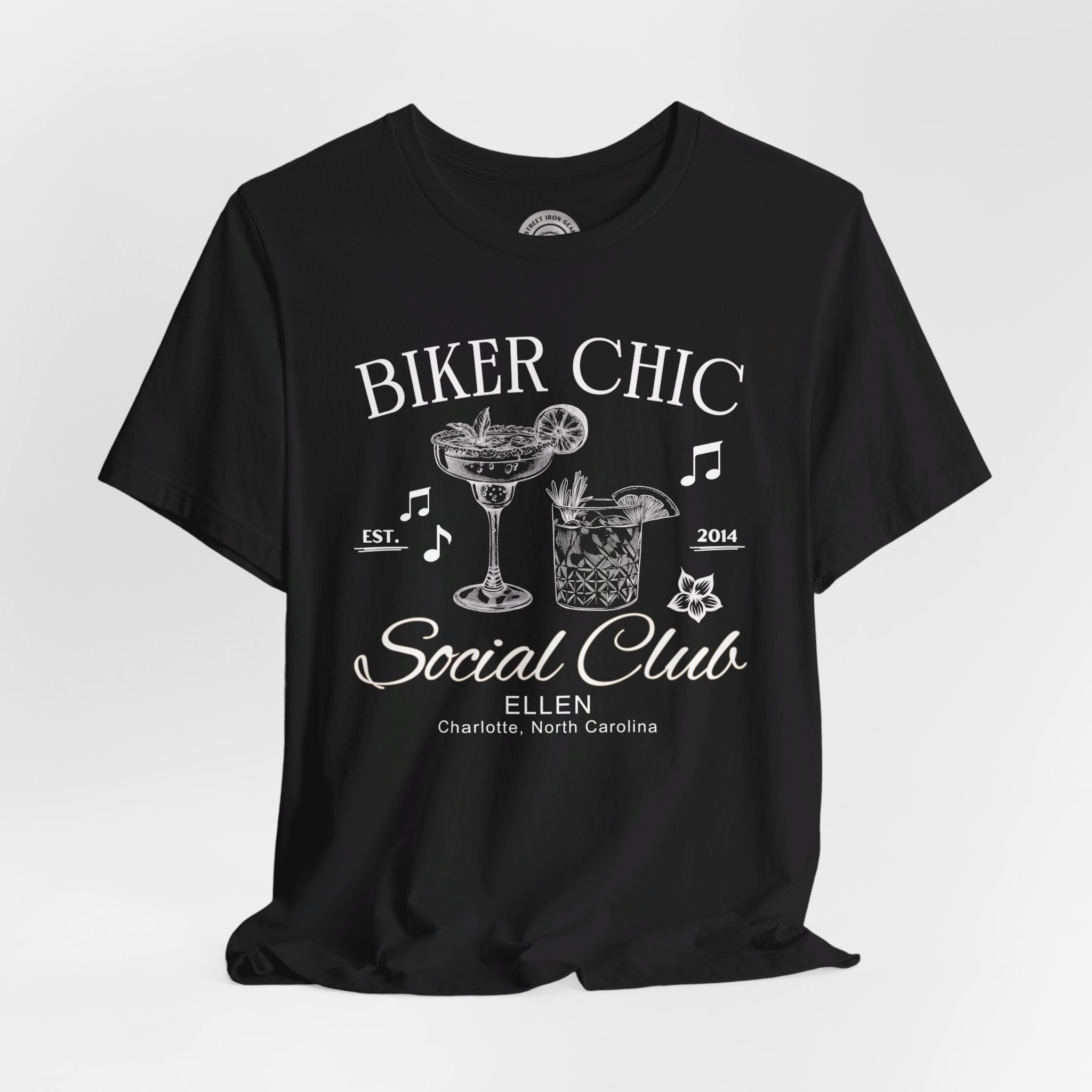 Elevate your ride with our customizable Biker Chic T-shirt, featuring elegant line drawings of fancy cocktails musical notes. Perfect for individual riders or local woman's motorcycle groups, you can personalize it with your name and location to make it uniquely yours. Celebrate your love for the open road in style with this exclusive design from StreetIronGear.com!