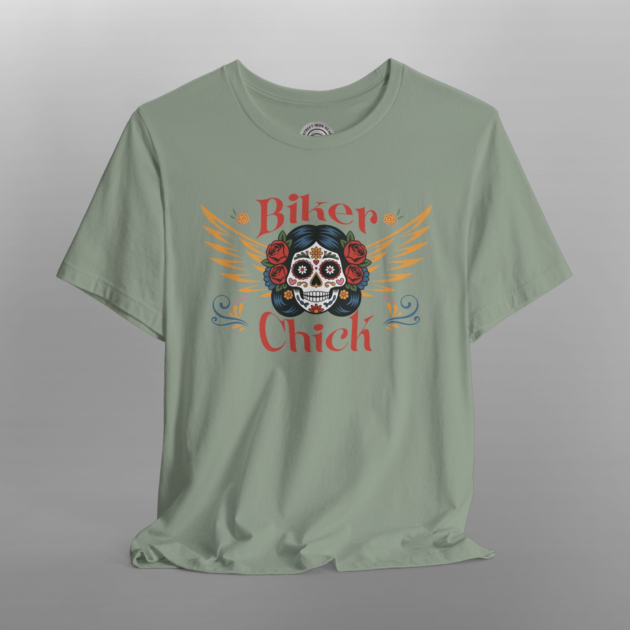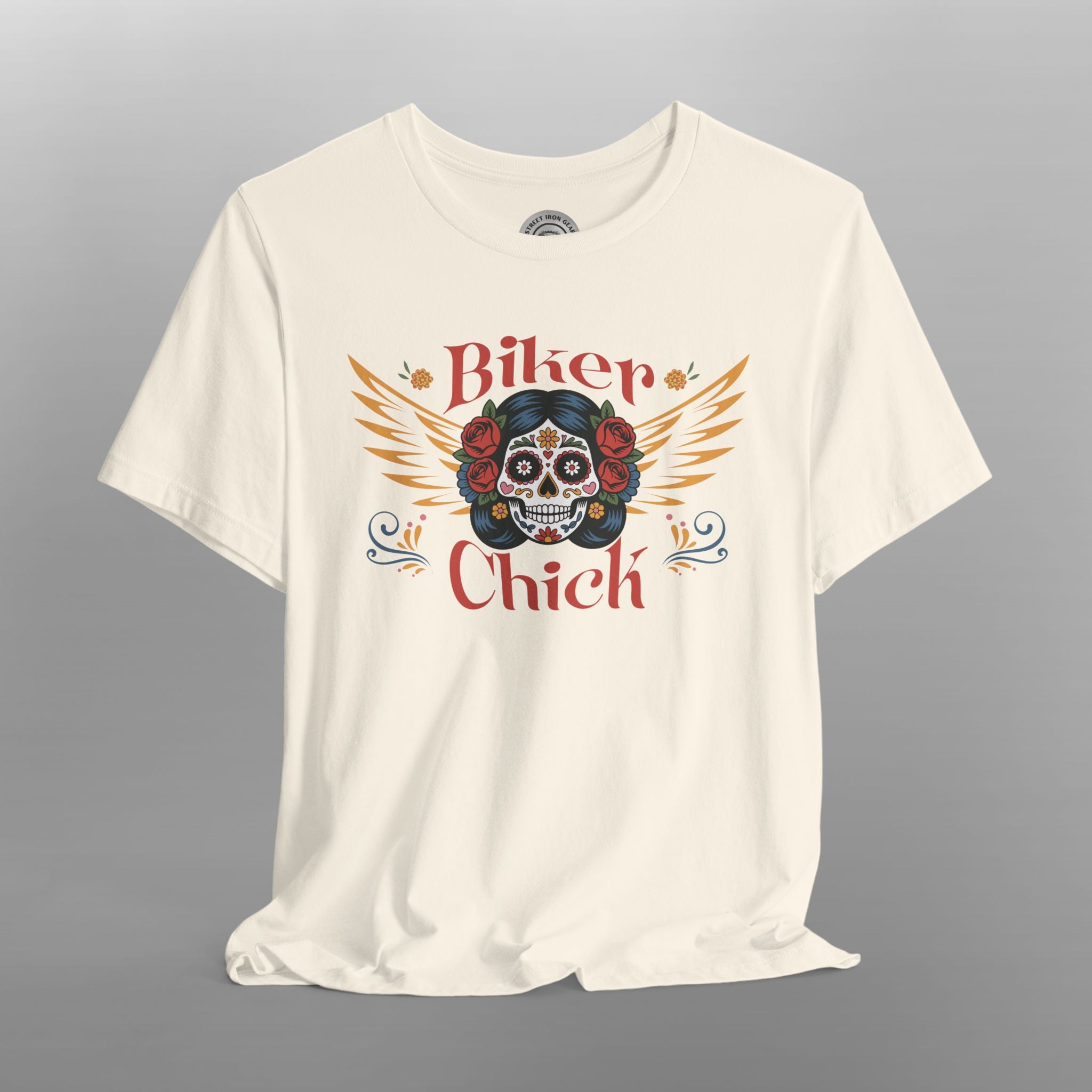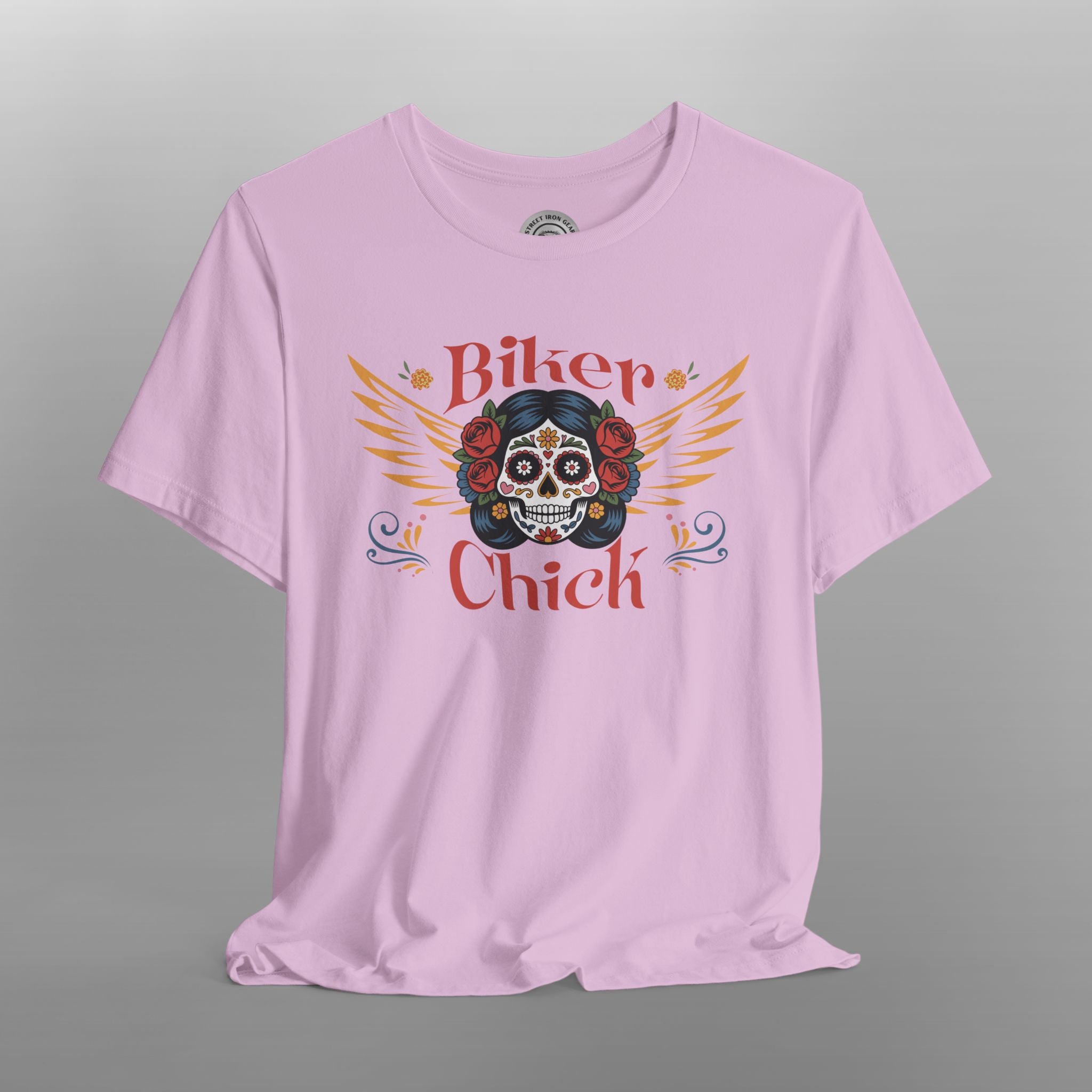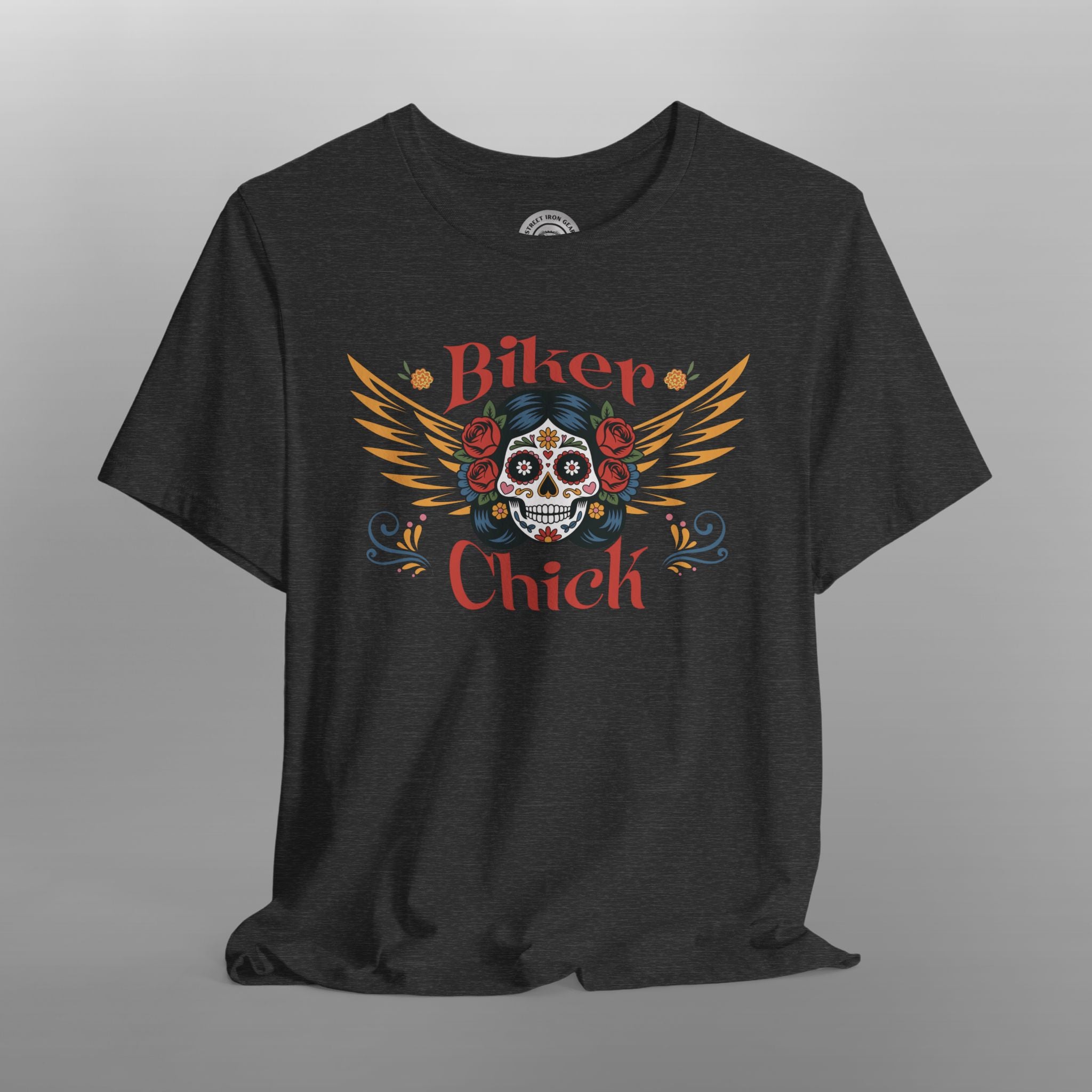 This comfortable ladies' tee is perfect for any woman who loves to ride. Our unique "Biker Chick" t-shirt features a vibrant graphic of a stylized skull with beautiful, intricate details, surrounded by striking wing-like elements. The phrase "Biker Chick" is displayed in a fun, flowing script, adding to the shirt's edgy yet feminine charm. Made for comfort and style, this long-sleeve shirt is a fantastic way to show off your passion for the open road. It makes an excellent gift for any female rider, whether she owns a cruiser or a sportbike. This shirt is ideal for motorcycle rallies, casual hangouts, or everyday wear, capturing the spirit of the modern biker babe. With its bold design and soft fabric, it’s a great addition to any motorcycle enthusiast’s wardrobe.
