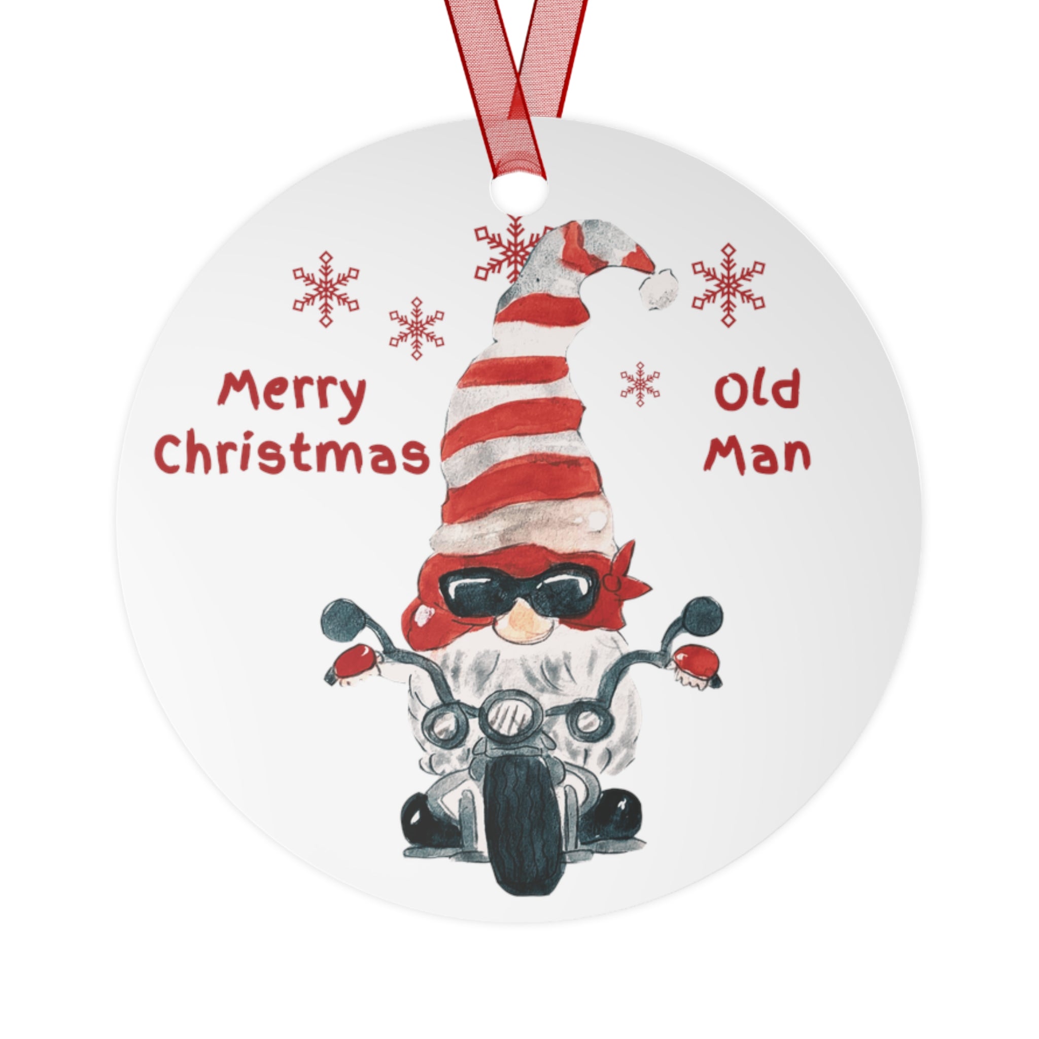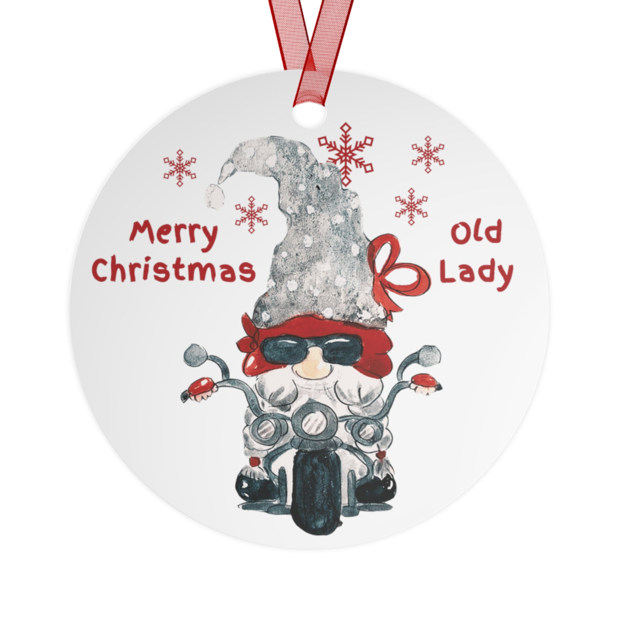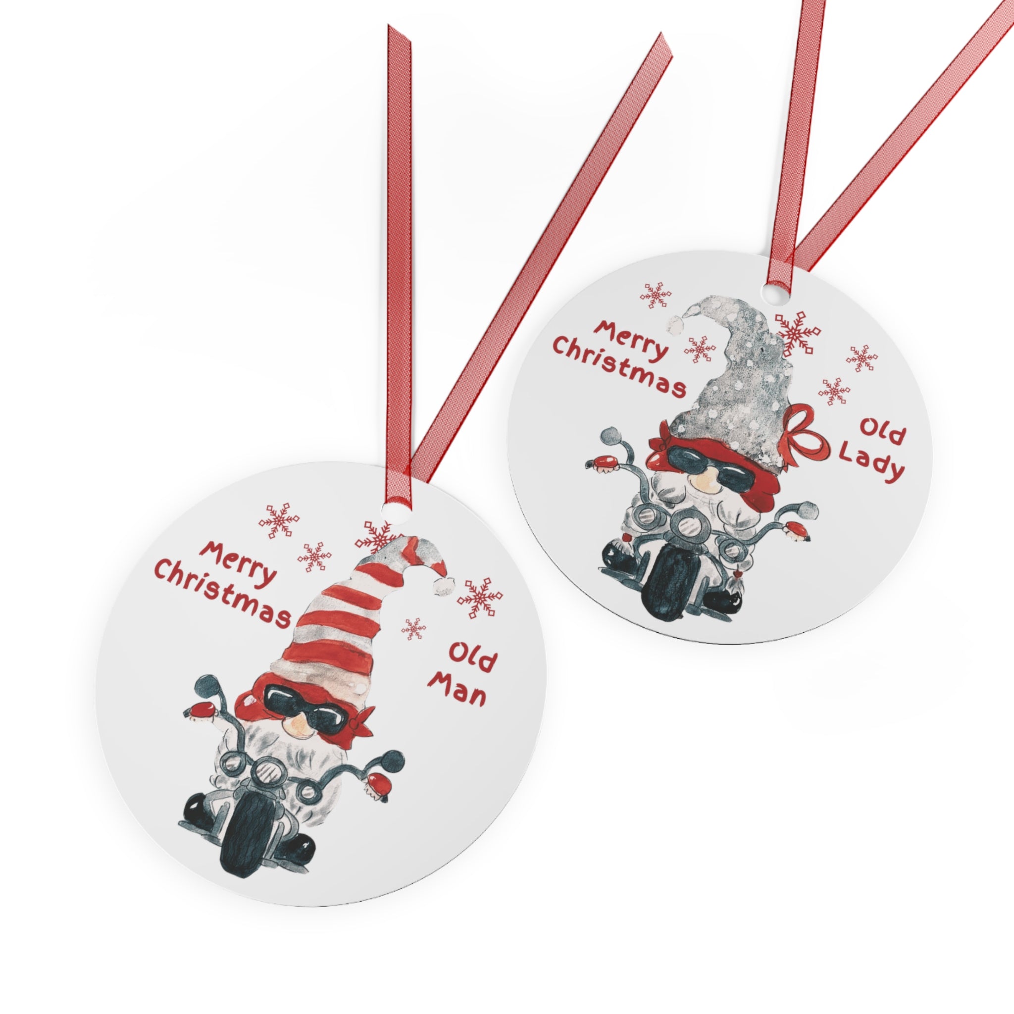 Celebrate your biker love with our Biker Couple Christmas Ornament! This whimsical decoration features a gnome man riding a motorcycle on one side, wishing "Merry Christmas Old Man," and a gnome woman on the other side, cruising on her bike with a greeting that reads "Merry Christmas Old Lady." It's the perfect way to add a touch of humor and personality to your holiday decor.