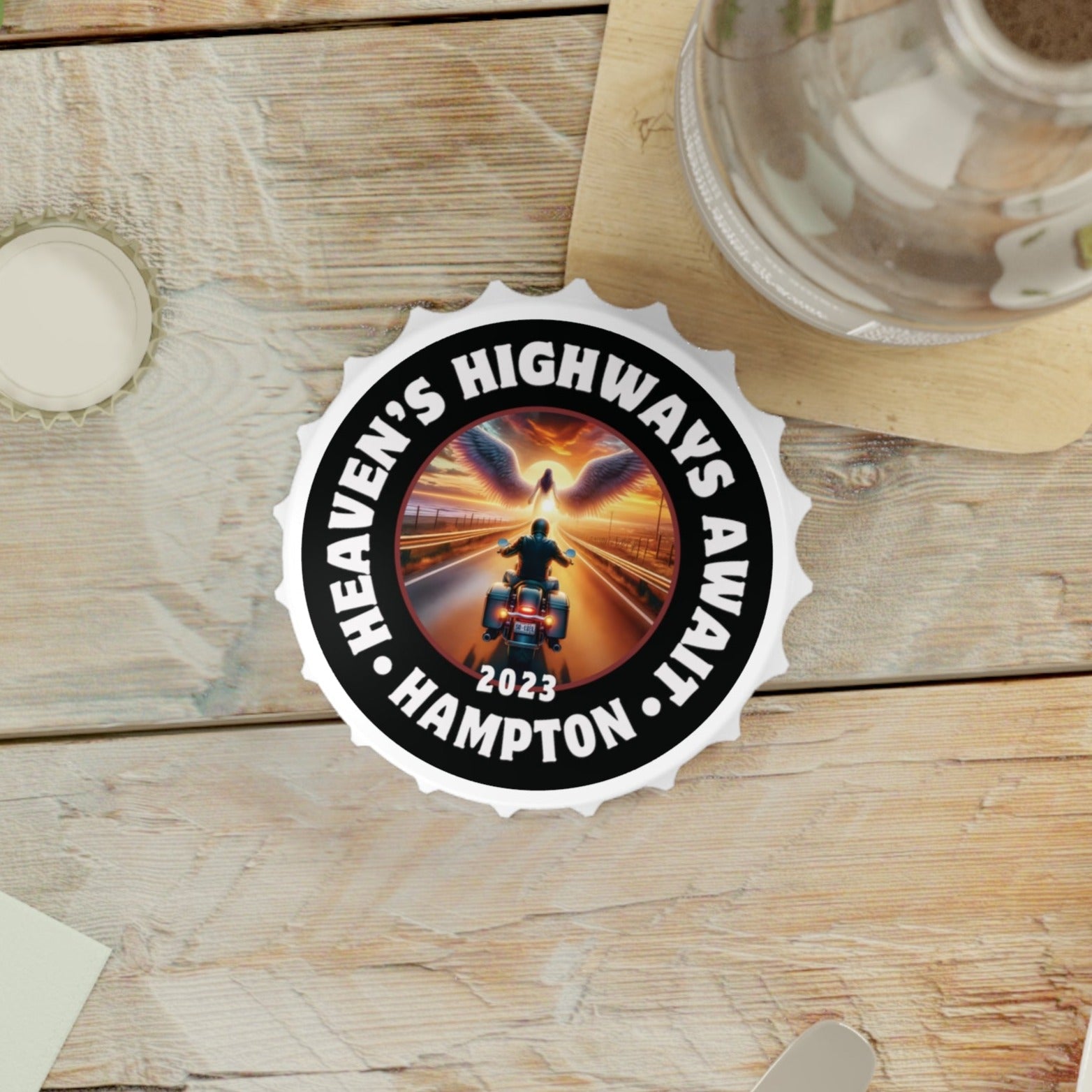This Biker Memorial Premium raffle or gift bundle includes a durable 1.5 oz shot glass, 3 inch magnetic bottle opener, metal key ring, bumper sticker and can cuzzi. It offers personalized touches with space for a chosen quote, the recipient's name, and a memorable date, ensuring each piece is a unique keepsake. Aimed at motorcycle clubs for resale at large events, this key ring serves as a meaningful fundraising item, directly supporting families affected by loss while keeping memories alive in the biker