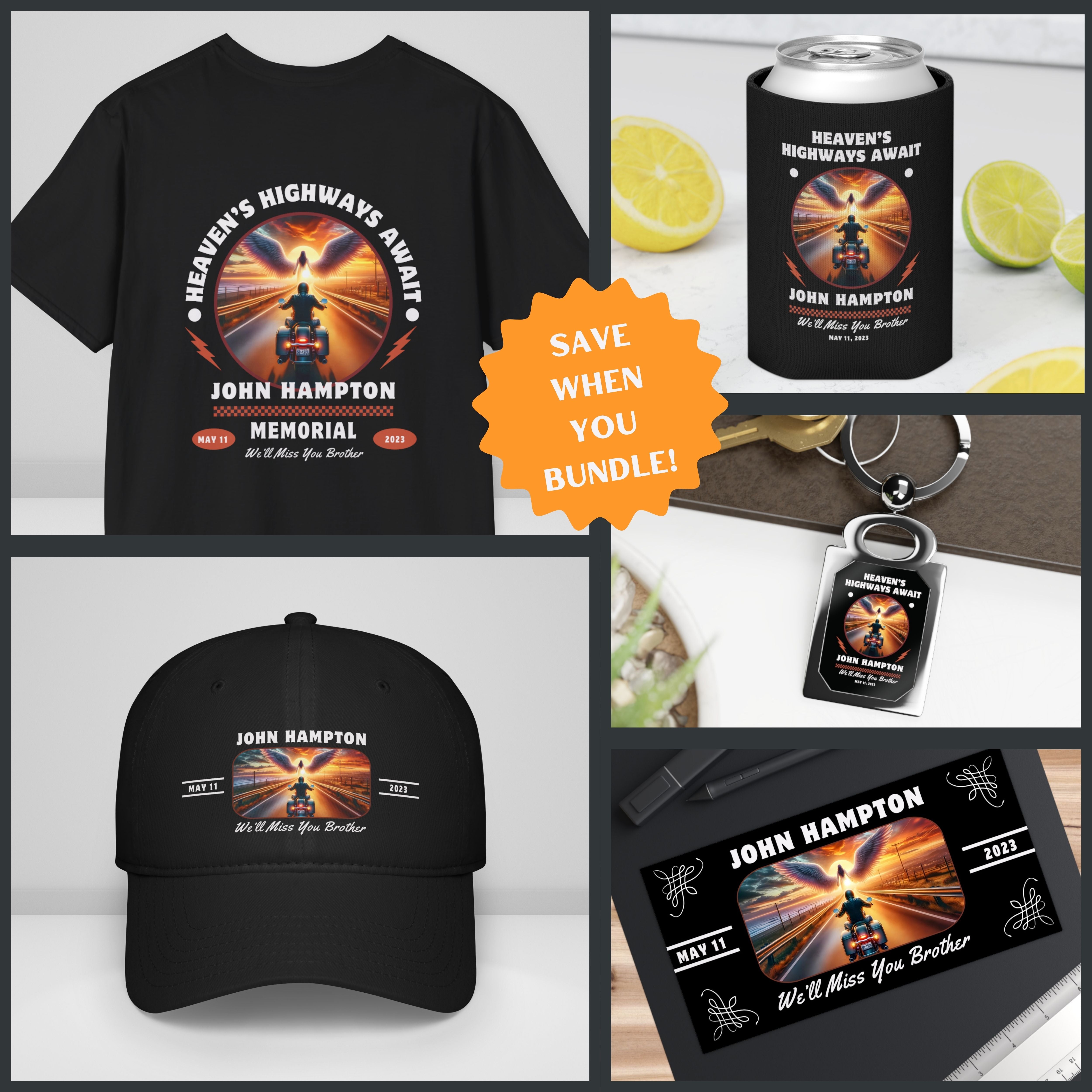 This Biker Memorial Premium raffle or gift bundle includes a durable 1.5 oz shot glass, 3 inch magnetic bottle opener, metal key ring, bumper sticker and can cuzzi. It offers personalized touches with space for a chosen quote, the recipient's name, and a memorable date, ensuring each piece is a unique keepsake. Aimed at motorcycle clubs for resale at large events, this key ring serves as a meaningful fundraising item, directly supporting families affected by loss while keeping memories alive in the biker community.
