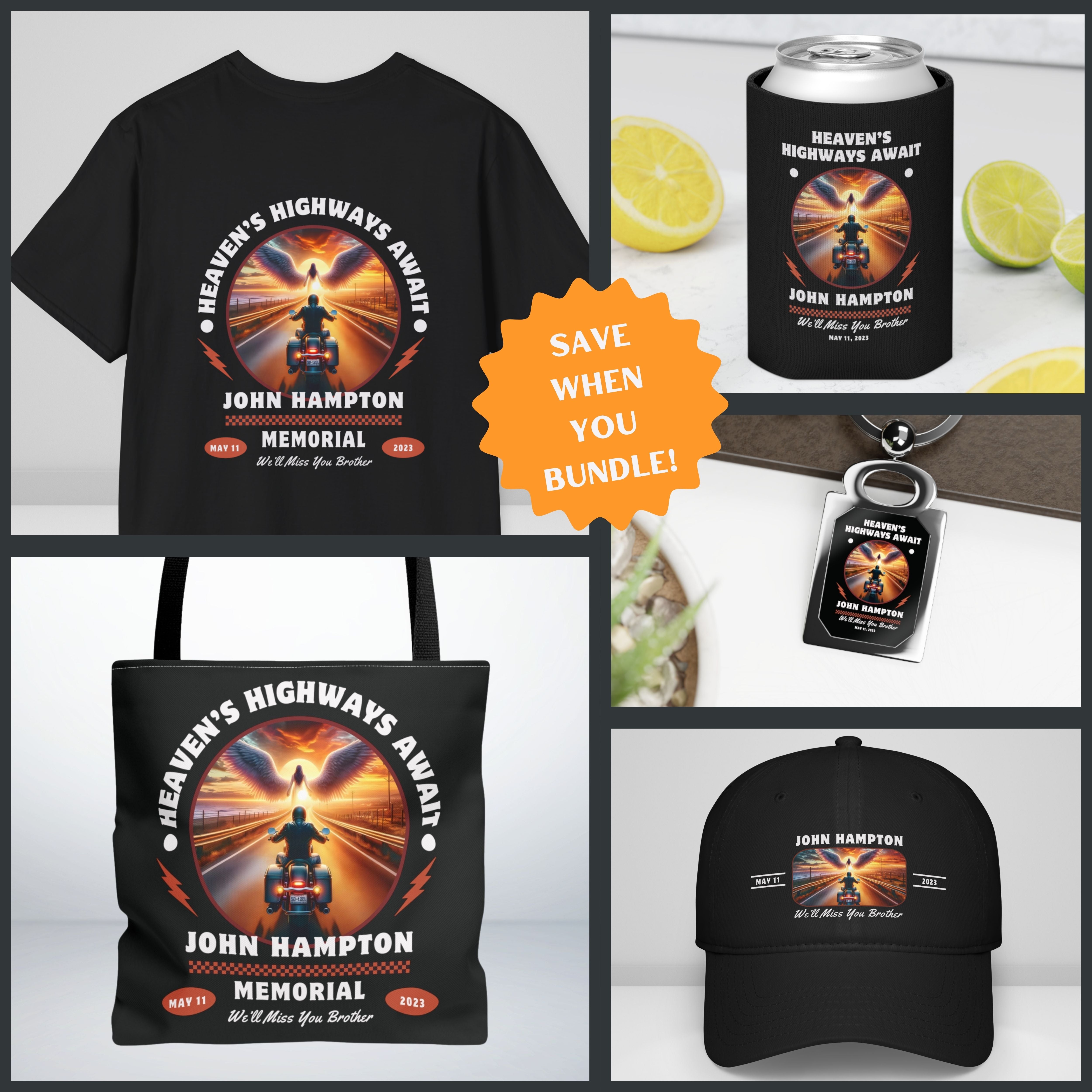 This Biker Memorial Premium raffle or gift bundle includes a lightweight Tshirt, durable tote bag, adjustable hat, silver metal key ring, metal key ring and can cuzzi. It offers personalized touches with space for a chosen quote, the recipient's name, and a memorable date, ensuring each piece is a unique keepsake. Aimed at motorcycle clubs for resale at large events, this premium bundle serves as a meaningful fundraising item, directly supporting families affected by loss while keeping memories alive in the biker community.