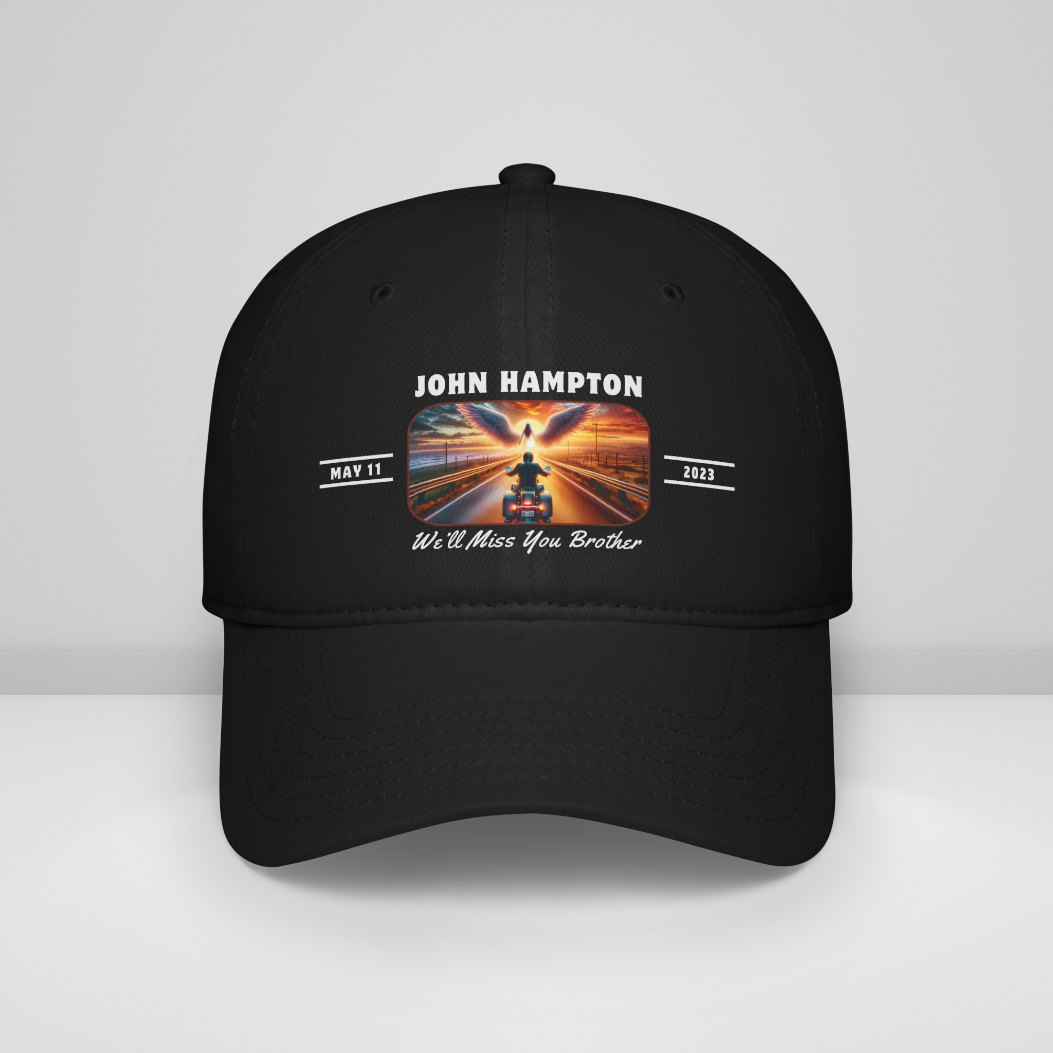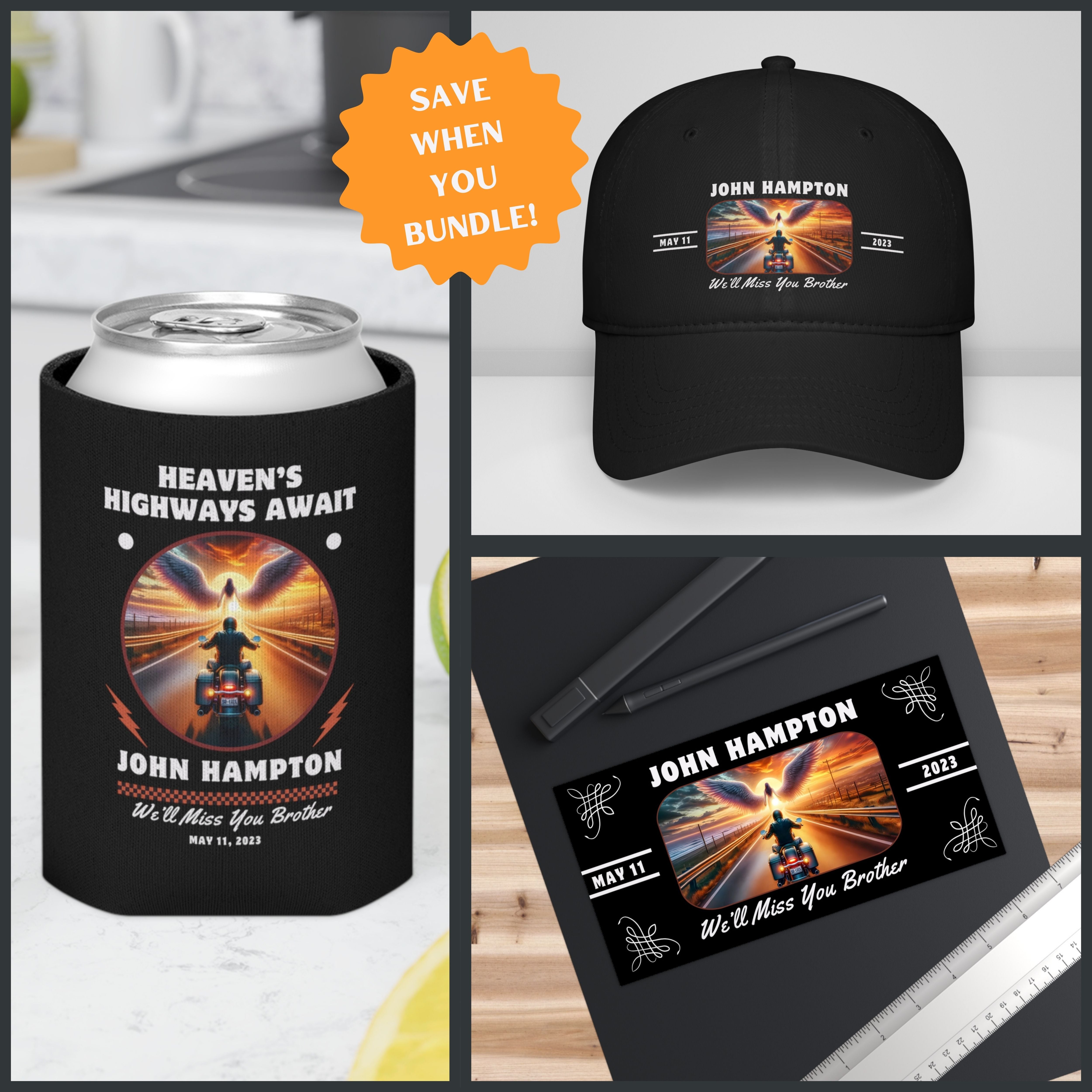 This biker memorial starter raffle or gift bundle includes a comfortable ball cap (hat), bumper sticker and can cuzzi. It offers personalized touches with space for a chosen quote, the recipient's name, and a memorable date, ensuring each piece is a unique keepsake. Aimed at motorcycle clubs for resale at large events, this key ring serves as a meaningful fundraising item, directly supporting families affected by loss while keeping memories alive in the biker community.