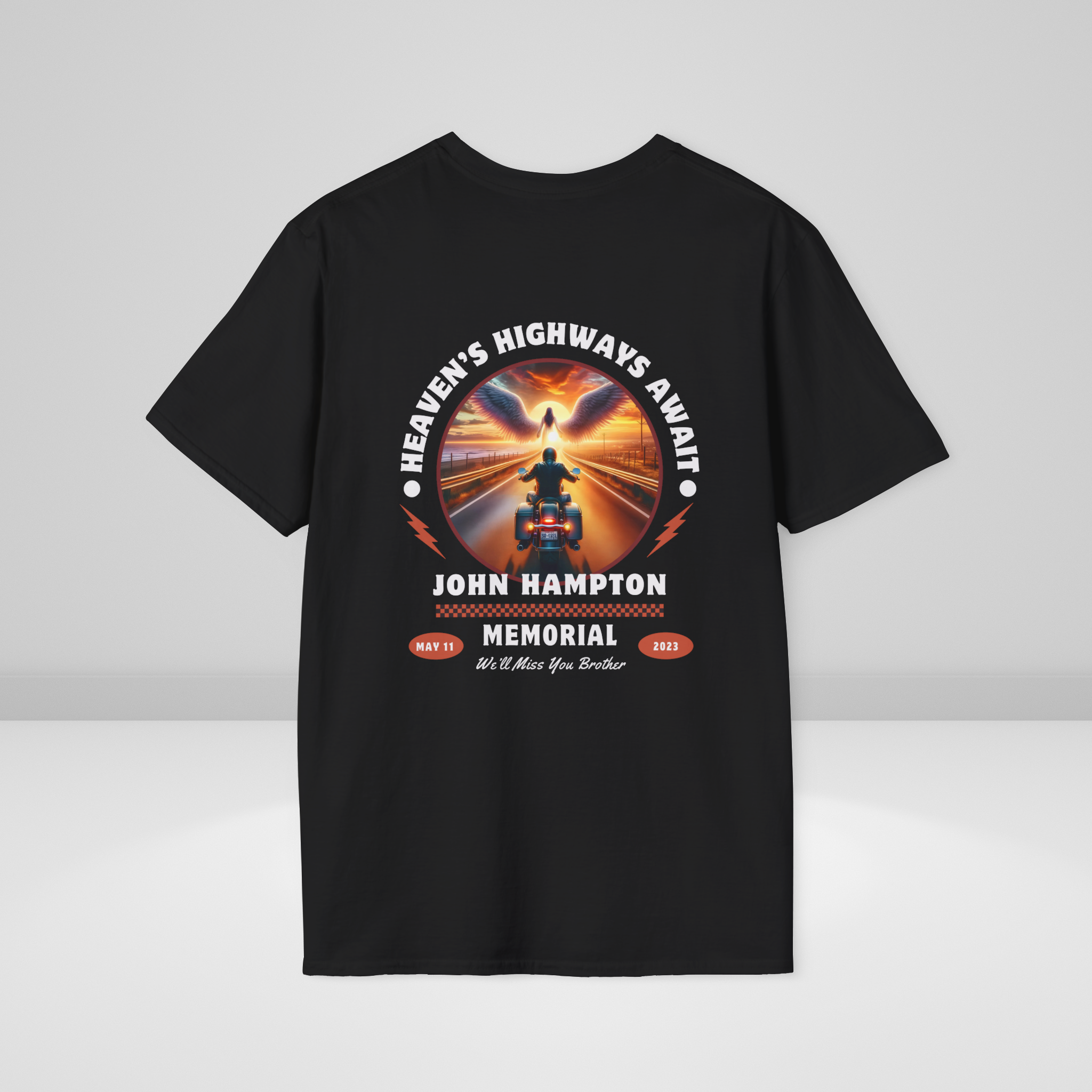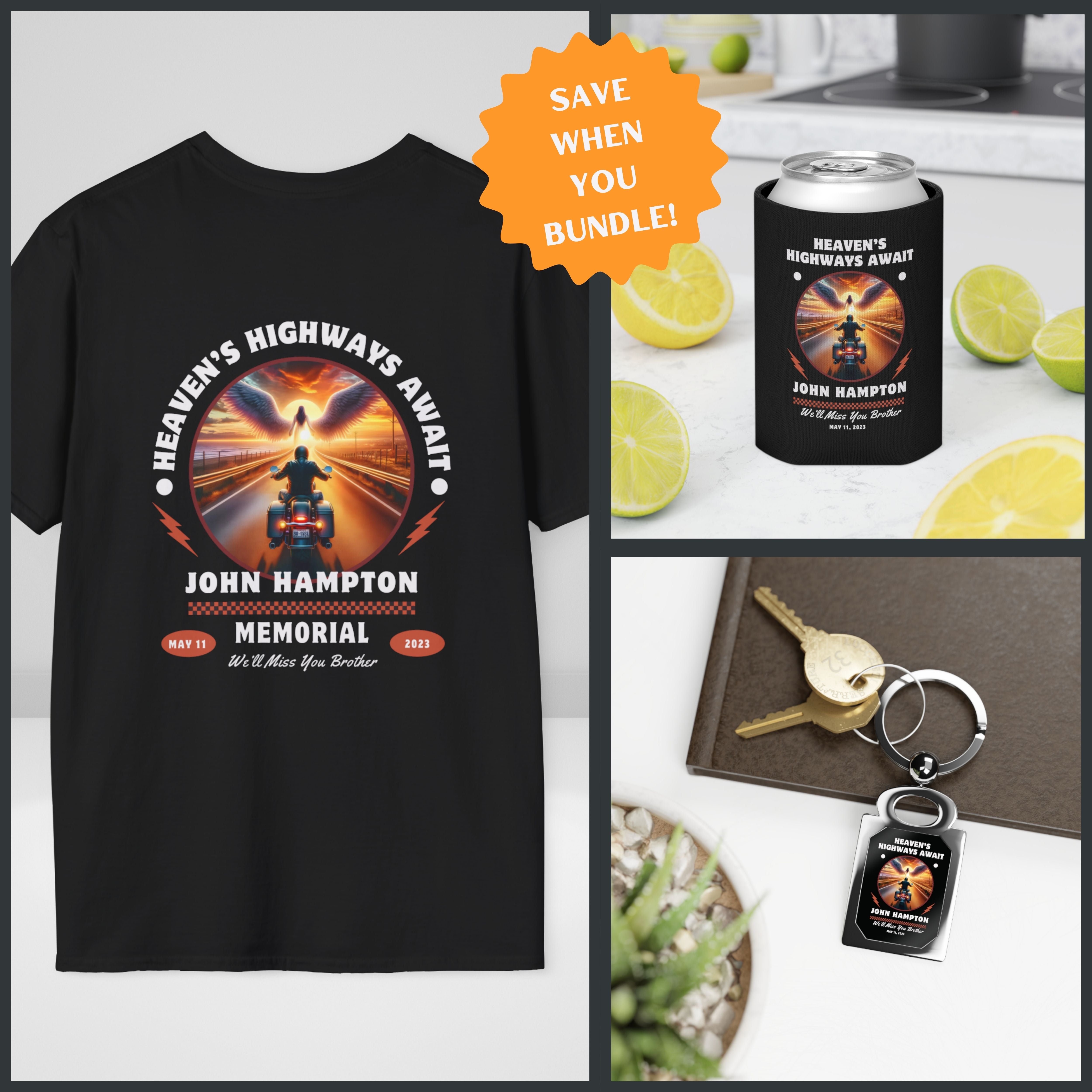 This biker memorial starter raffle or gift bundle includes a comfortable lightweight tee, silver toned metal key ring and can cuzzi. It offers personalized touches with space for a chosen quote, the recipient's name, and a memorable date, ensuring each piece is a unique keepsake. Aimed at motorcycle clubs for resale at large events, this key ring serves as a meaningful fundraising item, directly supporting families affected by loss while keeping memories alive in the biker community.