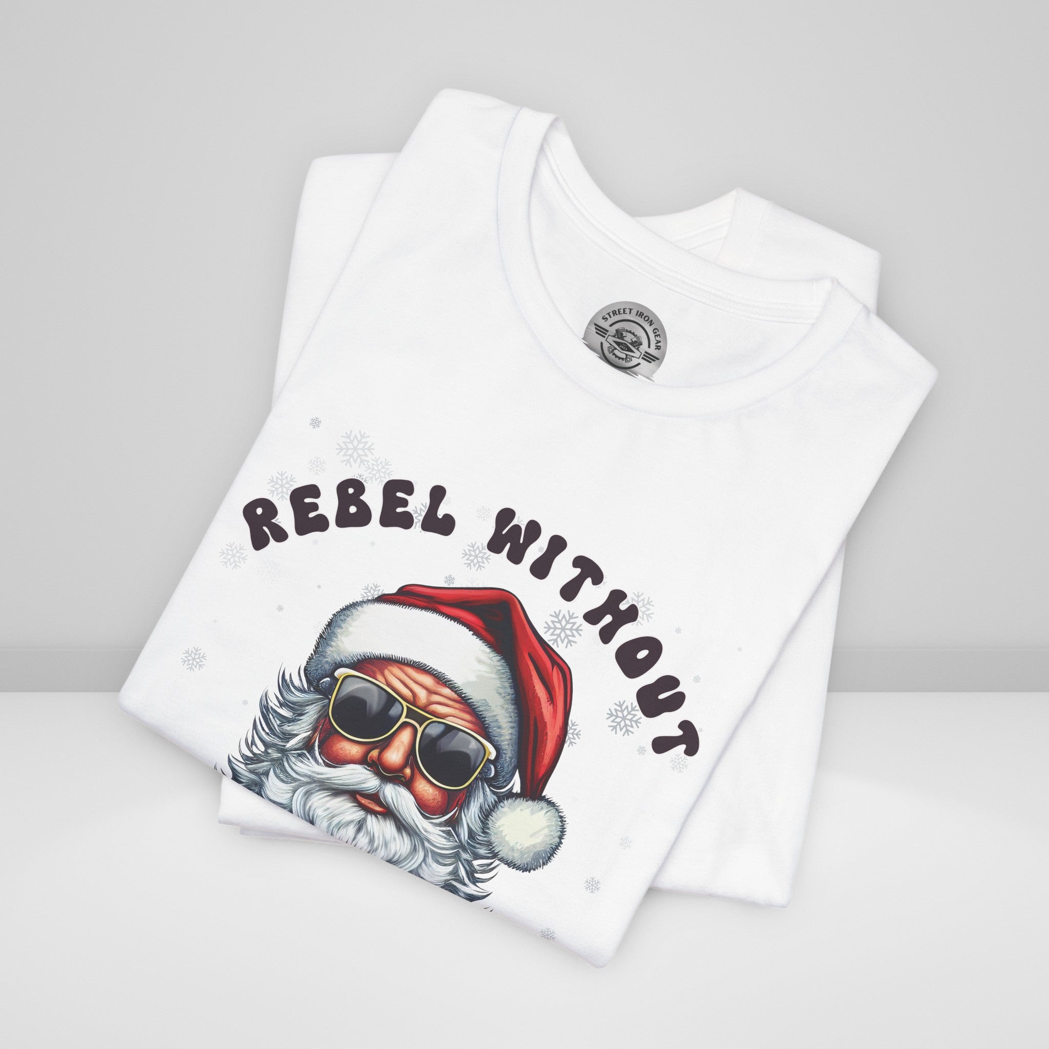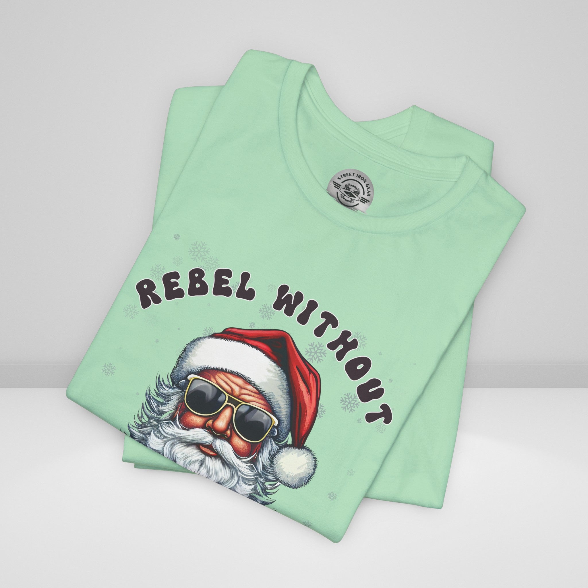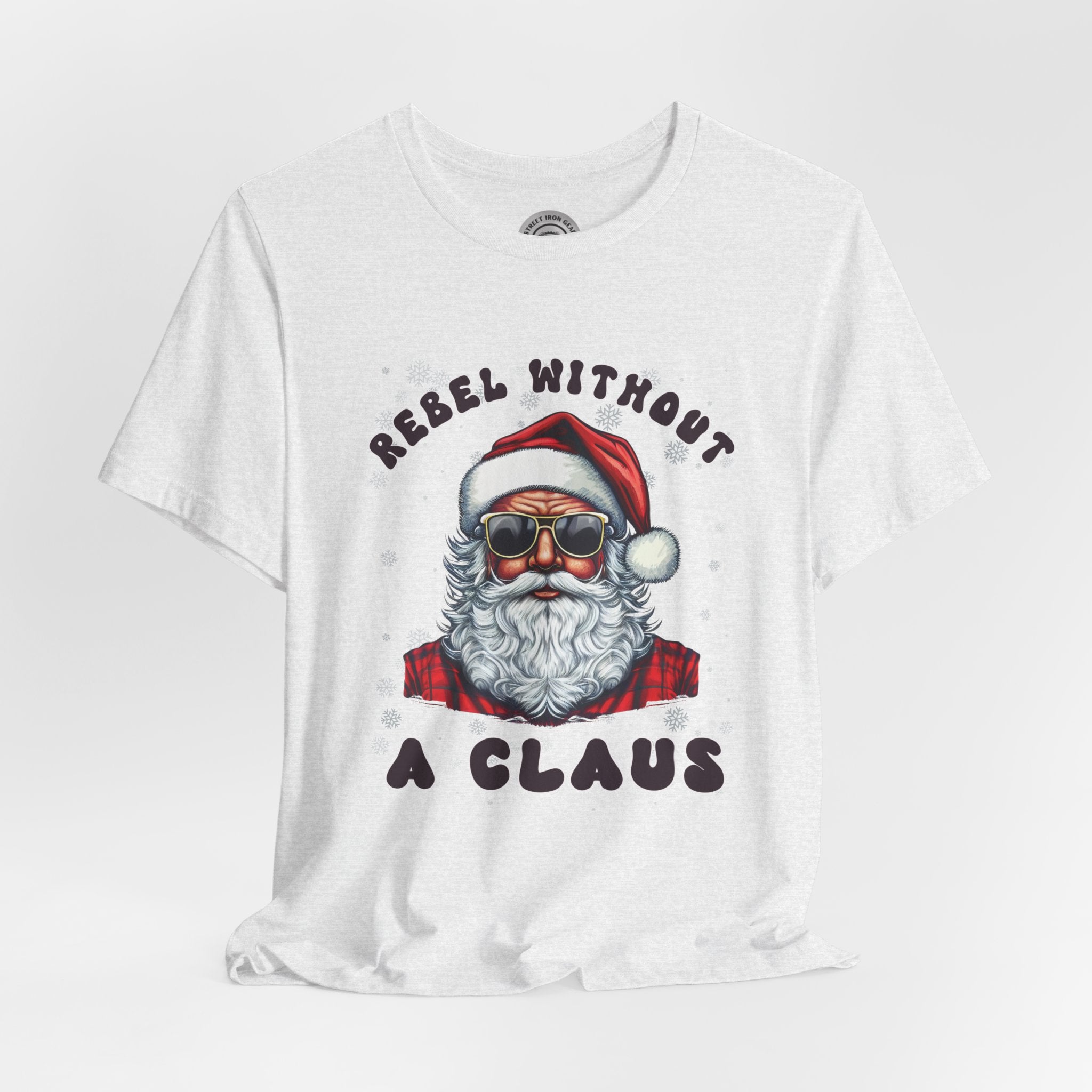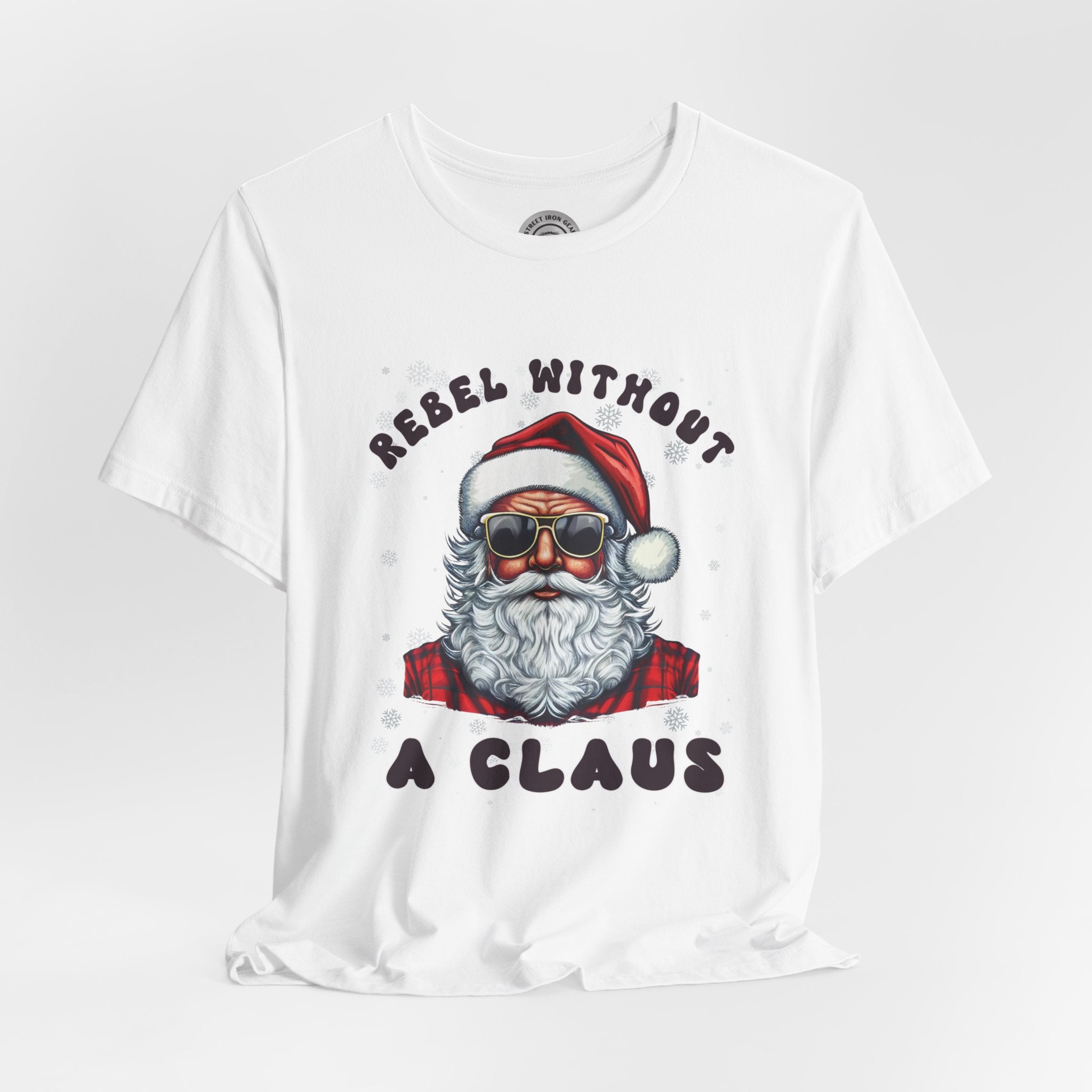 Embrace the rebel spirit of the season with our cool Winter shirt! Featuring the phrase "Rebel without a Clause" in wavy retro font, this unique winter t shirt adds a playful twist to holiday fashion.
