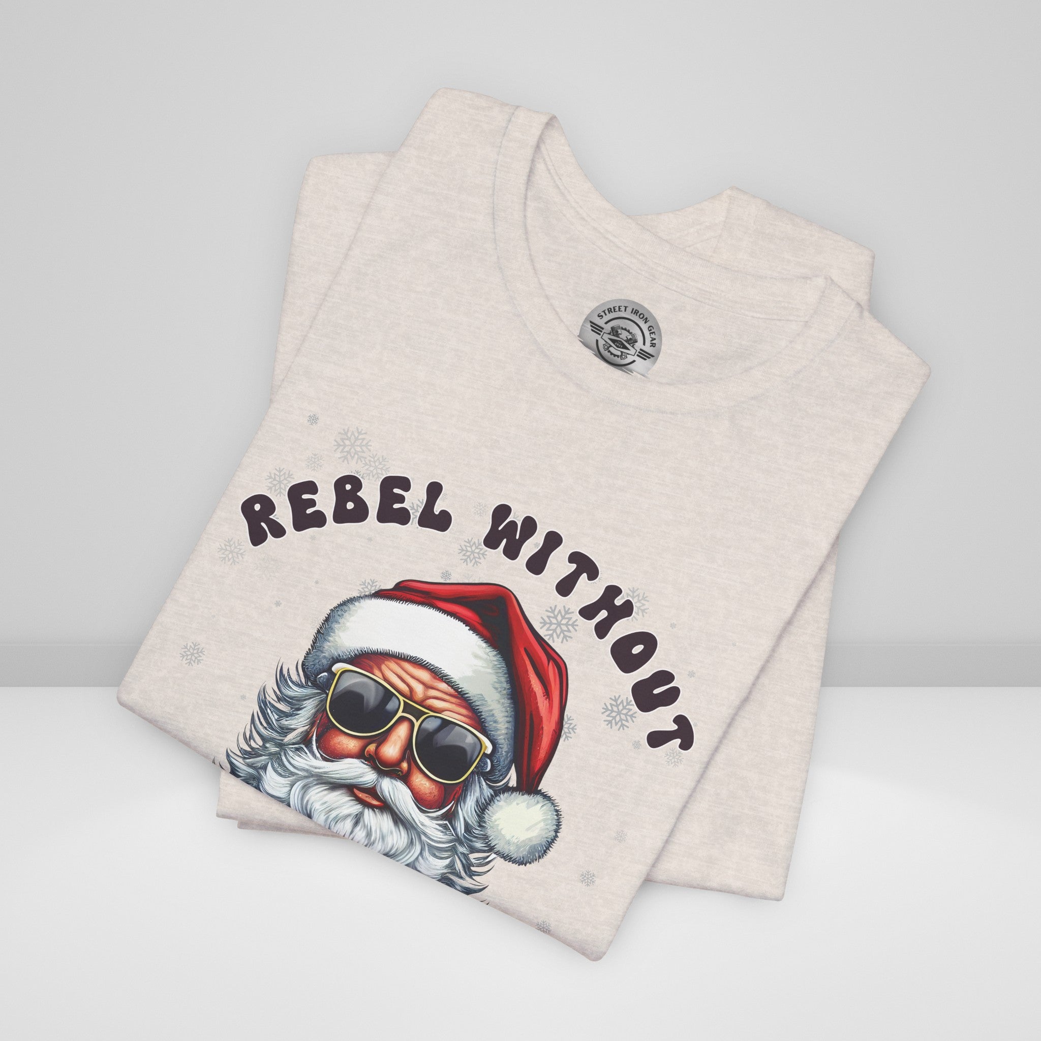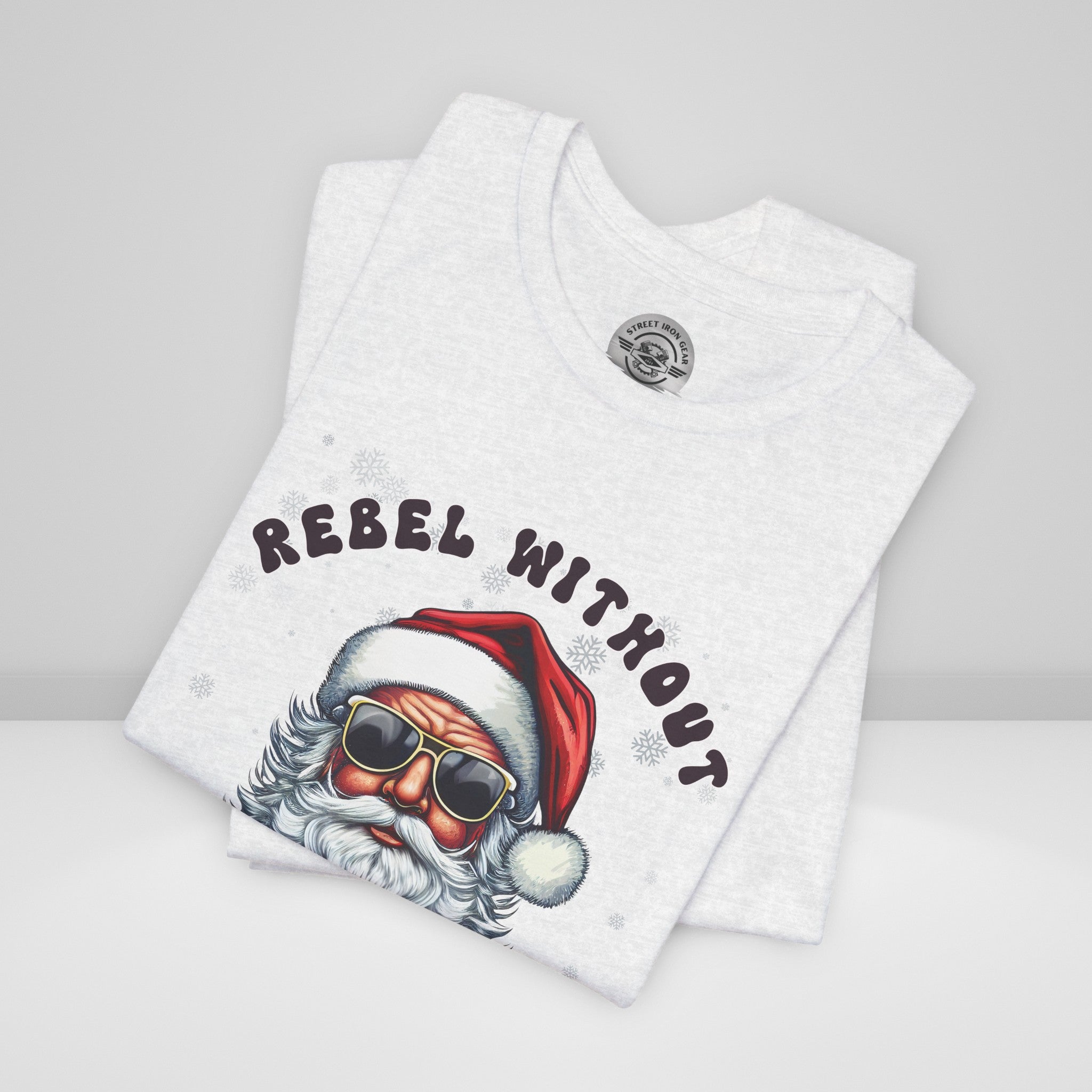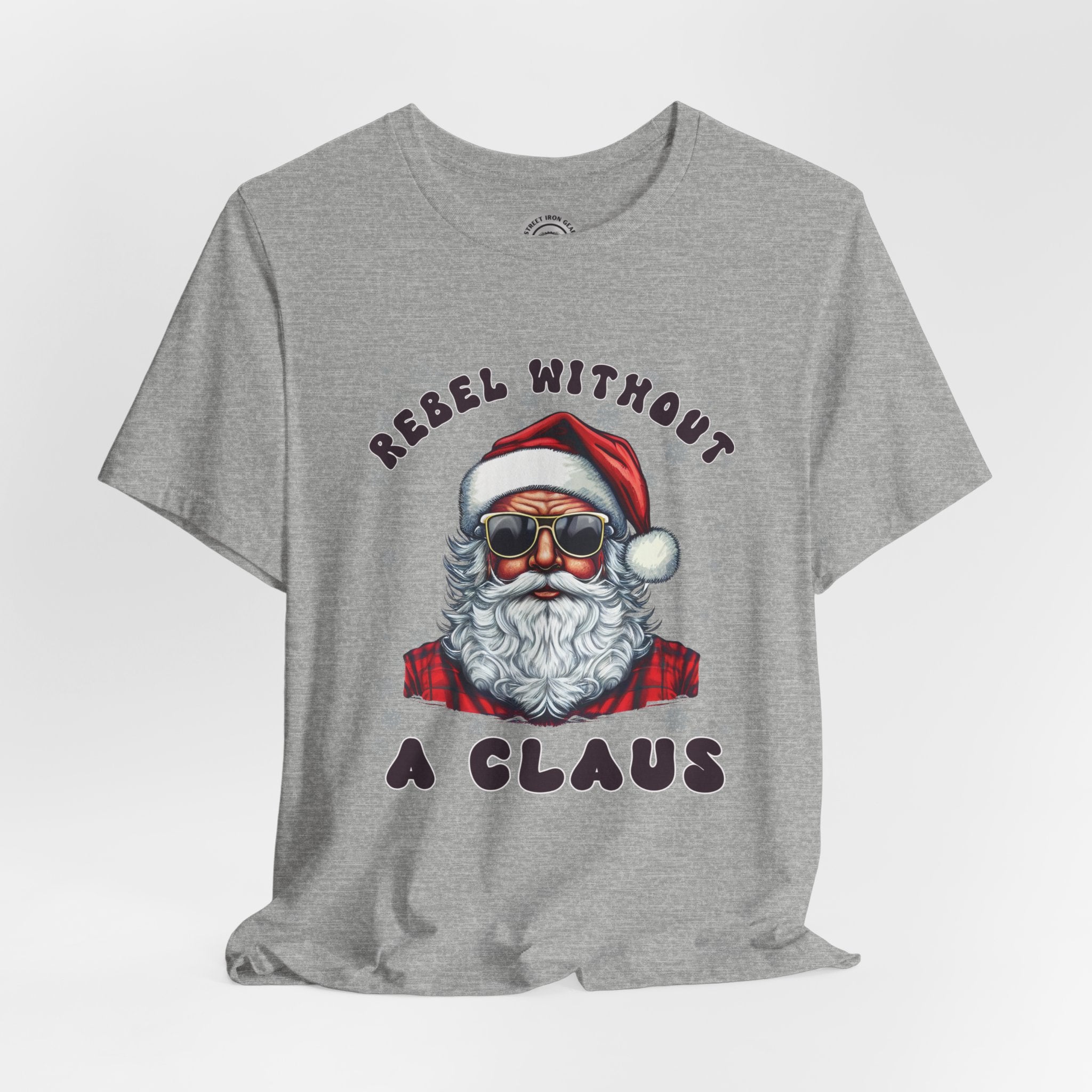Embrace the rebel spirit of the season with our cool Winter shirt! Featuring the phrase "Rebel without a Clause" in wavy retro font, this unique winter t shirt adds a playful twist to holiday fashion.