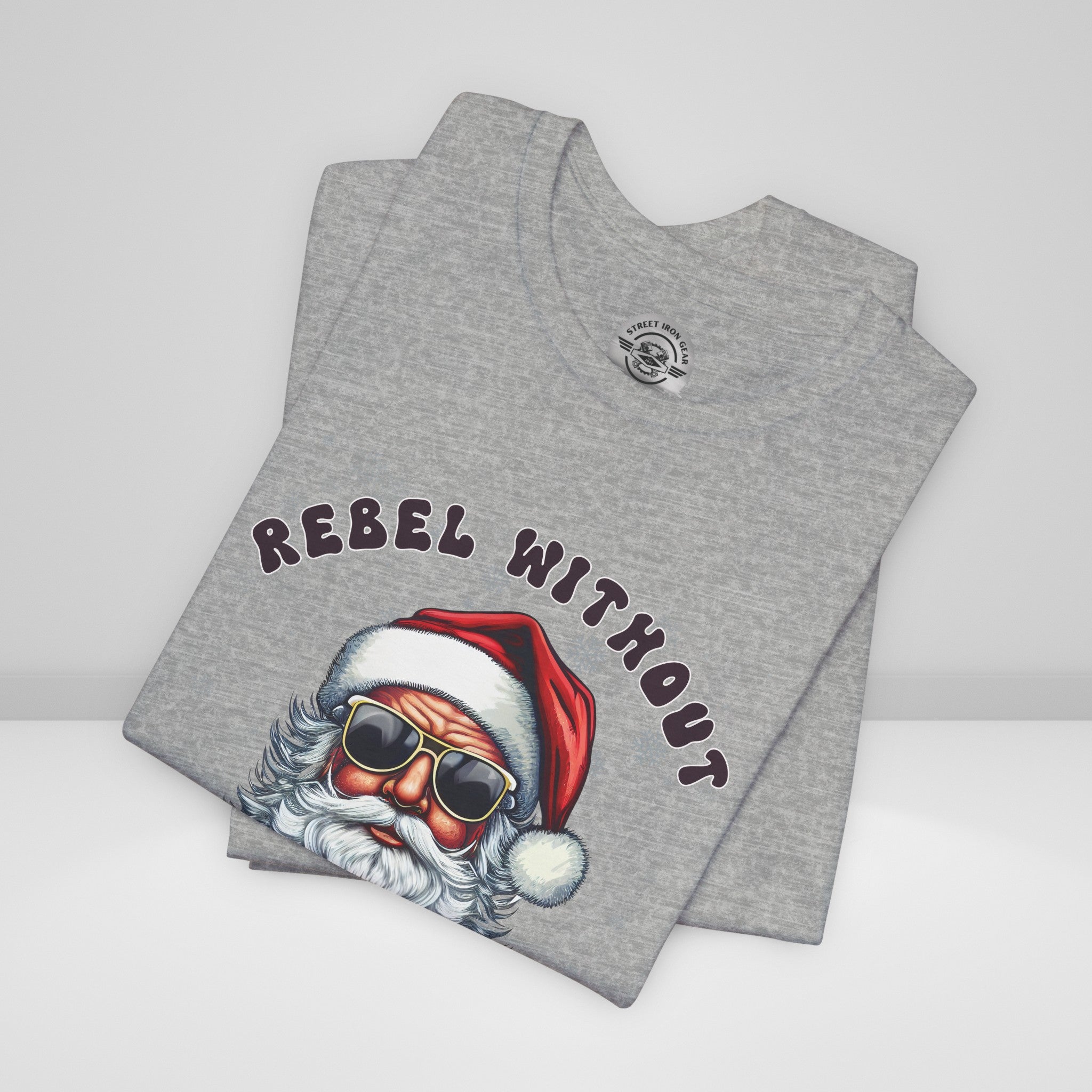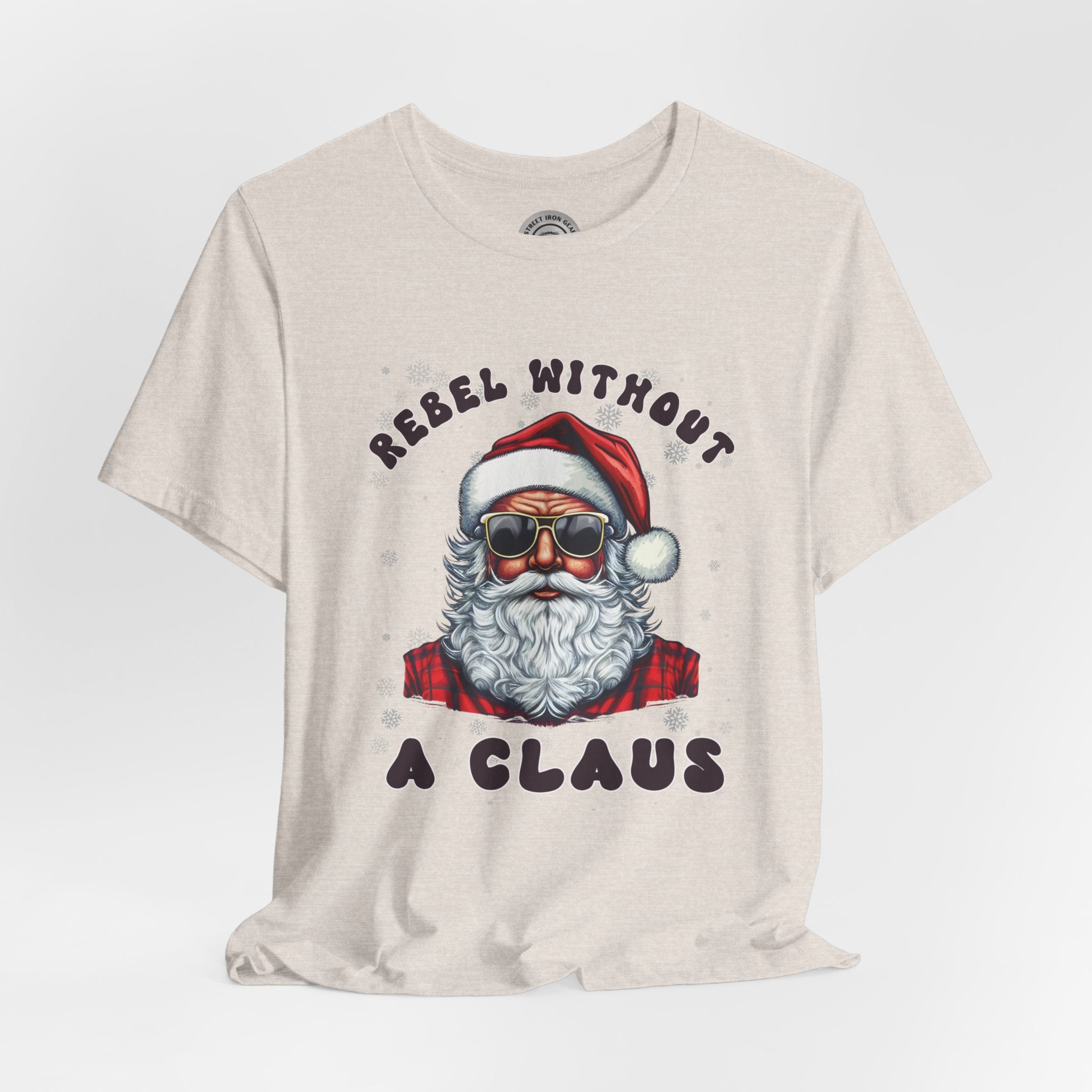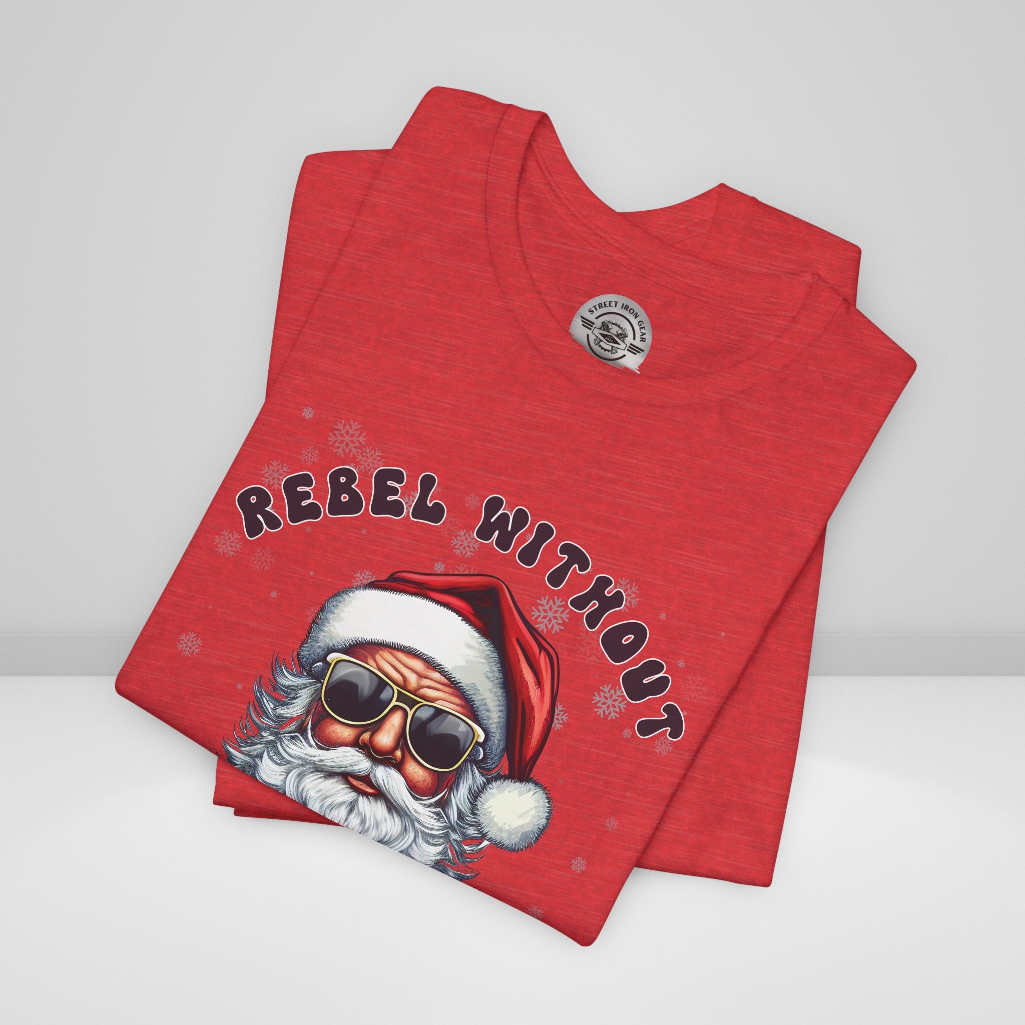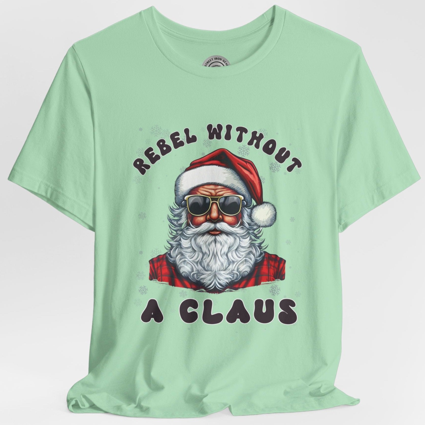 Embrace the rebel spirit of the season with our cool Winter shirt! Featuring the phrase "Rebel without a Clause" in wavy retro font, this unique winter t shirt adds a playful twist to holiday fashion.