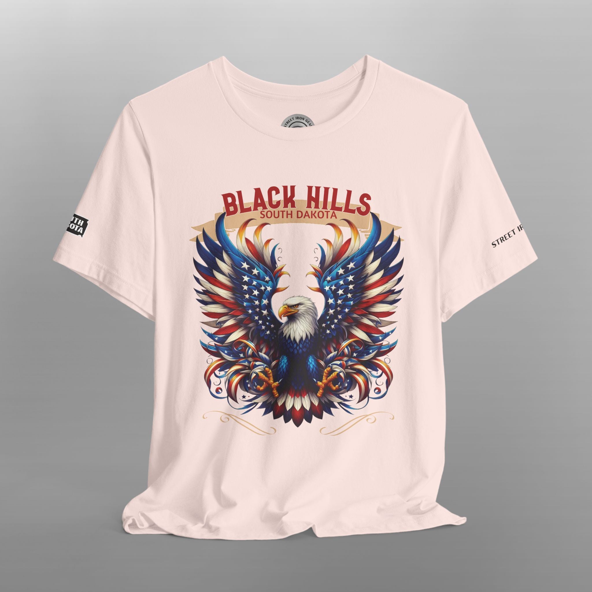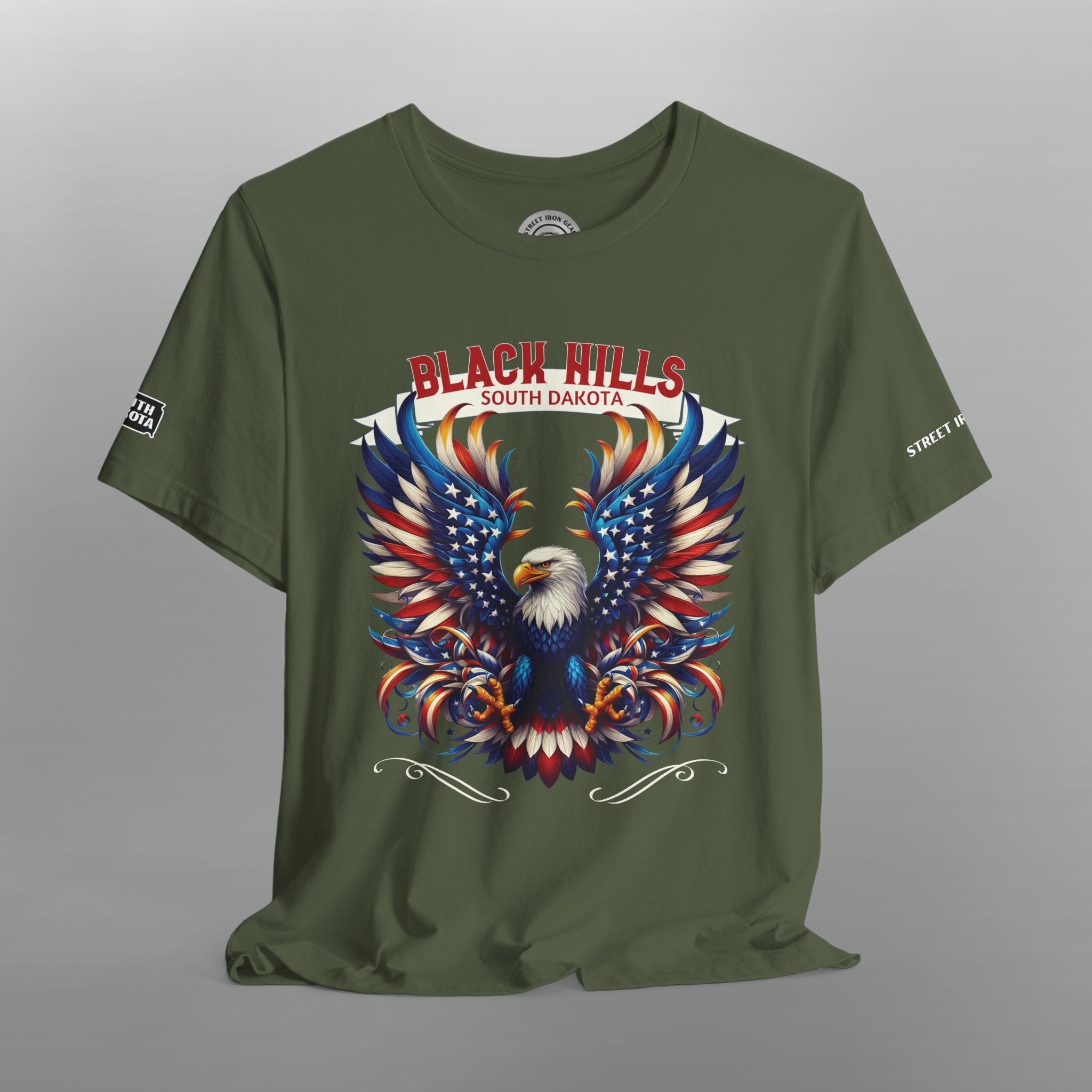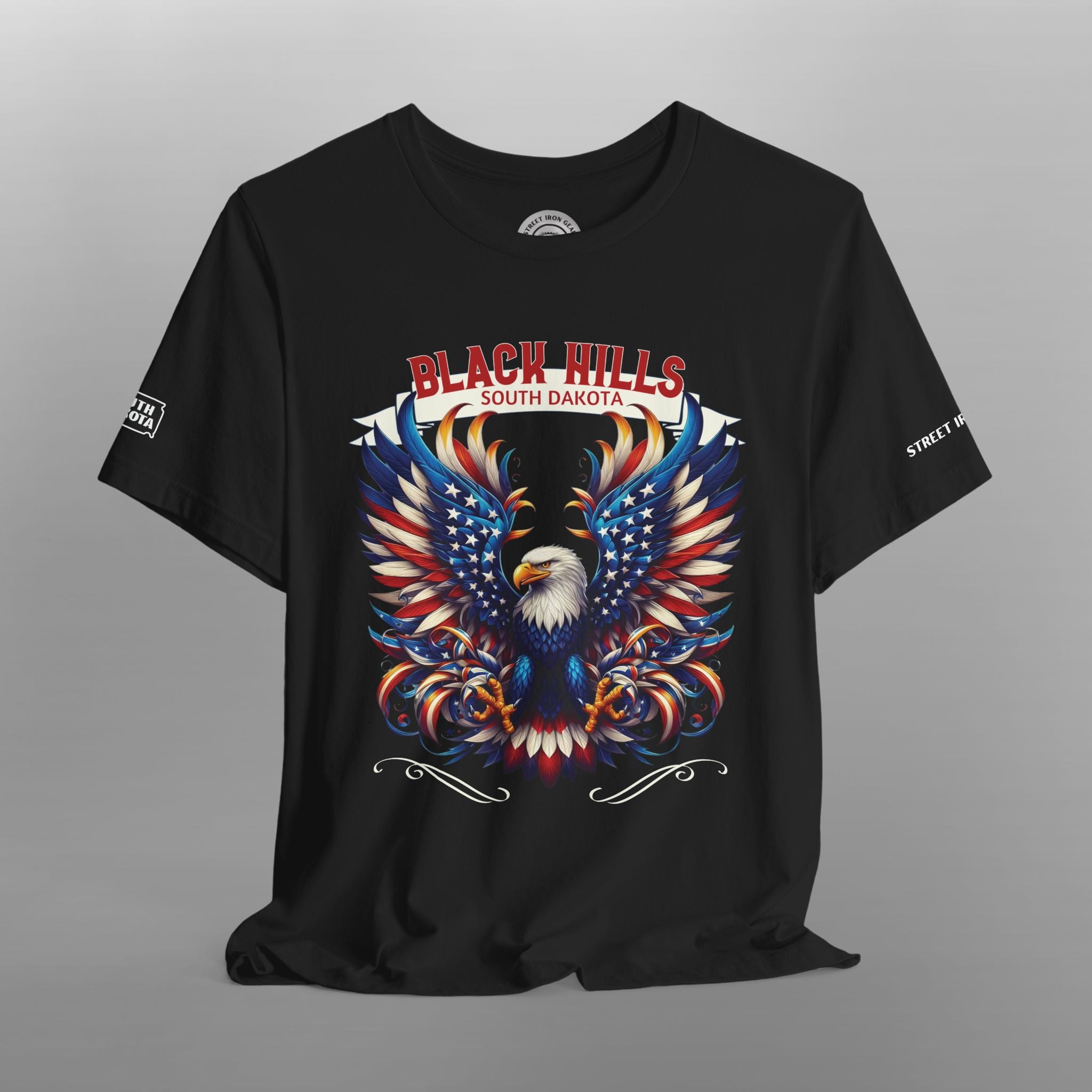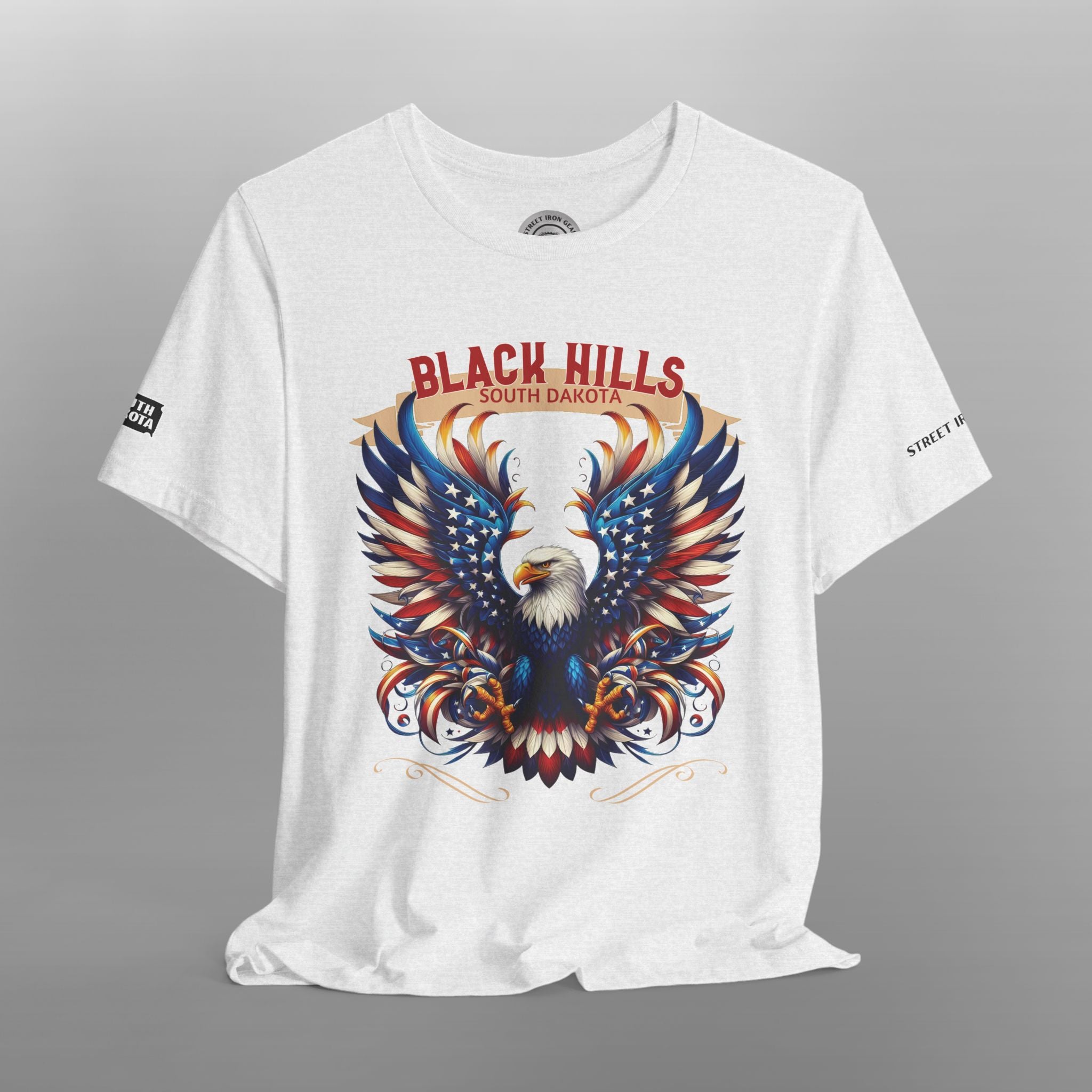 Hit the road in style with our Black Hills South Dakota Motorcycle T-Shirt, inspired by one of the most iconic riding destinations in the U.S. This bold and colorful design showcases a majestic American eagle with its wings spread wide in vivid red, white, blue, and gold tones—symbolizing the freedom of the open road and the spirit of adventure. Featuring a proud "Black Hills South Dakota" graphic, this biker tee pays tribute to legendary routes like Needles Highway, Iron Mountain Road, Spearfish Canyon, and Custer State Park. Available with your choice of front or back print, this shirt includes a South Dakota (SD) state outline on the right sleeve and Street Iron Gear branding on the left sleeve, adding detail and authenticity.