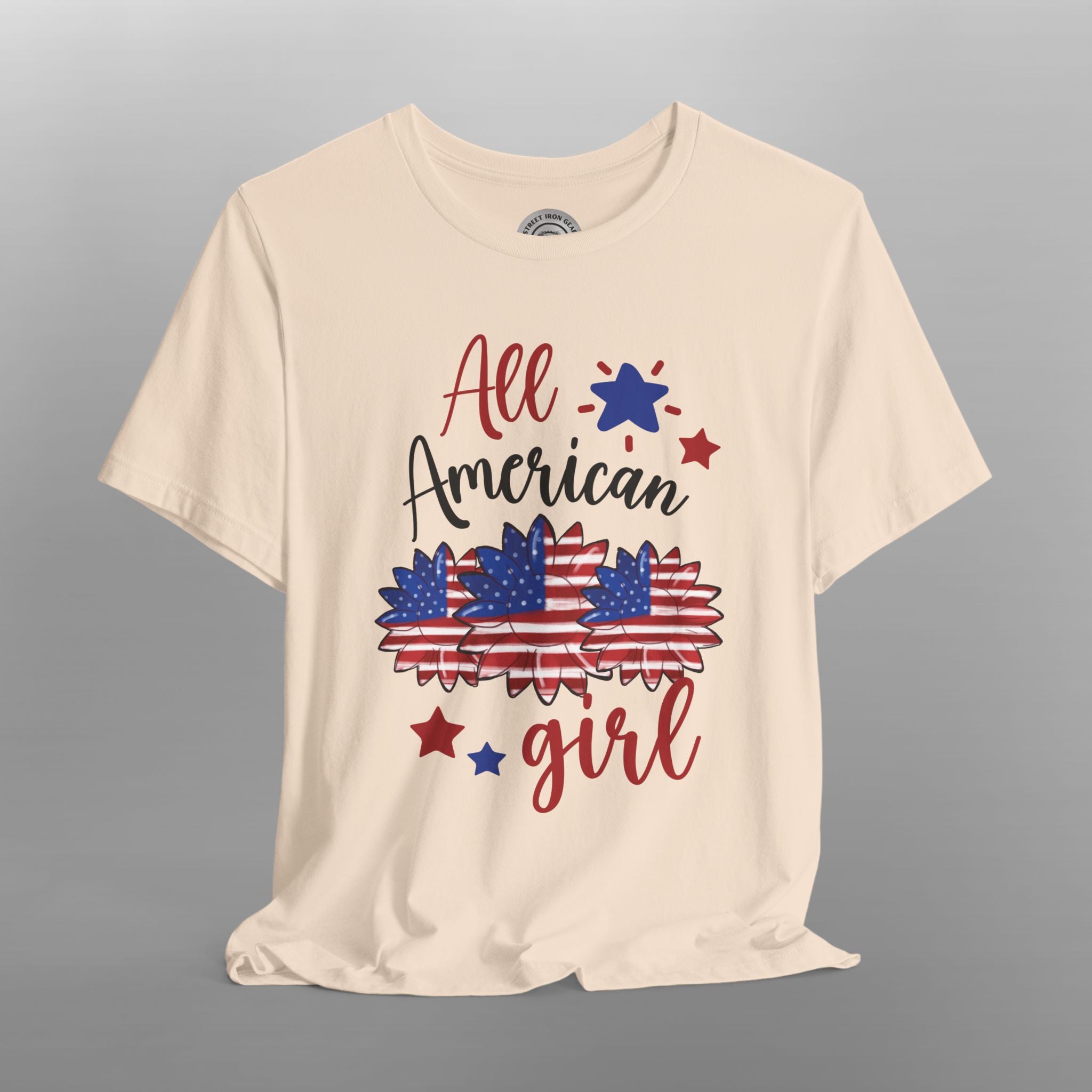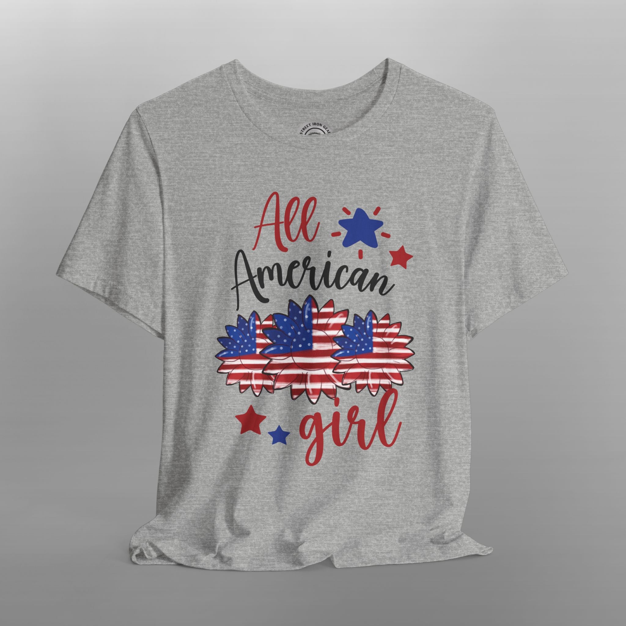 Show your American pride with a touch of bohemian style! Our "All American Girl" t-shirt is the perfect way for any woman to celebrate her patriotism in a unique and fashionable way. The whimsical design features a beautiful floral arrangement styled with an iconic red, white, and blue stars and stripes pattern. The text "All American Girl" is featured in a fun, scripted font, adding a playful and feminine touch to this patriotic tee. Made from a soft, comfortable fabric, this shirt is perfect for everyday wear. Its stylish design makes it ideal for 4th of July parties, summer barbecues, or simply as a cute and casual way to display your love for the USA. This shirt is a great patriotic gift for her.