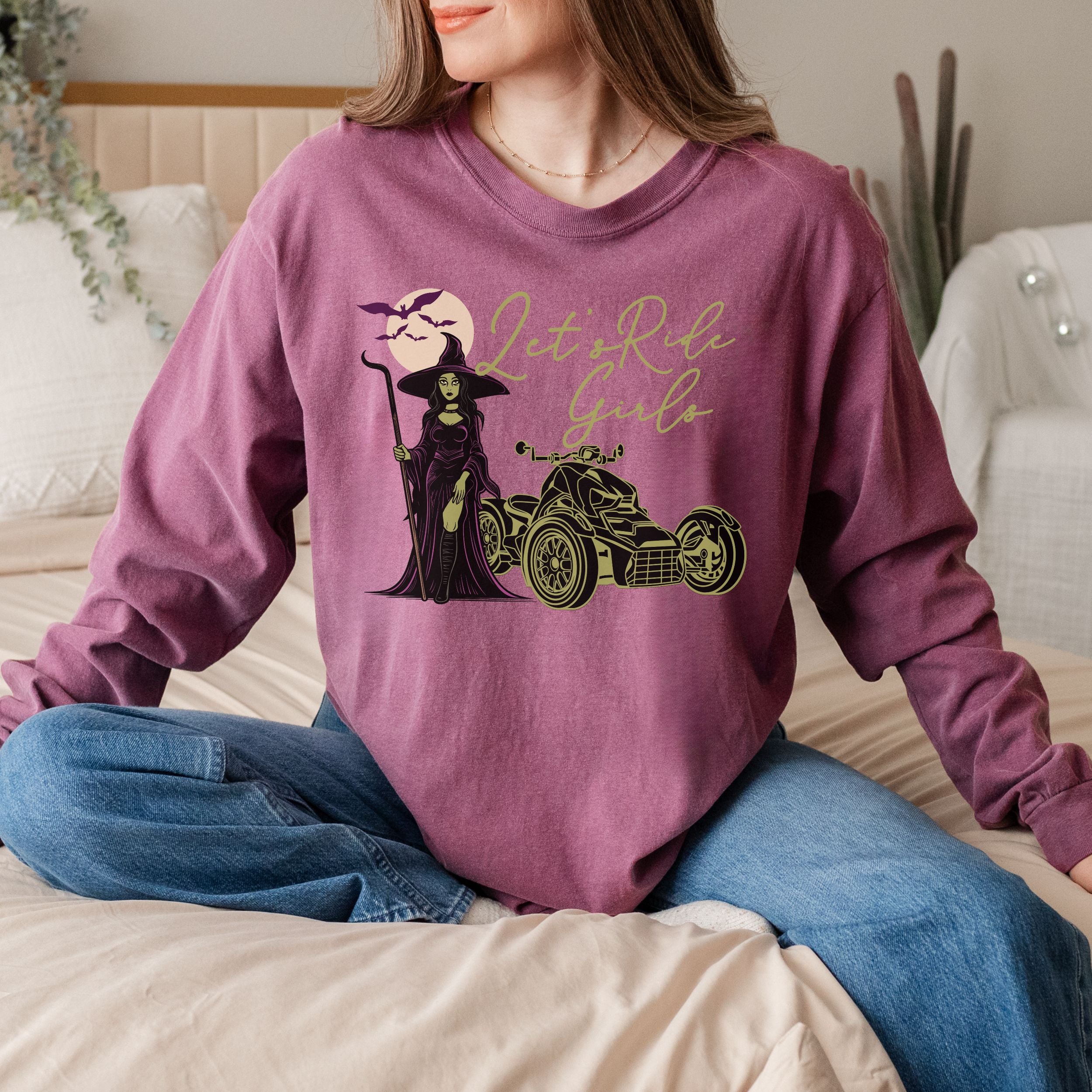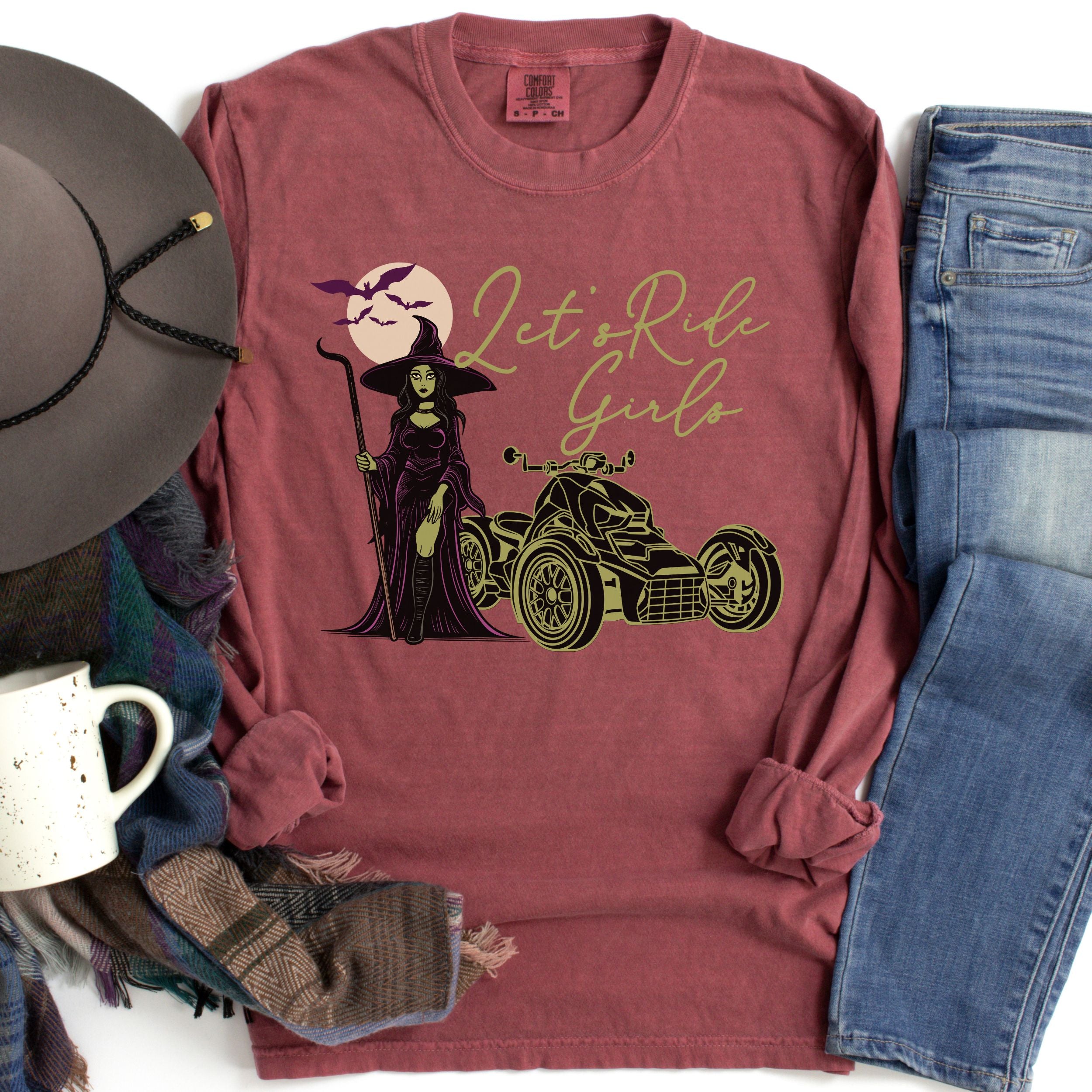 Get into the Halloween spirit with our Can-Am Ryker themed "Let's Ride Girls" cozy long sleeve crew neck T-shirt, featuring a witch holding a staff, a spooky moon with bats, and a Can-Am Ryker motorcycle graphic. Designed in festive Halloween colors of purple, black, and green, this stylish tee is perfect for any Ryker rider looking to celebrate the season in style. Whether you're hitting the road or attending a Halloween event, this t-shirt is a must-have for Can-Am enthusiasts who love to combine their passion for riding with the thrills of Halloween!
