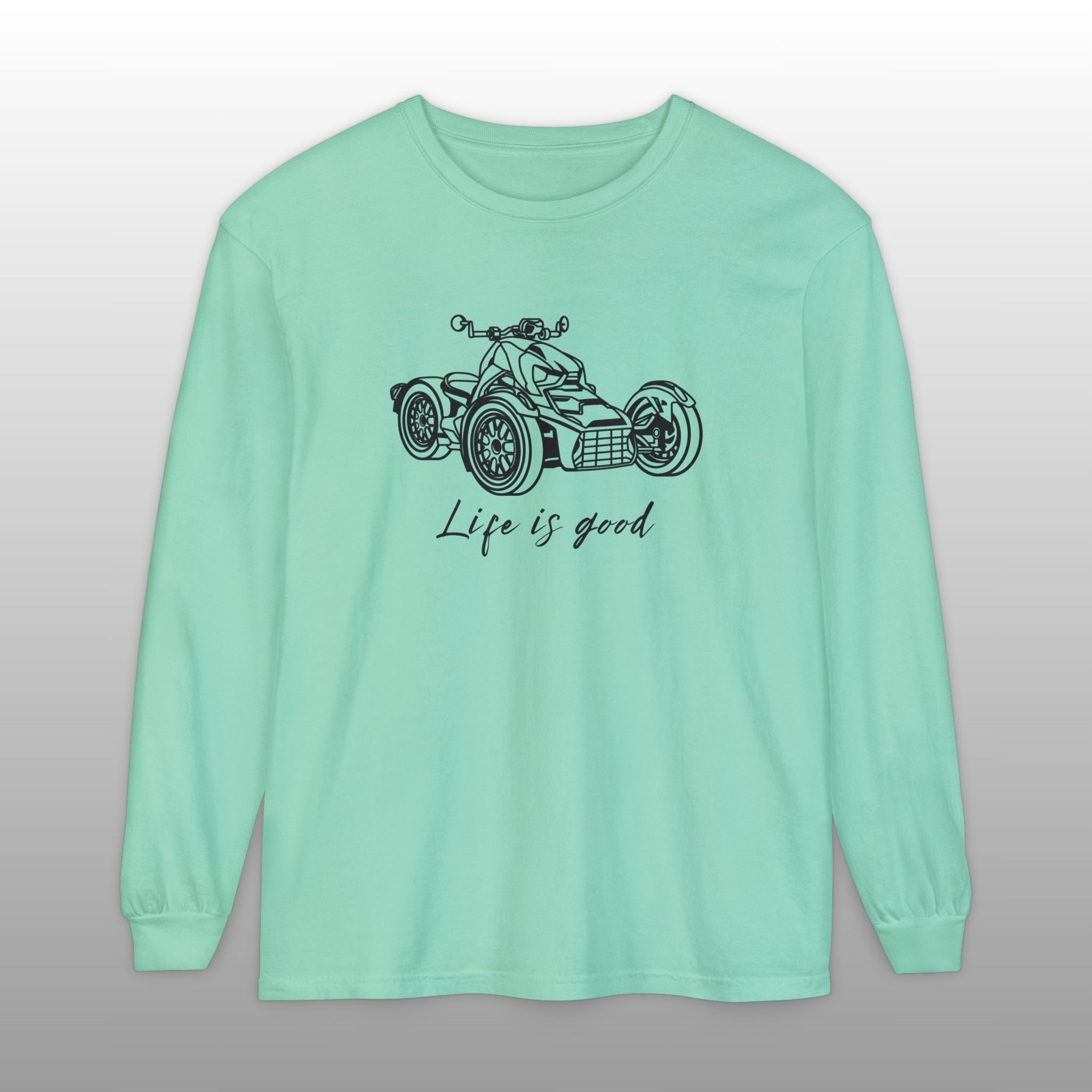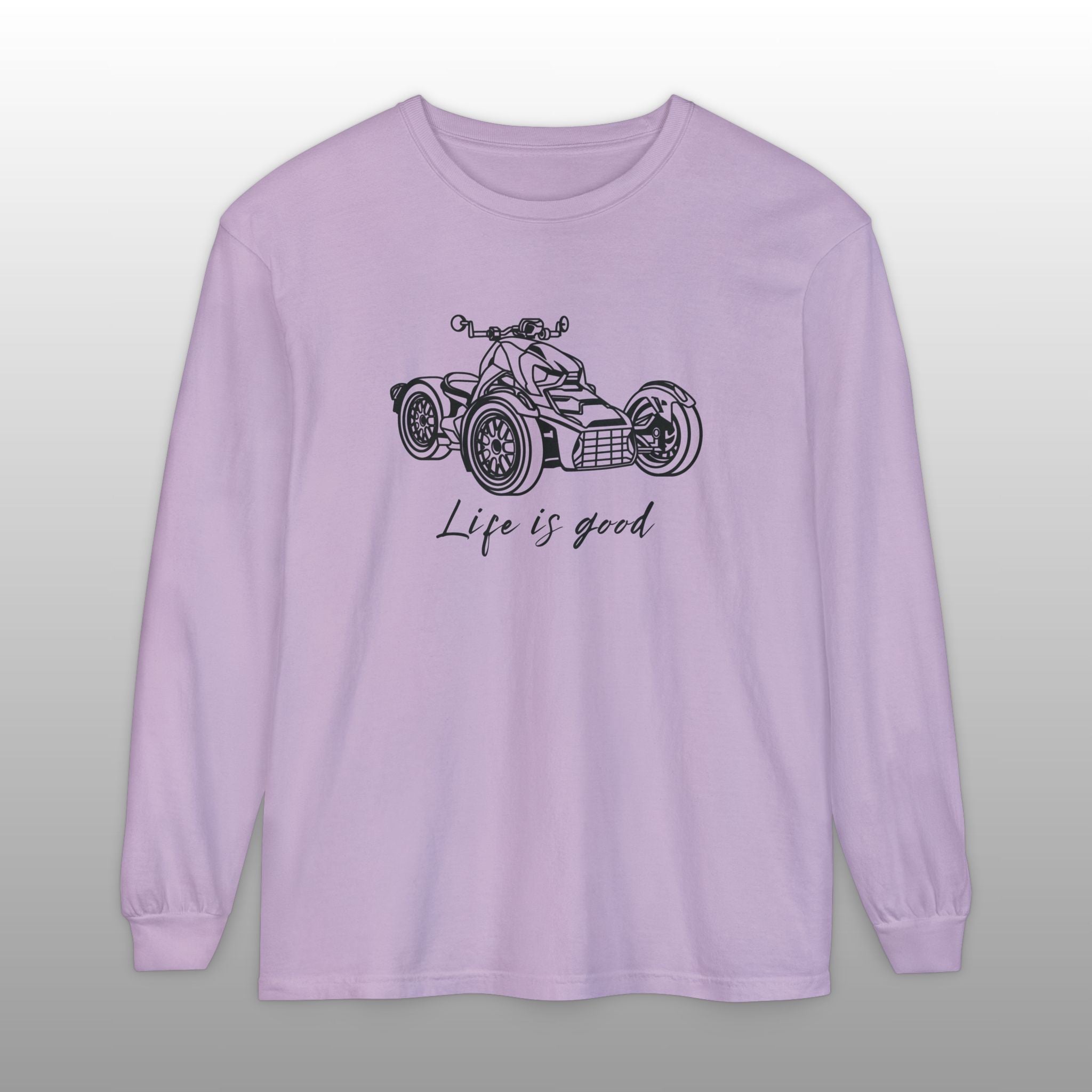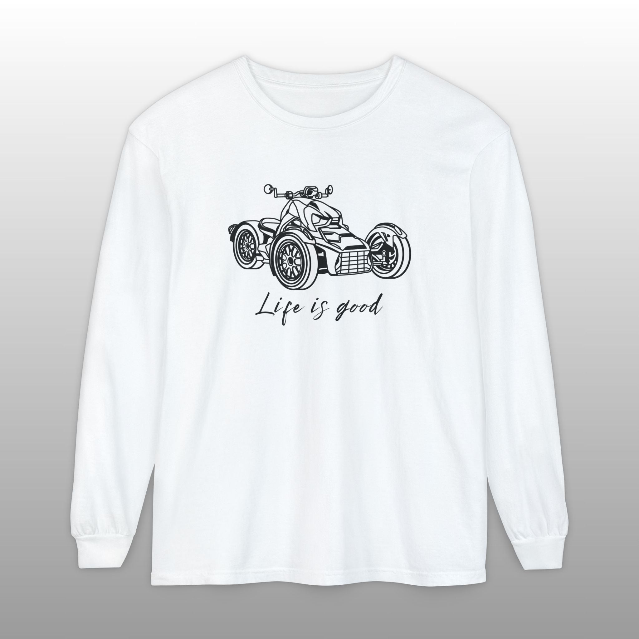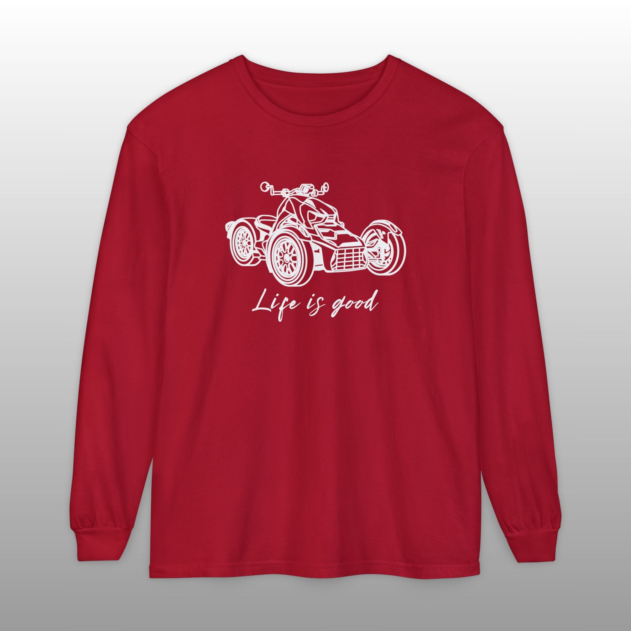 Embrace the joy of riding with this comfortable Can-Am Ryker long sleeve tee, made with the popular Comfort Colors 6014 fabric. This high-quality shirt features a detailed graphic of the iconic Can-Am Ryker and the uplifting message "Life is good" scripted below it, perfectly capturing the spirit of the open road. The garment-dyed process ensures a soft, worn-in feel and a vintage look, making it an ideal choice for the Ryker enthusiast to wear while riding or just relaxing. This durable long sleeve is a fantastic piece of Ryker apparel, an excellent motorcycle rider gift, and a stylish way for any three-wheel motorcycle owner to show their passion.