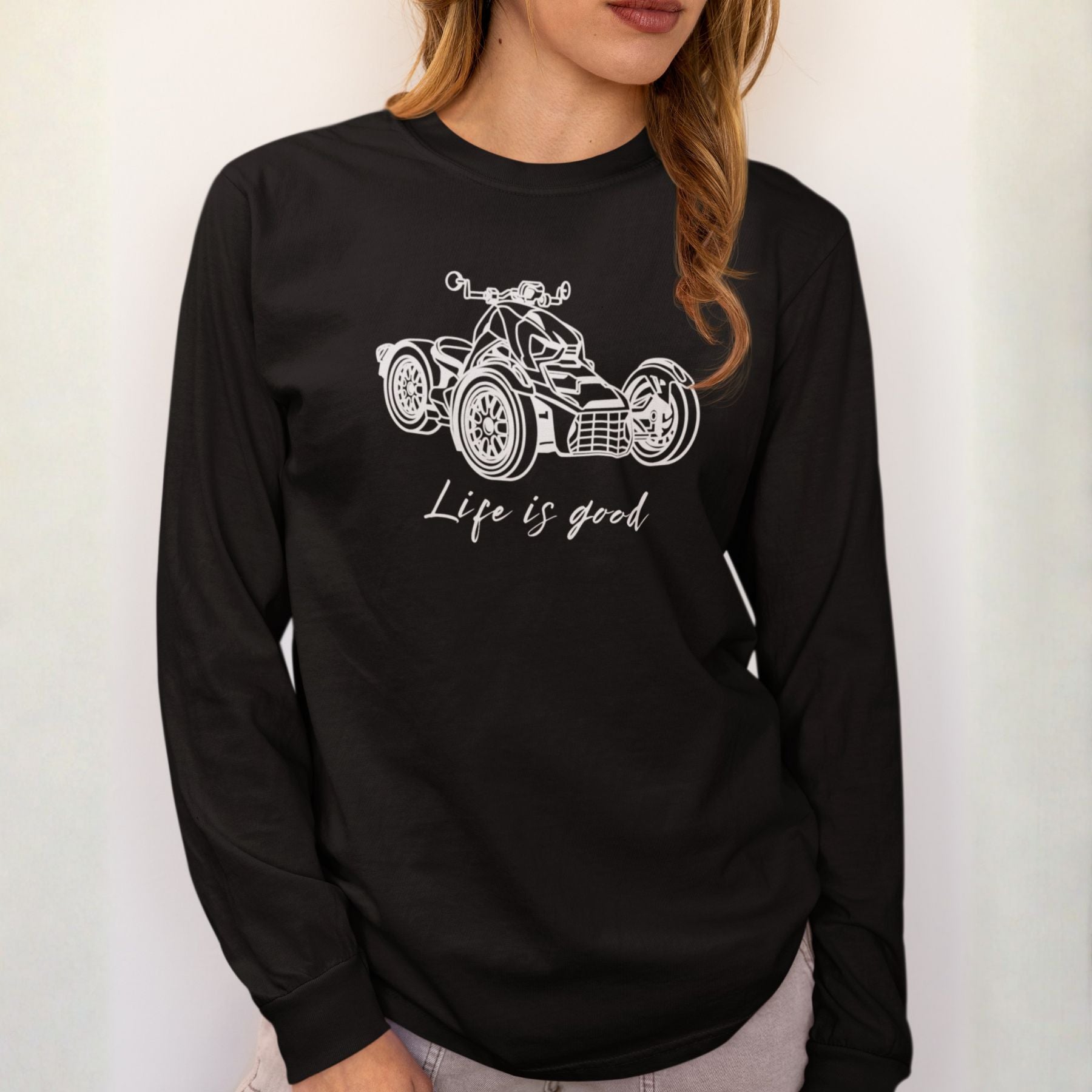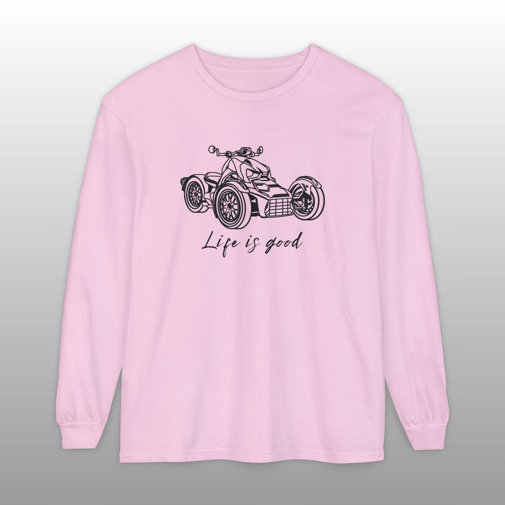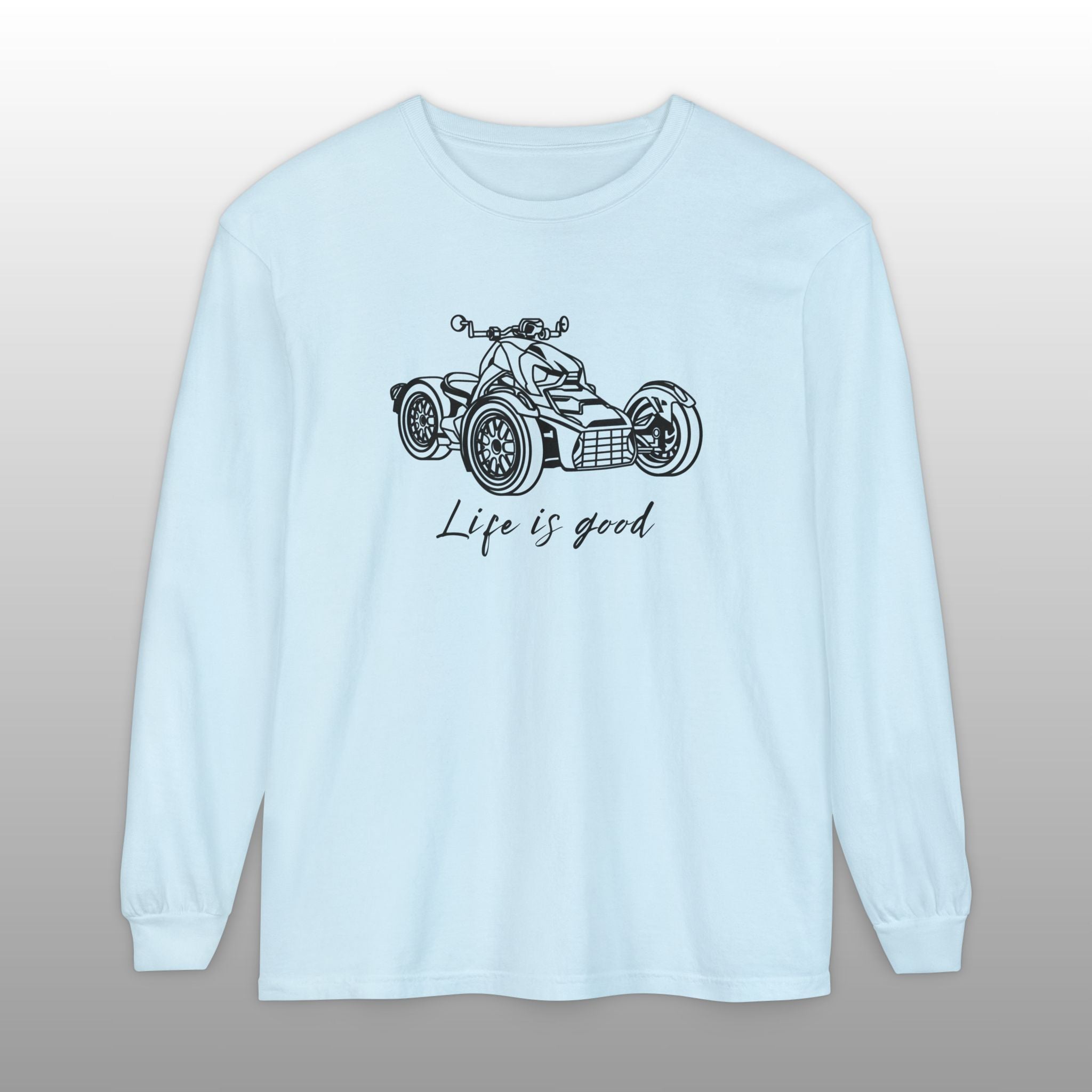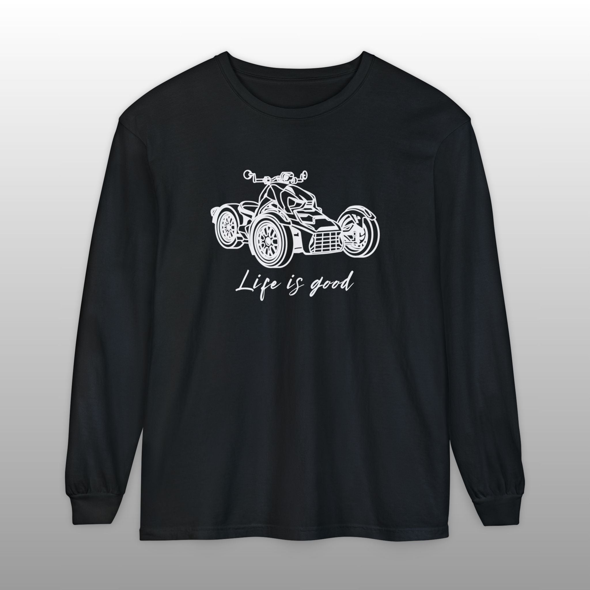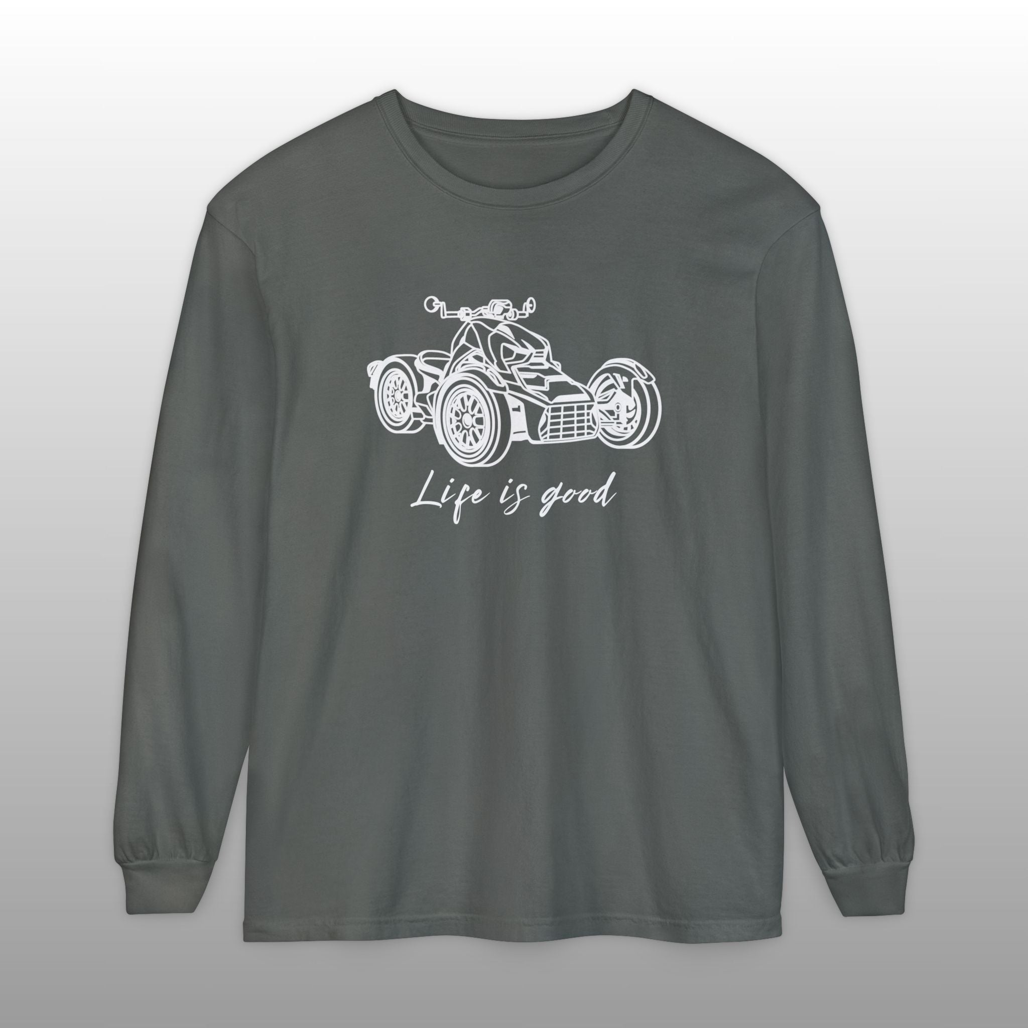 Embrace the joy of riding with this comfortable Can-Am Ryker long sleeve tee, made with the popular Comfort Colors 6014 fabric. This high-quality shirt features a detailed graphic of the iconic Can-Am Ryker and the uplifting message "Life is good" scripted below it, perfectly capturing the spirit of the open road. The garment-dyed process ensures a soft, worn-in feel and a vintage look, making it an ideal choice for the Ryker enthusiast to wear while riding or just relaxing. This durable long sleeve is a fantastic piece of Ryker apparel, an excellent motorcycle rider gift, and a stylish way for any three-wheel motorcycle owner to show their passion.