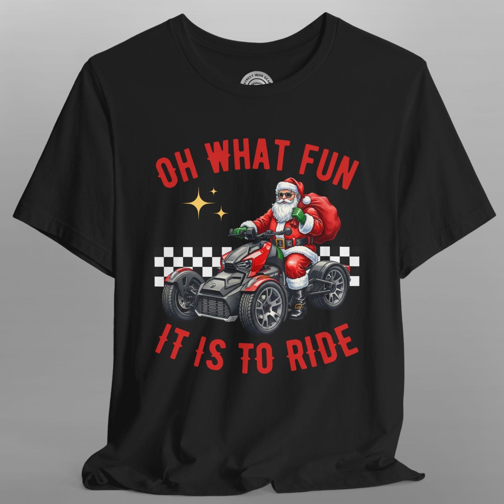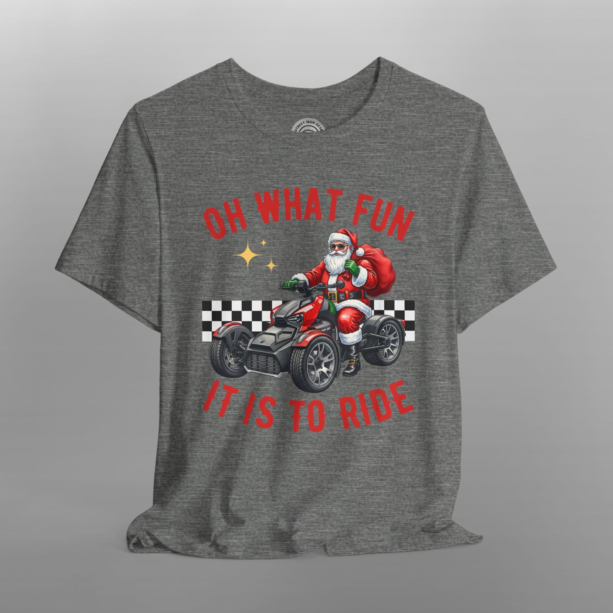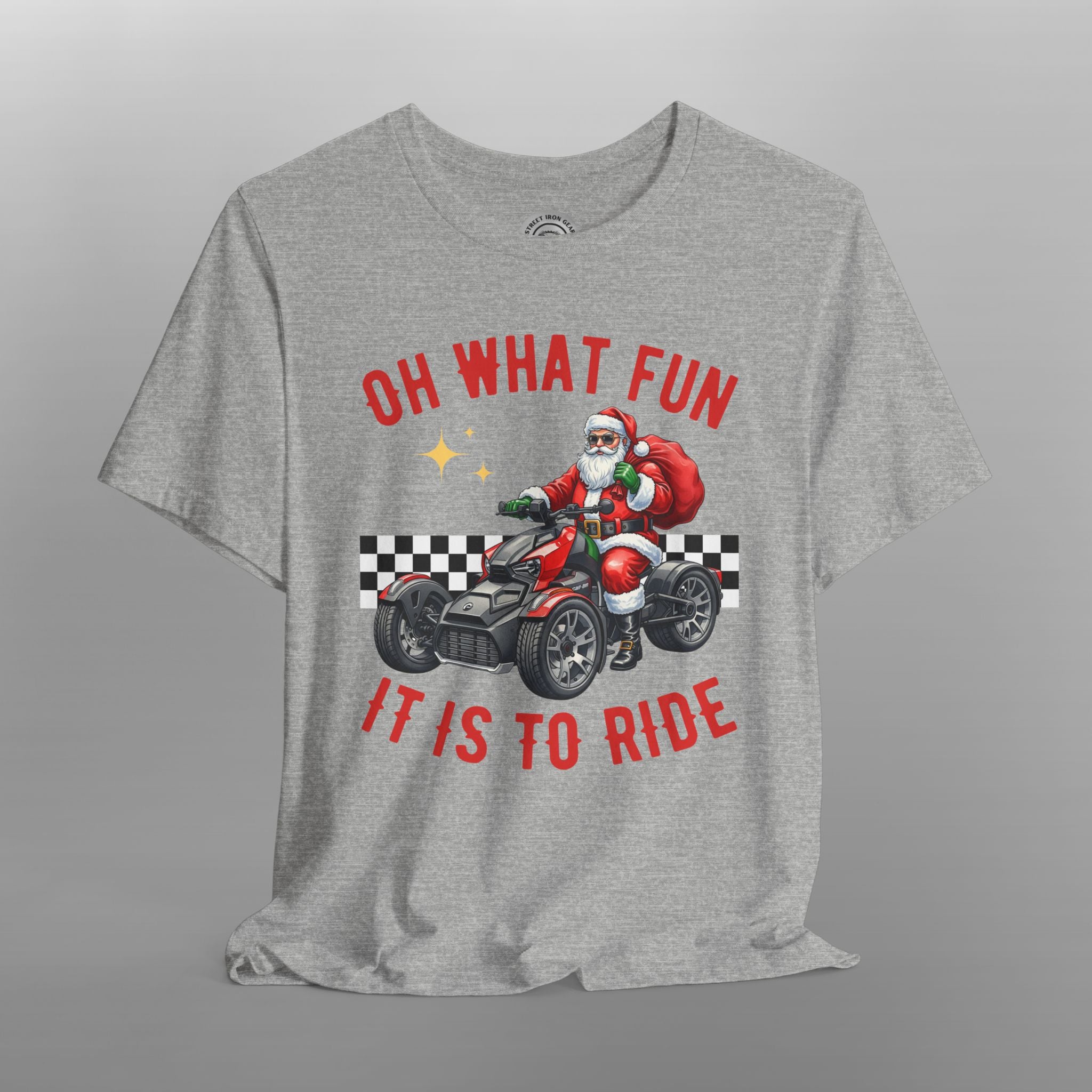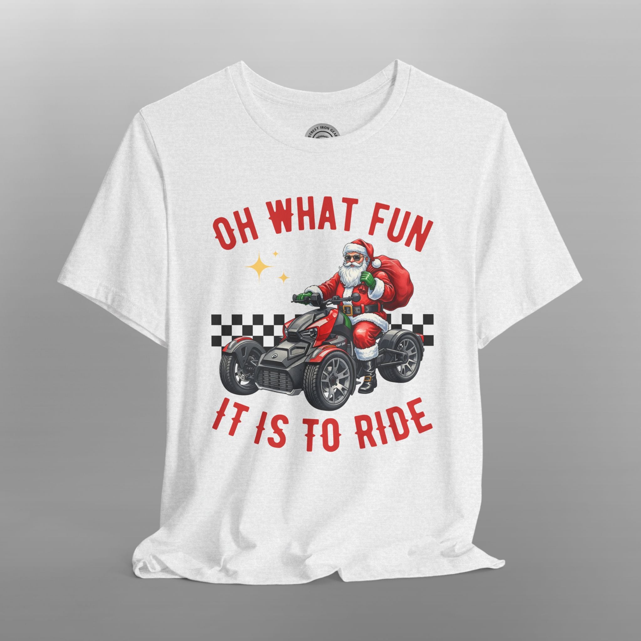 Unleash your holiday spirit on the open road with this exclusive Can-Am Ryker Christmas T-shirt! This cozy and fun tee is the perfect piece of holiday apparel for male riders who love their three-wheeled machine. The festive design features a whimsical illustration of a jolly biker on a holiday-themed trike, surrounded by classic holiday elements. The slogan "Oh What Fun It is to Ride" captures the joy of both the holiday season and life on the road. The vibrant graphics make this a stand-out piece for any Christmas party or holiday gathering. Made from a soft, high-quality fabric, this biker Christmas shirt is ideal for staying comfortable. It's a fantastic Christmas gift for a motorcycle rider, a unique addition to any rider's wardrobe, and a must-have for every Can-Am Ryker rider during the holiday season.