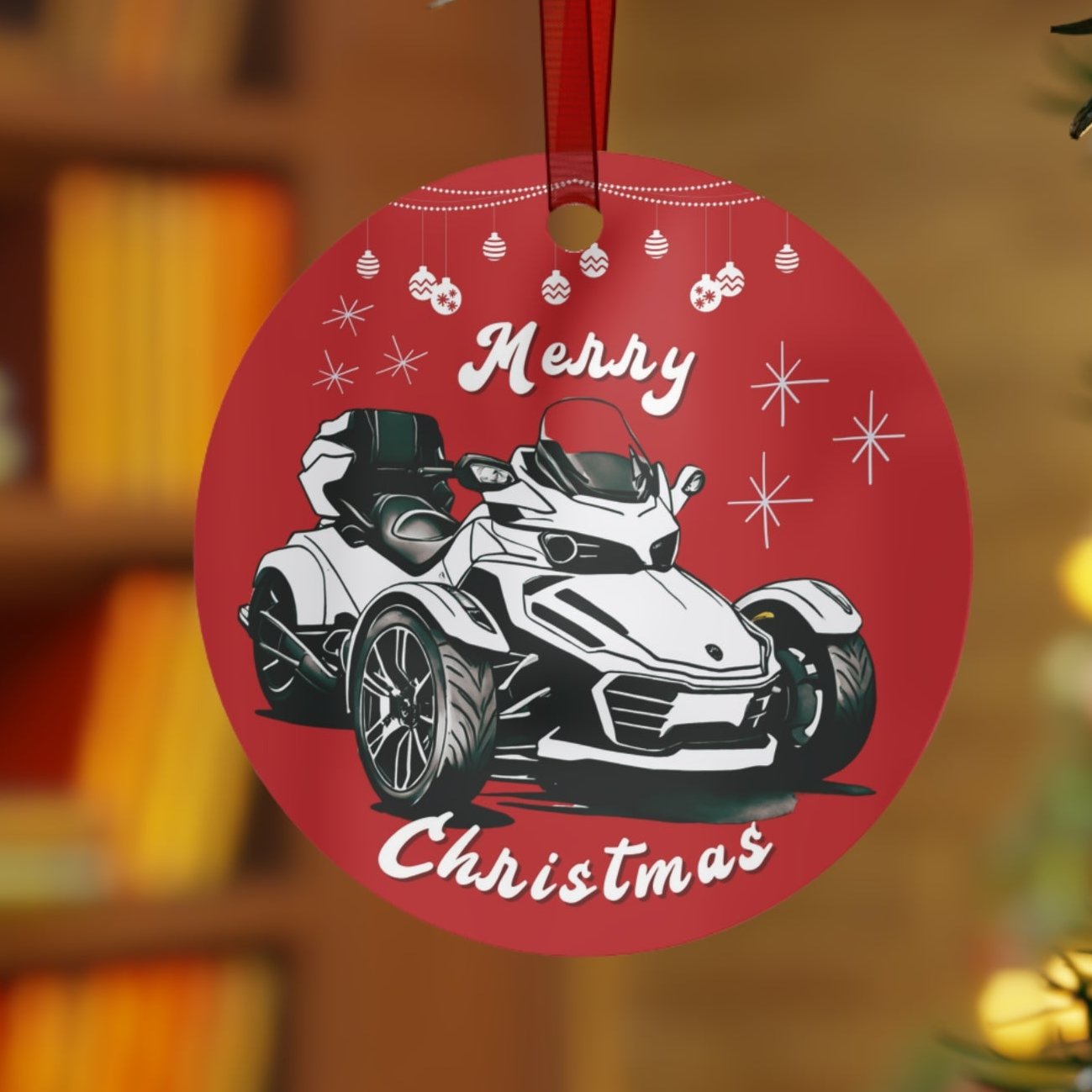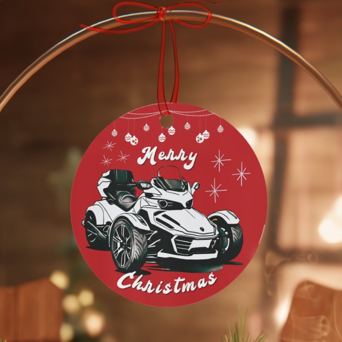 Celebrate the holiday season in style with our custom-designed Can-Am Spyder Christmas ornament! This vibrant red ornament features a beautifully detailed white and black Can-Am Spyder, accented by festive Christmas bulbs and delicate snowflakes. The cheerful "Merry Christmas" text adds the perfect holiday touch, making this ornament a must-have for any Spyder enthusiast. Perfect for decorating your tree or gifting to a fellow rider, this ornament will bring holiday cheer and show off your love for the open road.
