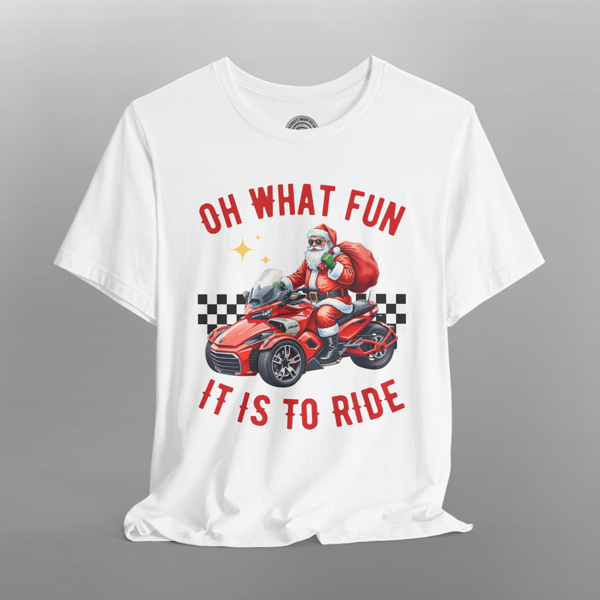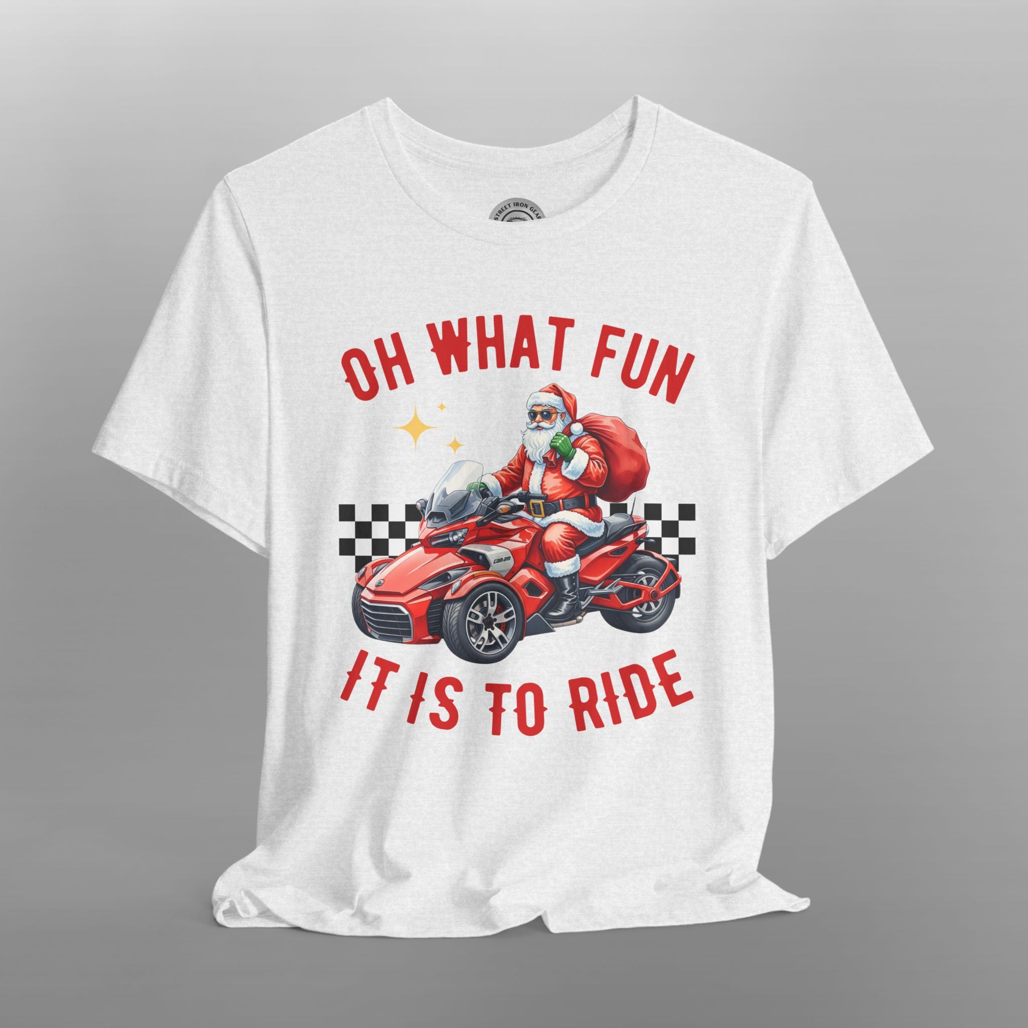 Unleash your holiday spirit on the open road with this exclusive Can-Am Spyder Christmas t-shirt! This cozy and fun tee is the perfect piece of holiday apparel for male riders who love their three-wheeled machine. The festive design features a whimsical illustration of a jolly biker on a holiday-themed trike, surrounded by classic holiday elements. The slogan "Oh What Fun It is to Ride" captures the joy of both the holiday season and life on the road. The vibrant graphics make this a stand-out piece for any Christmas party or holiday gathering. Made from a soft, high-quality fabric, this biker Christmas shirt is ideal for staying comfortable. It's a fantastic Christmas gift for a motorcycle rider, a unique addition to any rider's wardrobe, and a must-have for every Can-Am Spyder rider during the holiday season.