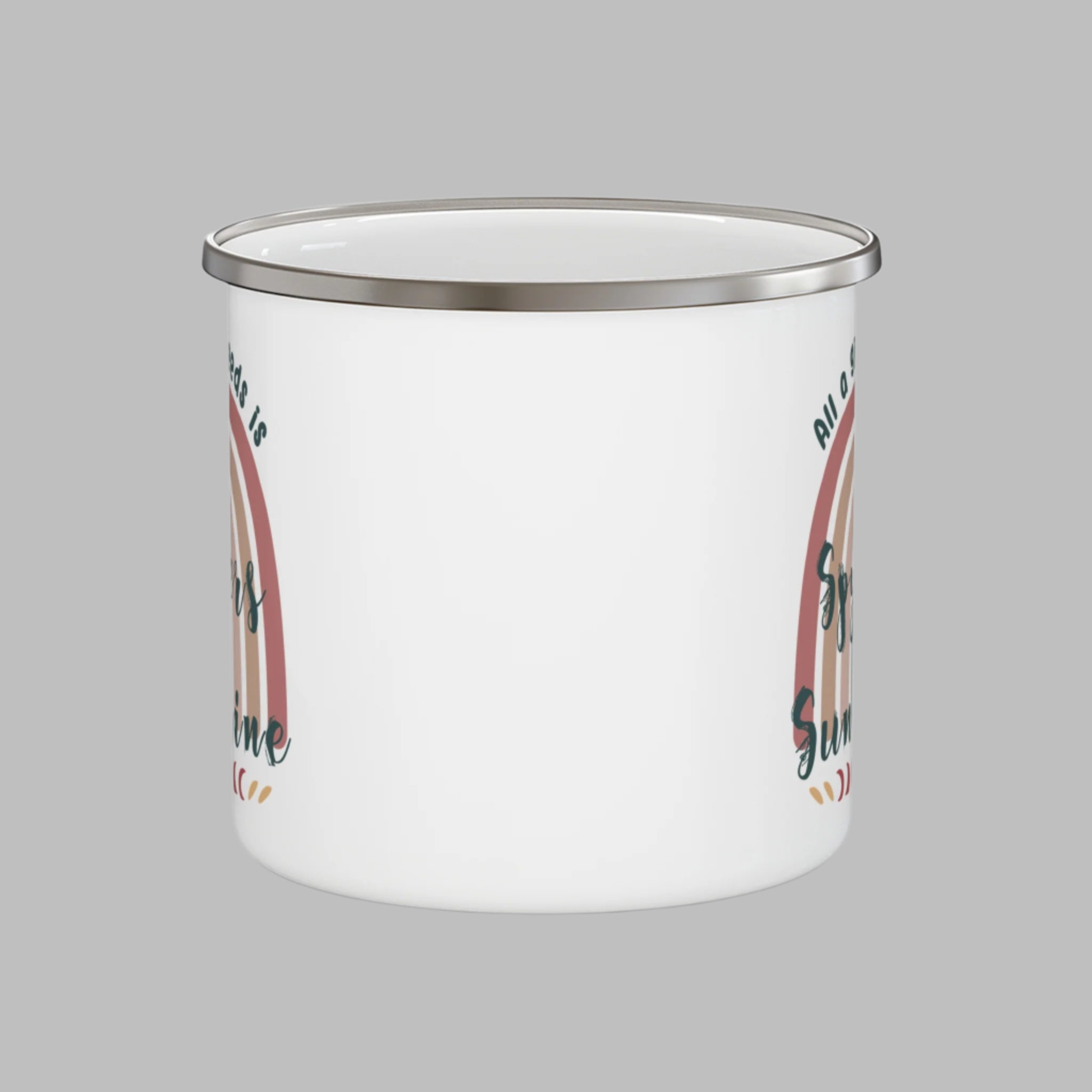 Enjoy your favorite beverage in style with our Can-Am Spyder-themed enamel camping mug, perfect for outdoor adventures and cozy mornings. Featuring a charming boho and cottage core design, this mug showcases a large rainbow in muted color tones and the phrase "All a girl needs is Spyders and Sunshine" in vibrant script, with a heart replacing the word "love." Ideal for Spyder enthusiasts, this durable and lightweight mug is great for camping, travel, or as a thoughtful gift for motorcycle lovers.