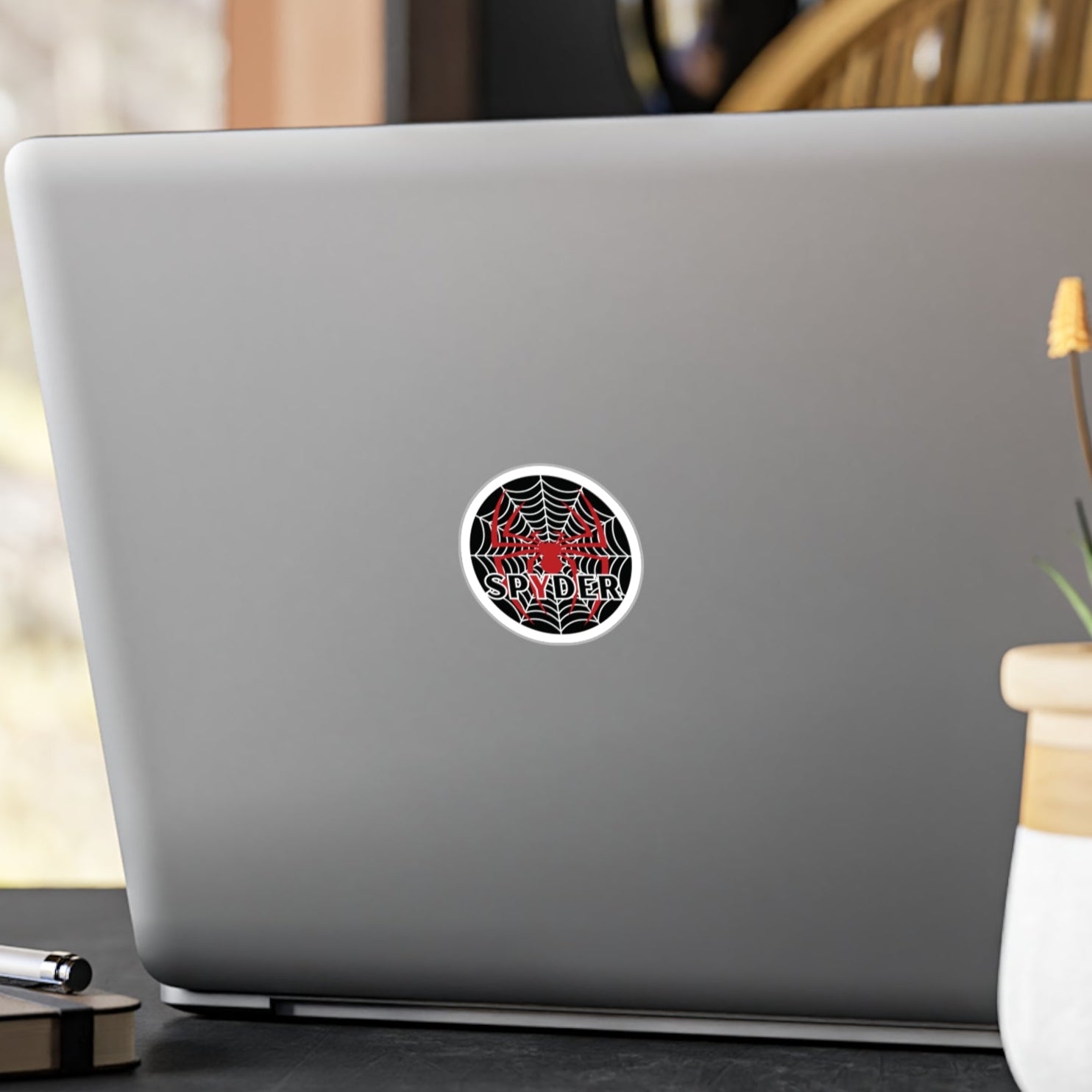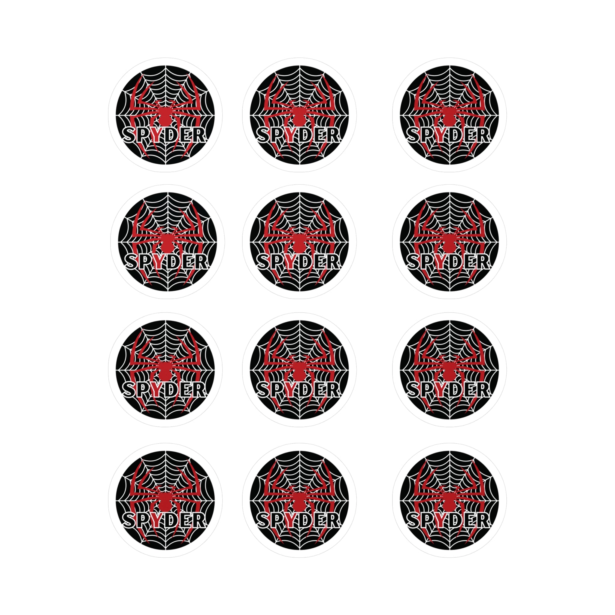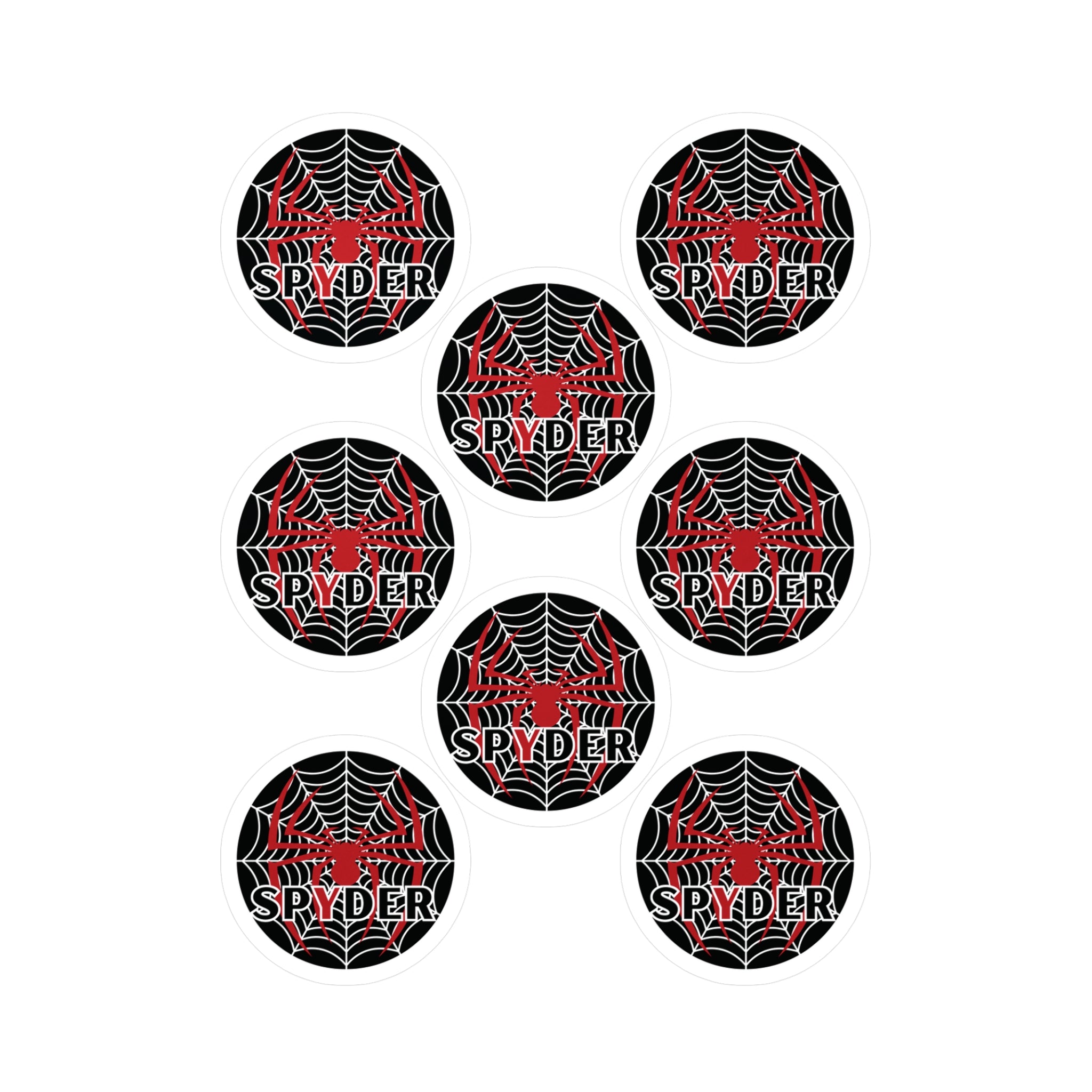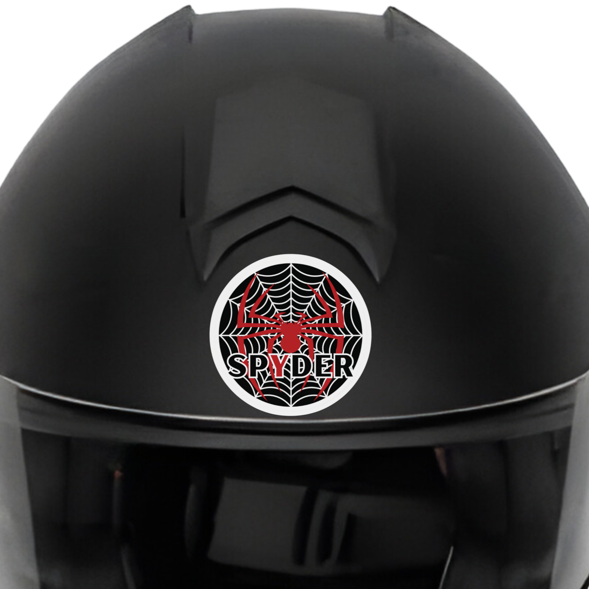 Enhance your ride with our Can-Am Spyder motorcycle decal, featuring a vivid red Spyder on a white web against a bold black background, and the prominent text "Spyder." Available in 3 sheet sizes of 2 inch round decals, these versatile decals are perfect for customizing helmets, motorcycle fenders, and car windows. Elevate your Can-Am Spyder's style and make a statement on the road with these eye-catching, high-quality decals.