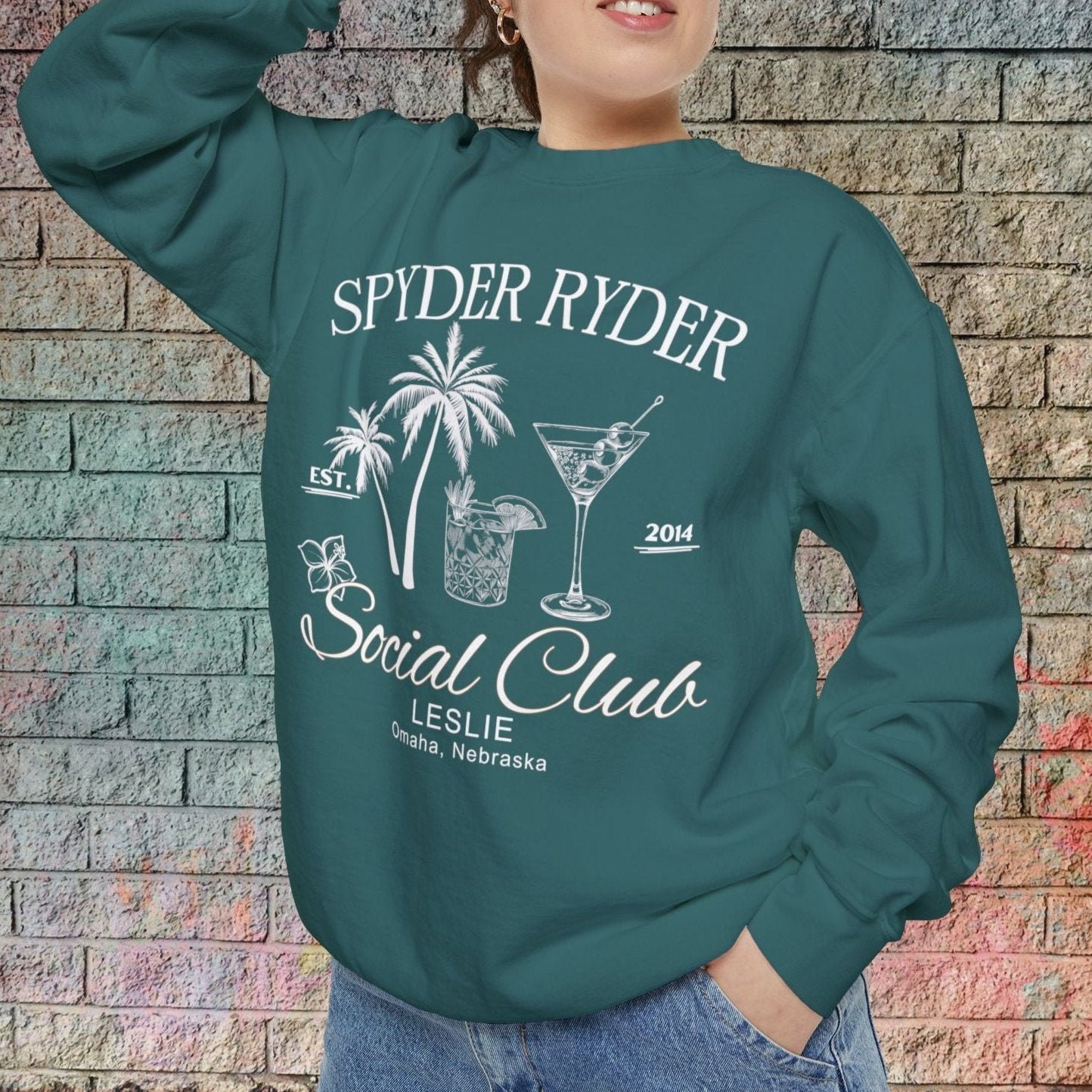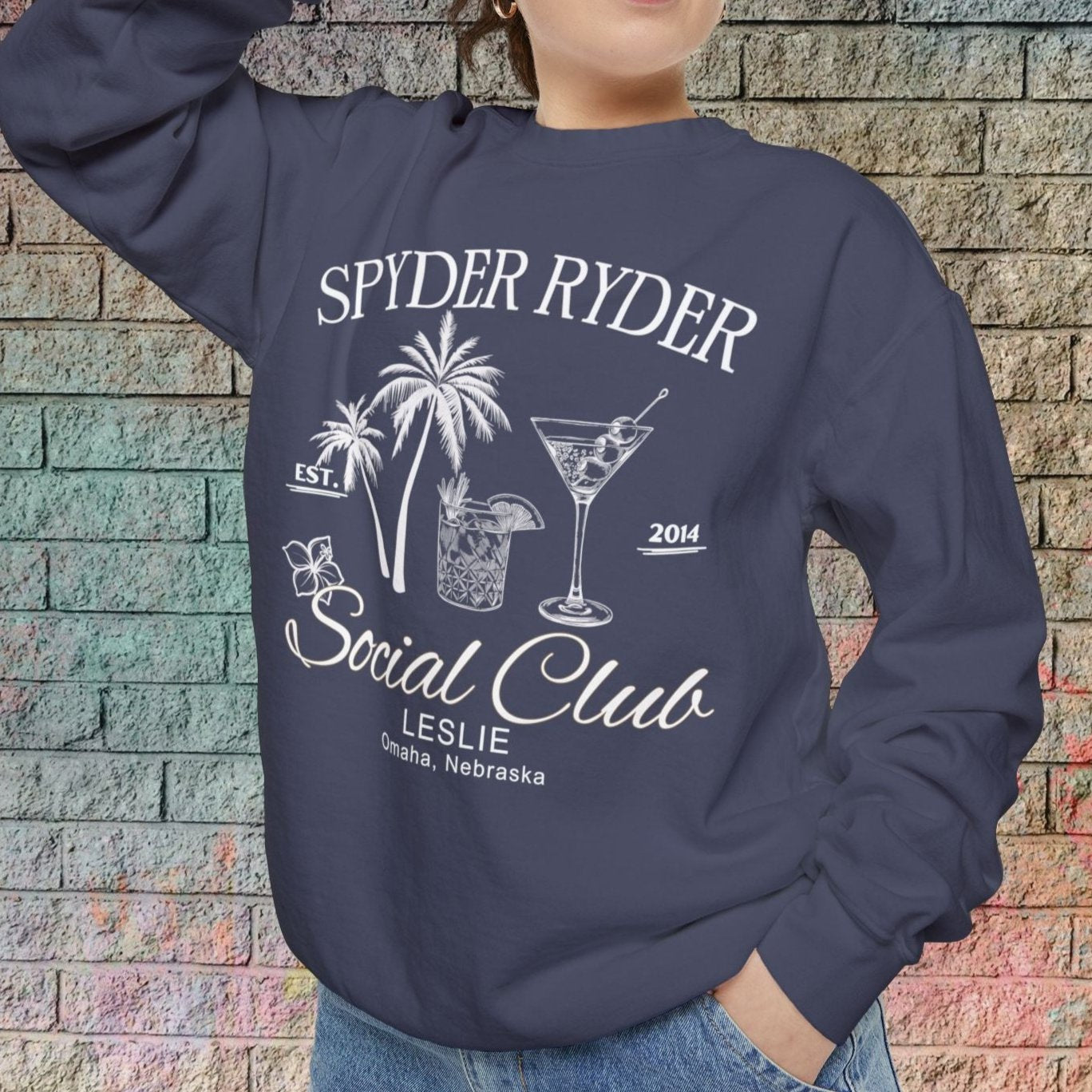 Elevate your ride with our customizable Spyder Ryders sweatshirt, featuring elegant line drawings of fancy cocktails and palm trees. Perfect for individual riders or local Can-Am Spyder groups, you can personalize it with your name and location to make it uniquely yours. Celebrate your love for the open road in style with this exclusive design from StreetIronGear.com!