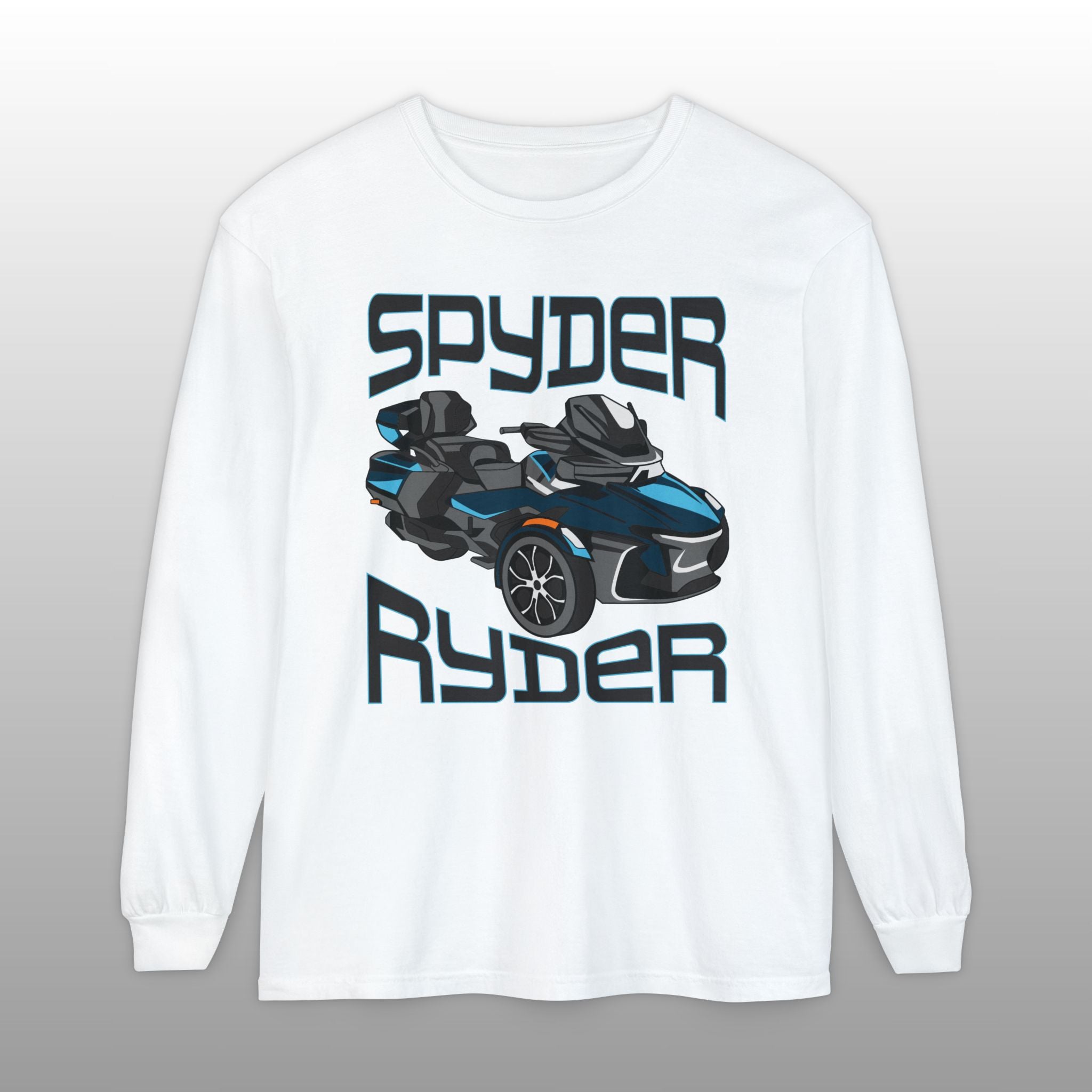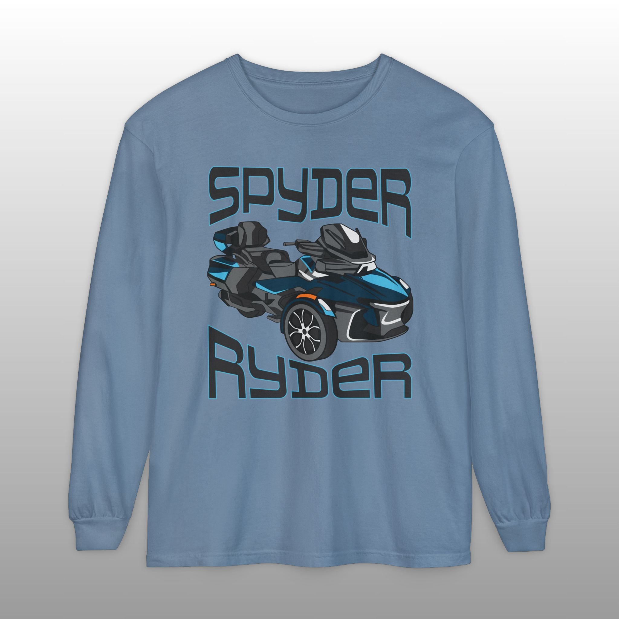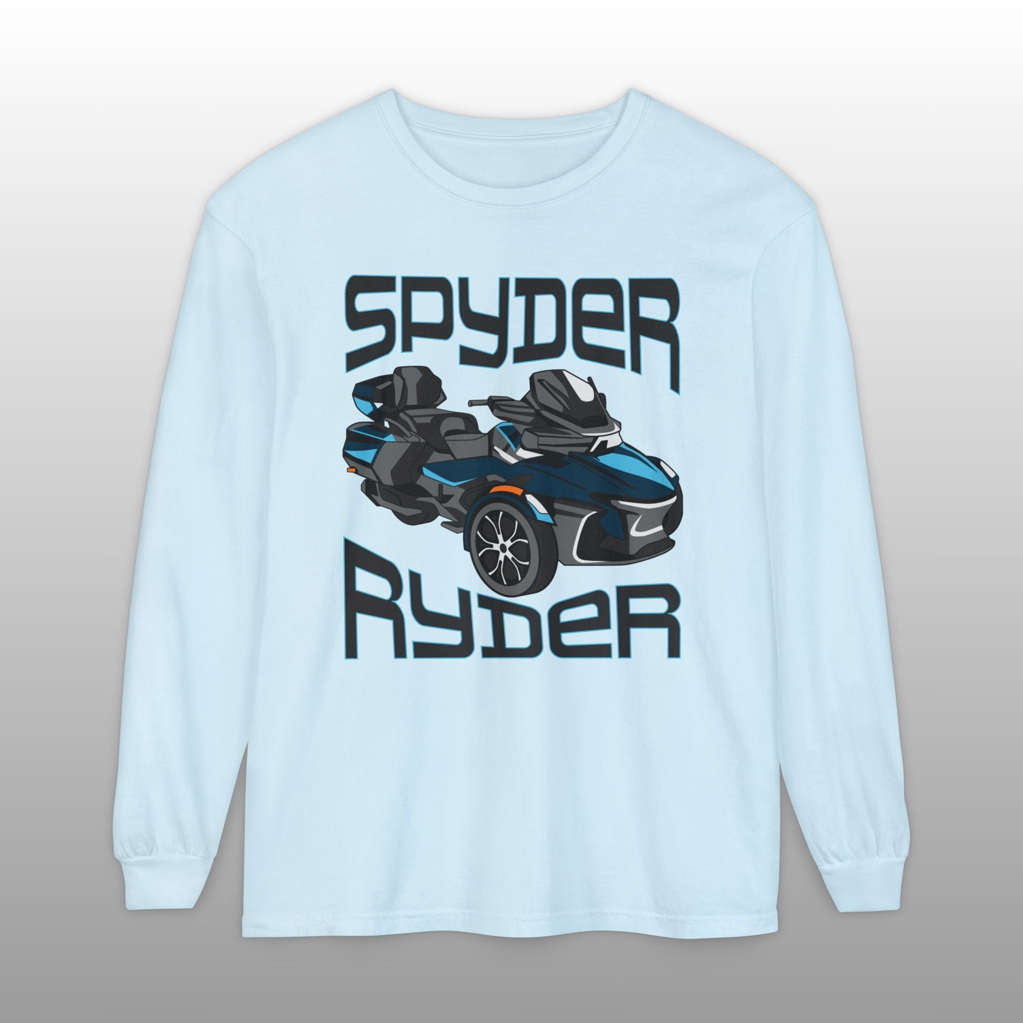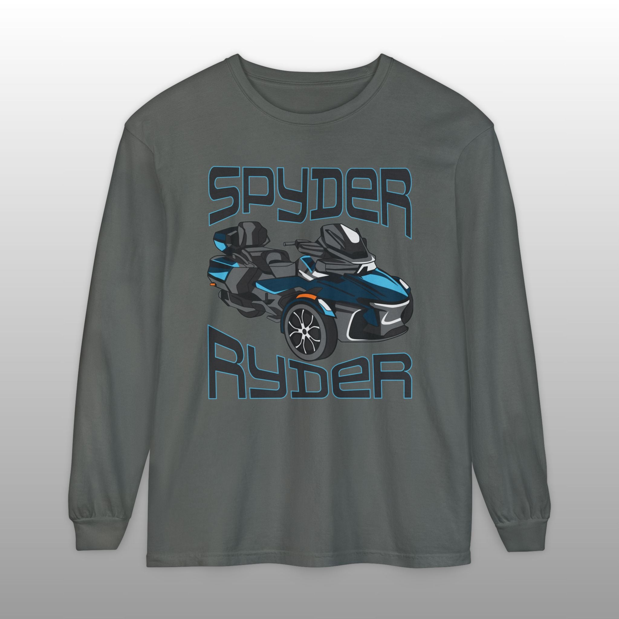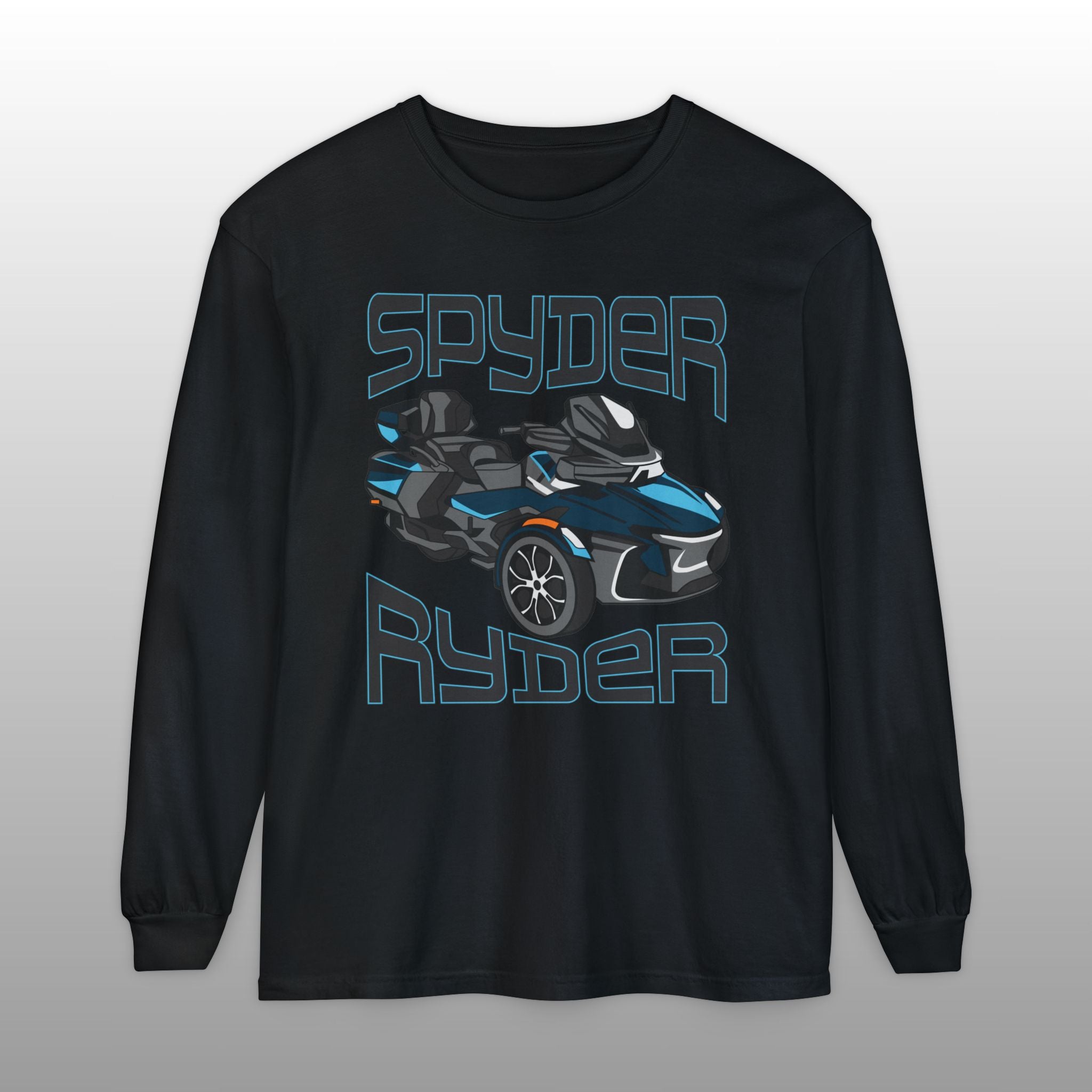 Hit the open road in ultimate comfort with this Can-Am Spyder RT long sleeve t-shirt, made using the ultra-soft Comfort Colors 6014 fabric. This shirt is a must-have piece of Spyder rider apparel, perfect for both men and women who love their three-wheel vehicle. The eye-catching design features a detailed graphic of the iconic Can-Am Spyder RT in a striking teal blue and black color scheme, with the bold declaration "Spyder Ryder" prominently displayed. Ideal for cooler riding days, layering, or casual wear, this high-quality, garment-dyed tee is a great motorcycle enthusiast gift and the perfect way to showcase your passion for the BRP Can-Am brand and the Spyder RT model.