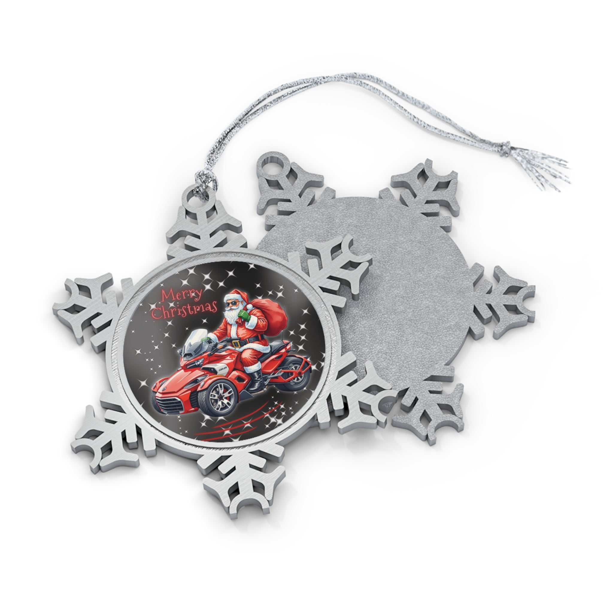 Celebrate the holidays in true rider style with this unique Can-Am Spyder Christmas Ornament, perfect for fans of three-wheeled adventure! This beautifully detailed, double-sided ornament features Santa Claus riding a red and black Can-Am Spyder as he delivers gifts under a starry night sky, with festive "Merry Christmas" lettering completing the cheerful design. The round image is elegantly encased in a durable pewter snowflake frame, adding a touch of classic holiday charm to your Christmas tree.