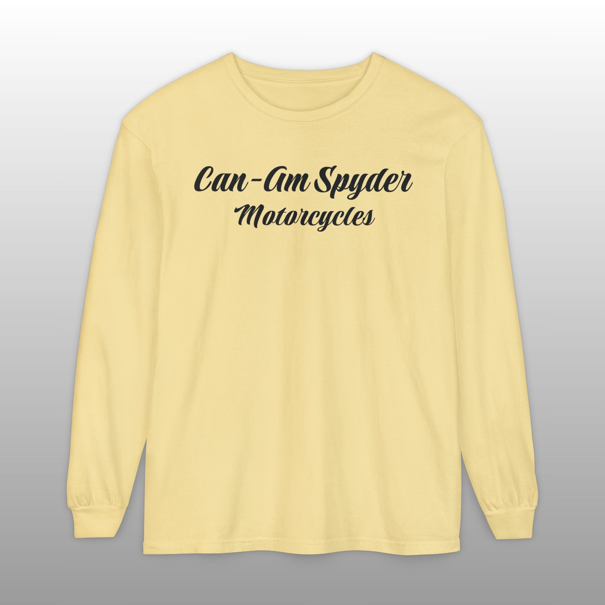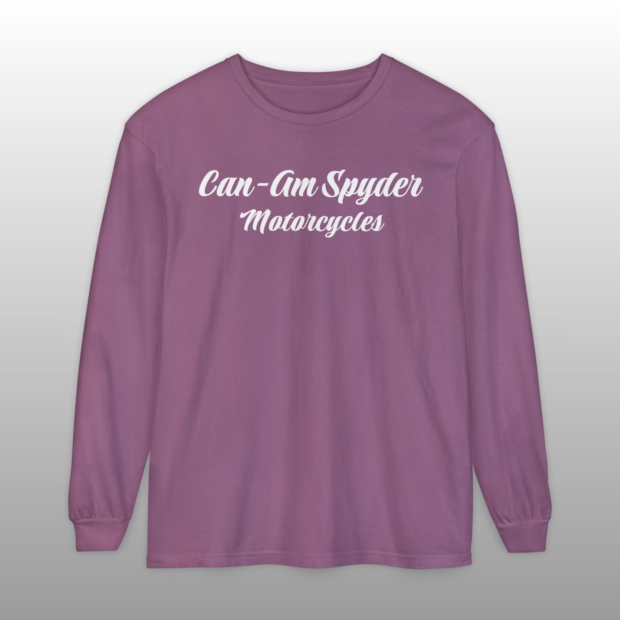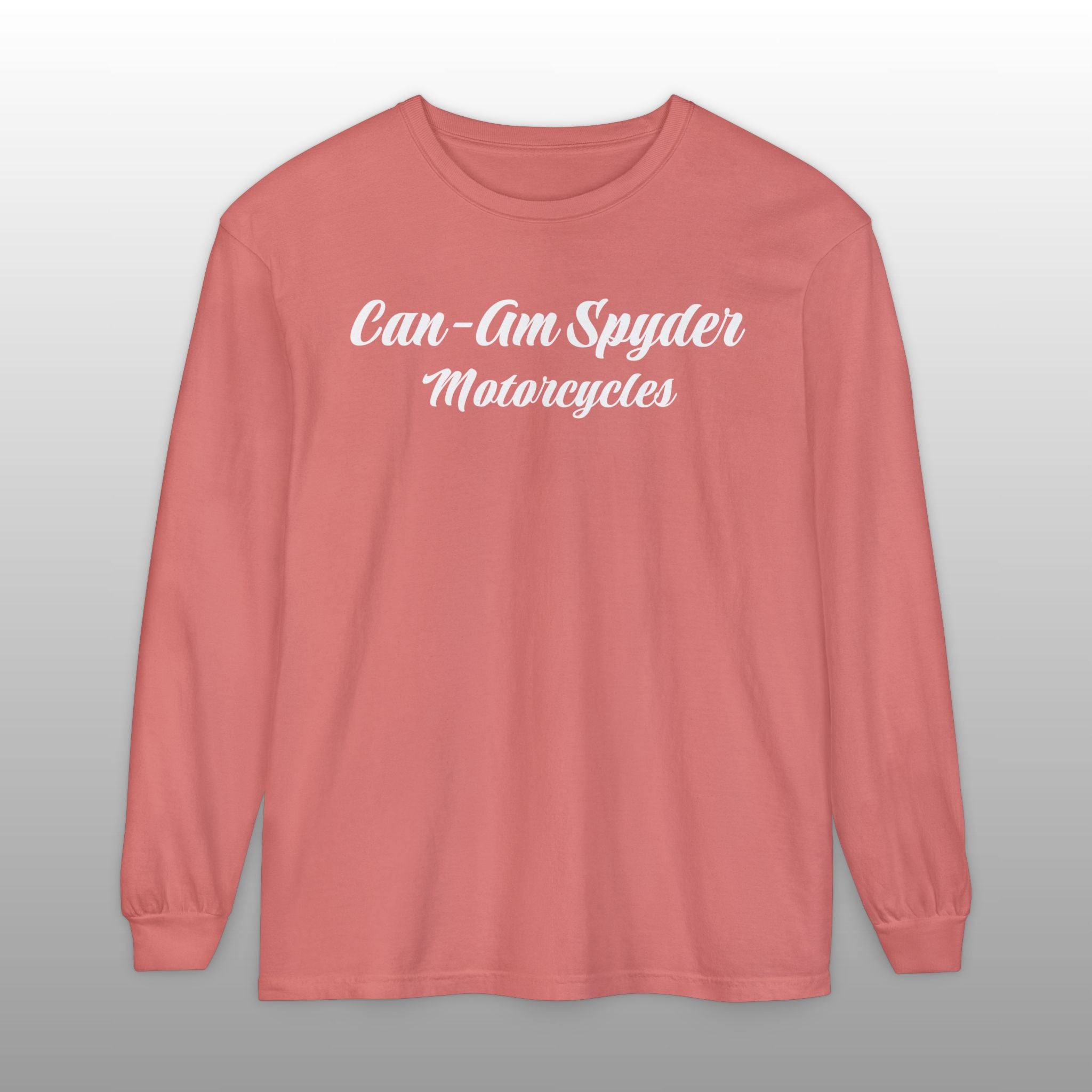 Show your love for the open road with this stylish and comfortable Can-Am Spyder long-sleeve tee. This premium shirt features a clean, classic design perfect for any Spyder rider or enthusiast. The shirt's simple yet elegant graphic showcases a graceful, flowing script spelling out "Can-Am Spyder", with the word "Motorcycles" scripted in a smaller, complementary font just below. This tasteful and minimalist design is a subtle nod to your favorite ride. Made from the exceptionally soft, garment-dyed cotton that Comfort Colors is known for, this long-sleeve tee offers a relaxed fit and a vintage feel. It's the ideal shirt for layering on a cool morning ride or for a casual day out. This motorcycle apparel also makes a fantastic gift for any lady Spyder owner.