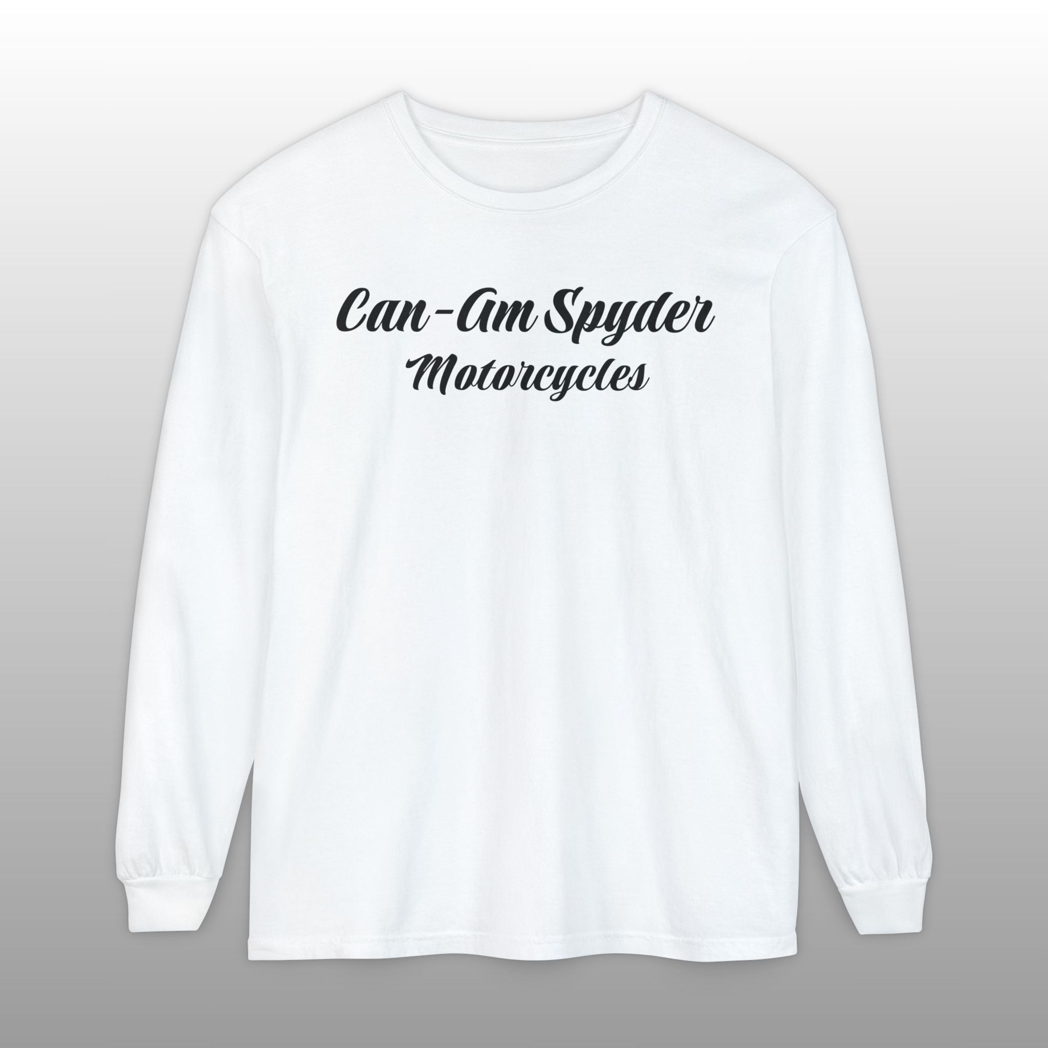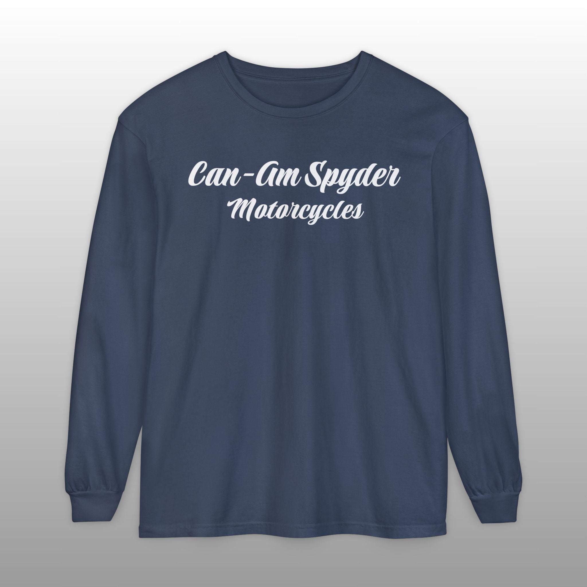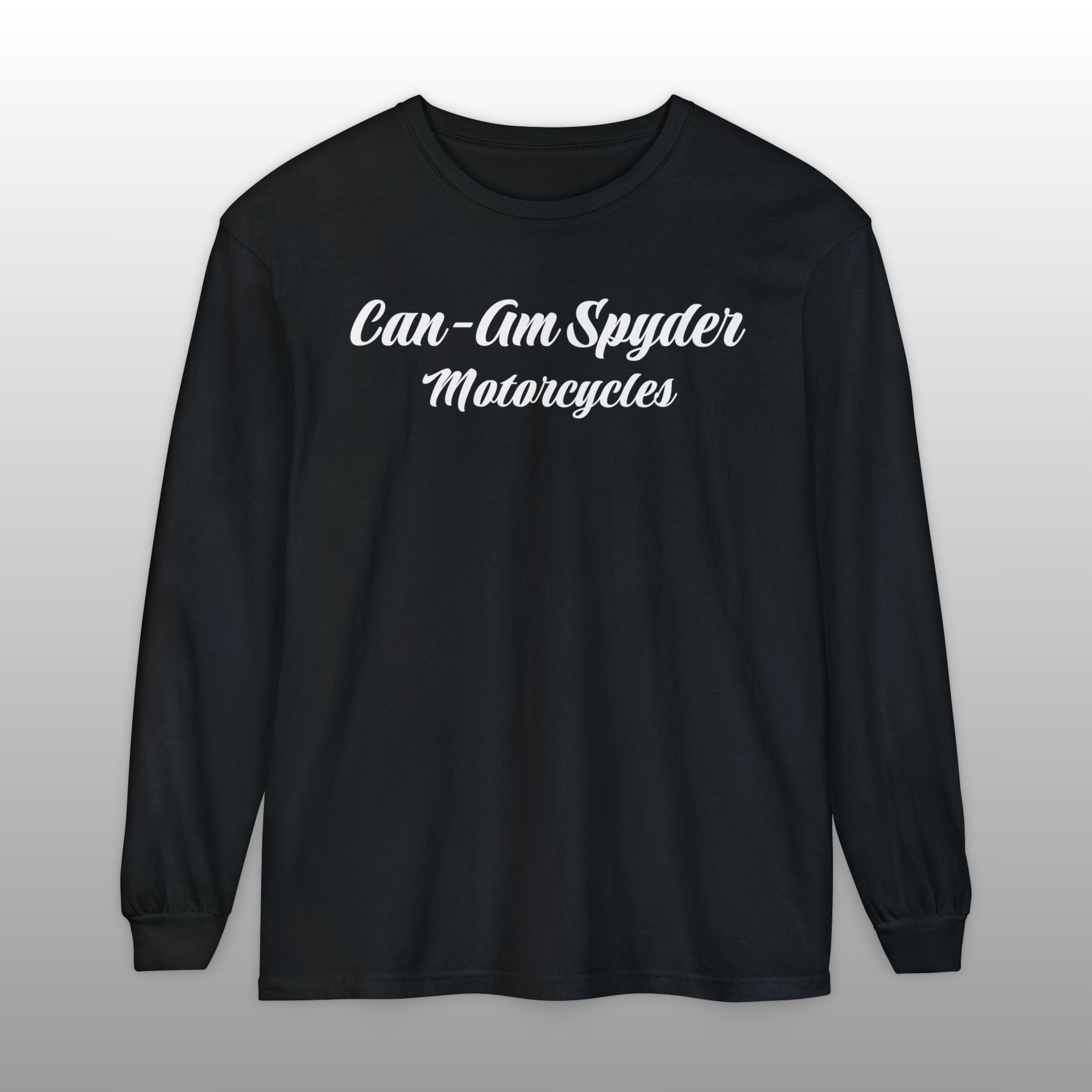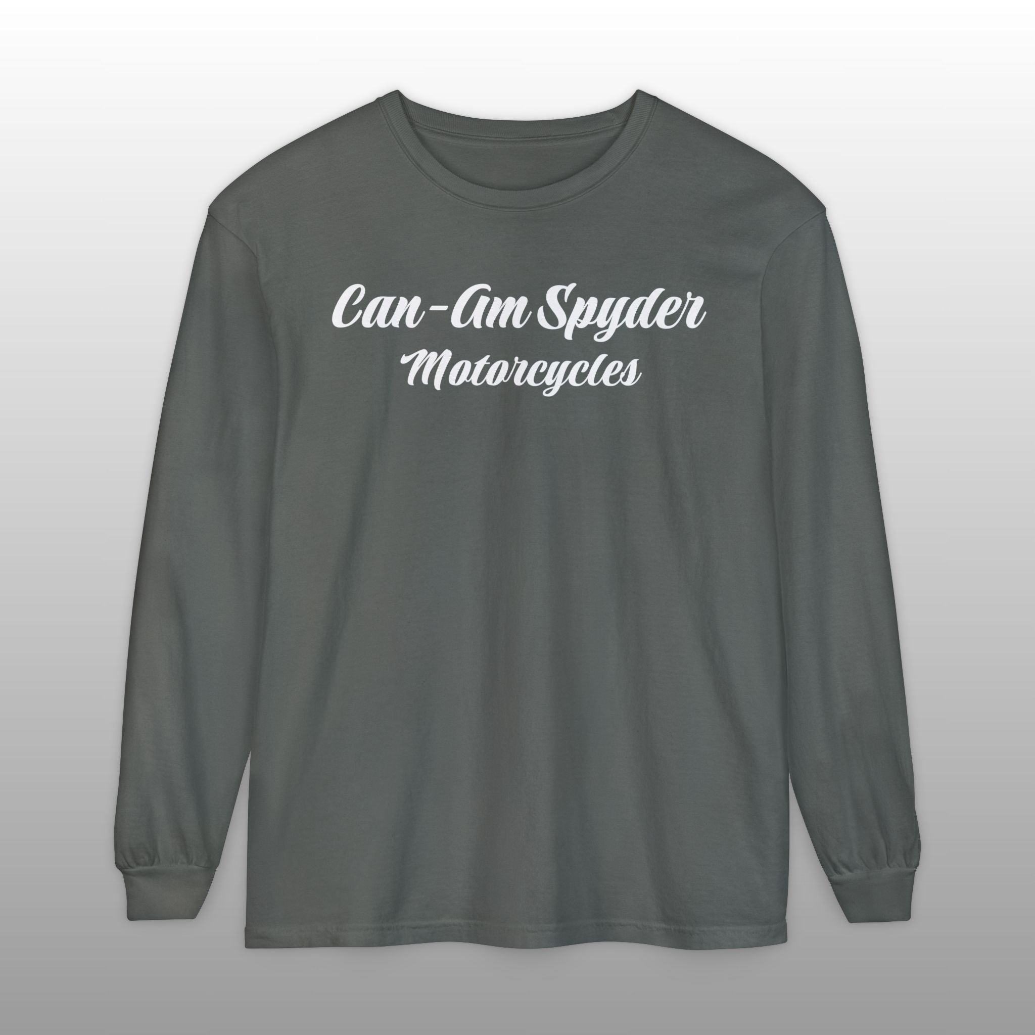 Show your love for the open road with this stylish and comfortable Can-Am Spyder long-sleeve tee. This premium shirt features a clean, classic design perfect for any Spyder rider or enthusiast. The shirt's simple yet elegant graphic showcases a graceful, flowing script spelling out "Can-Am Spyder", with the word "Motorcycles" scripted in a smaller, complementary font just below. This tasteful and minimalist design is a subtle nod to your favorite ride. Made from the exceptionally soft, garment-dyed cotton that Comfort Colors is known for, this long-sleeve tee offers a relaxed fit and a vintage feel. It's the ideal shirt for layering on a cool morning ride or for a casual day out. This motorcycle apparel also makes a fantastic gift for any lady Spyder owner.
