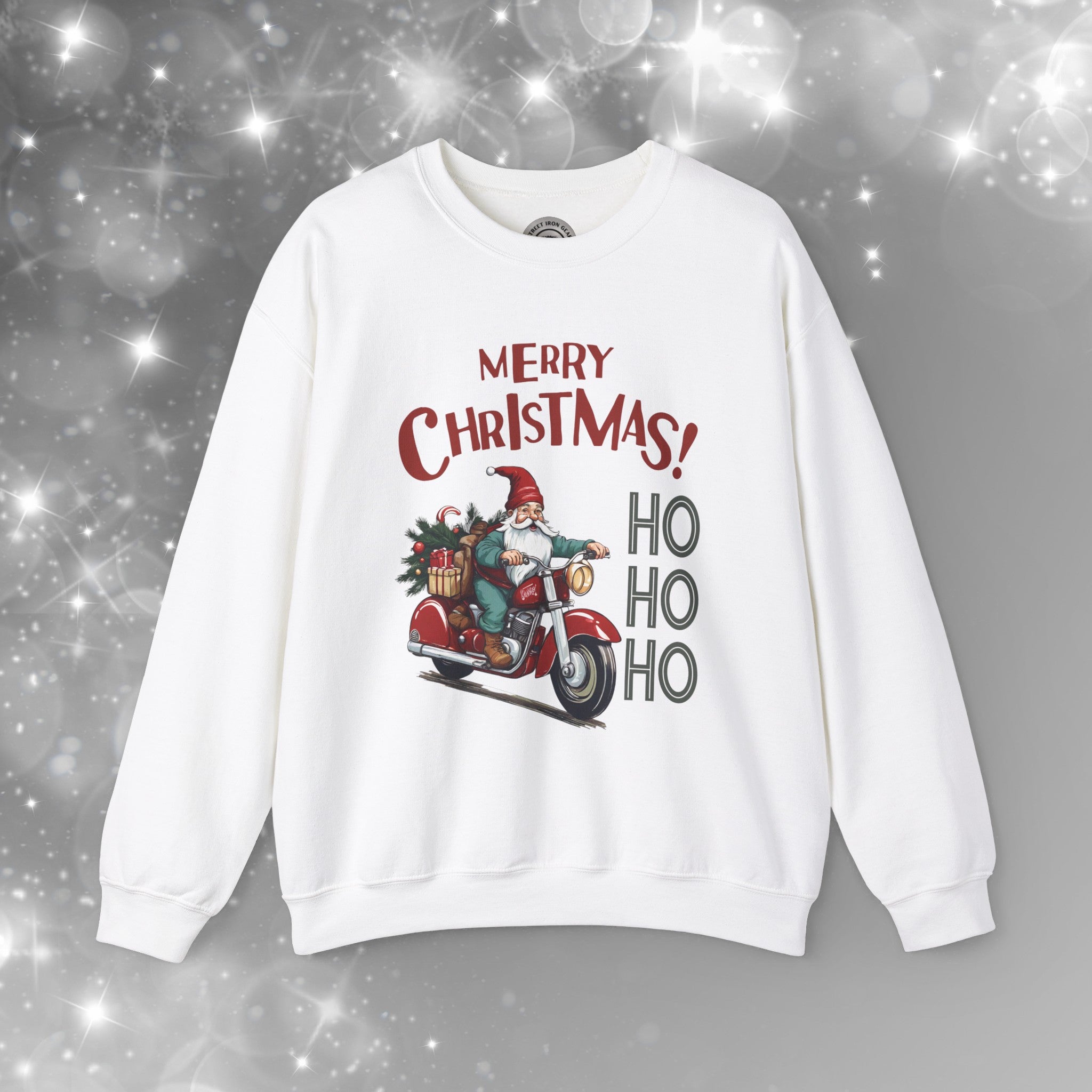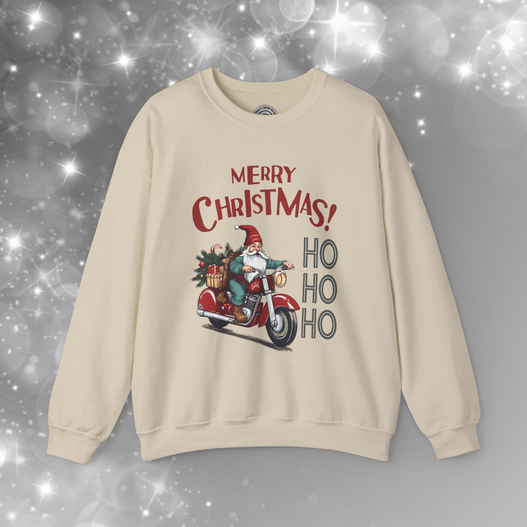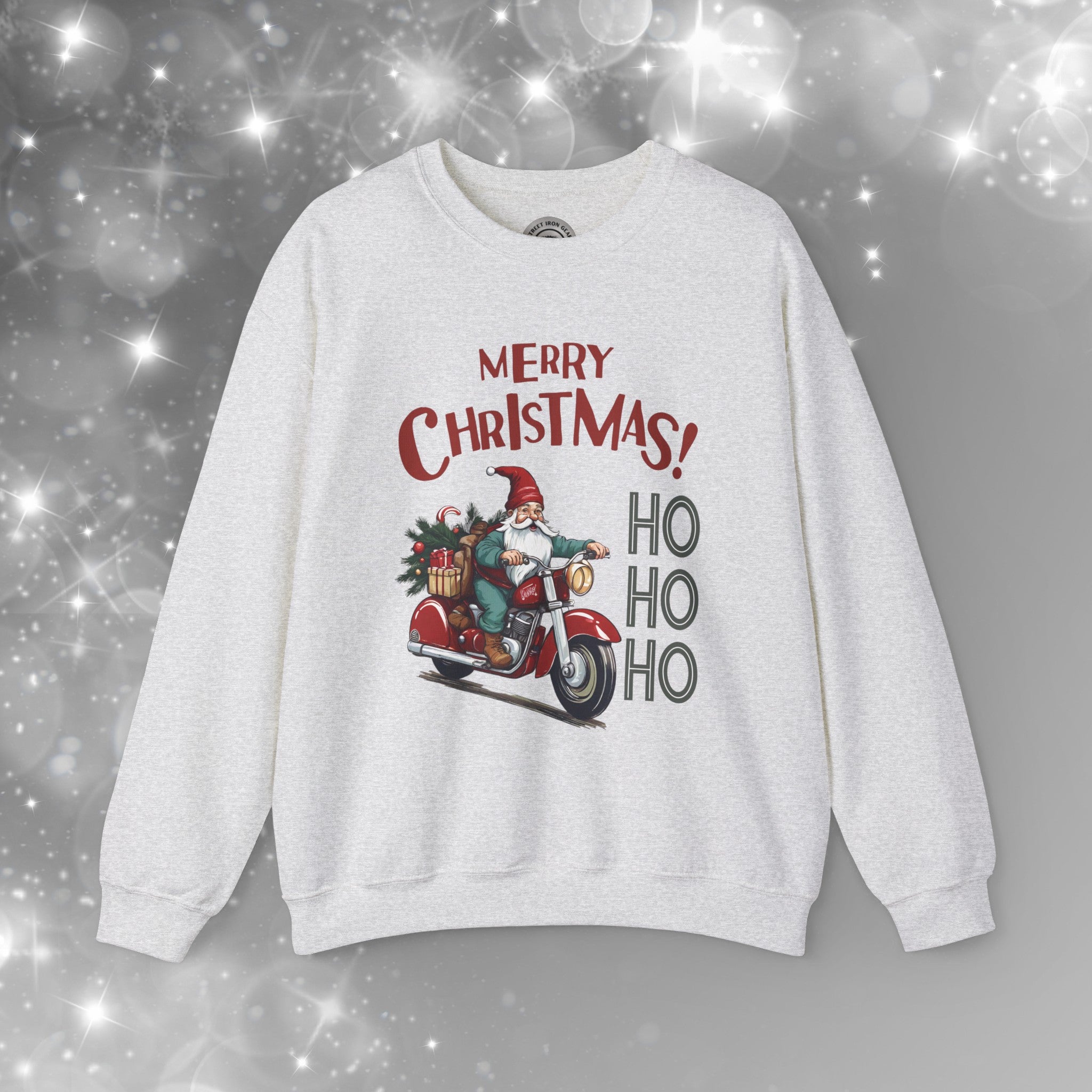 Celebrate the season in style with our Cute Christmas Sweatshirt! This festive delight features the cheerful message "Merry Christmas, Ho Ho Ho" paired with a vintage gnome Santa cruising on a red motorcycle, presents in tow.