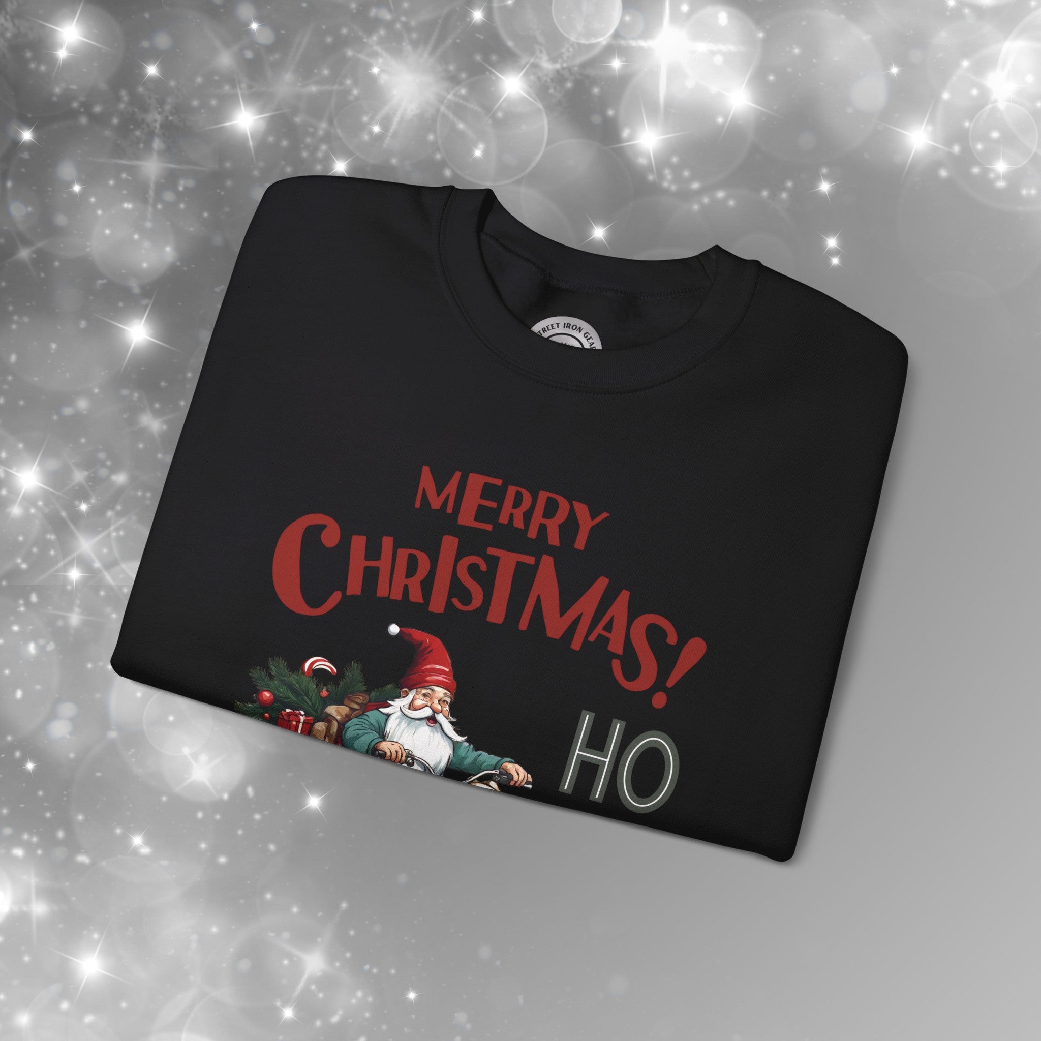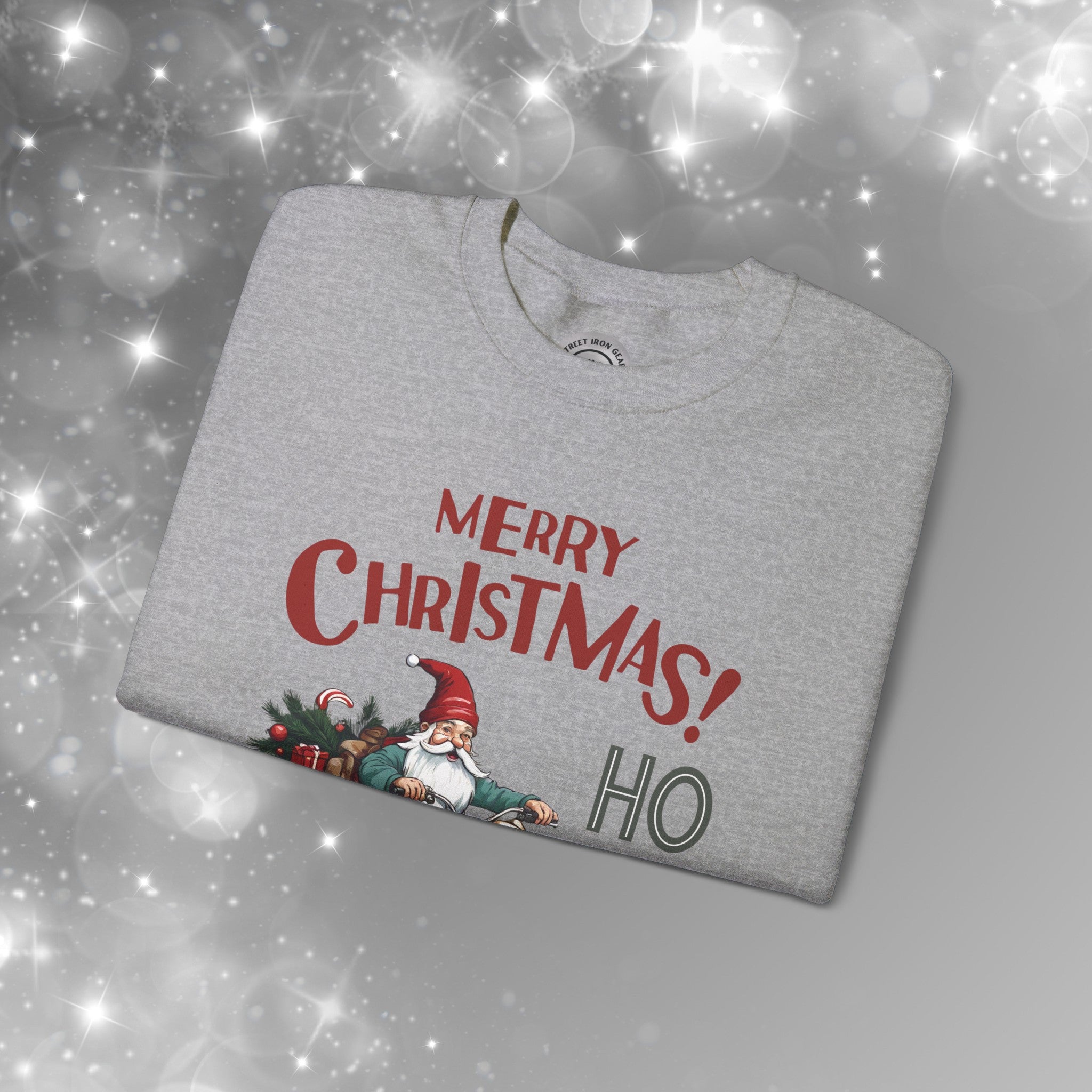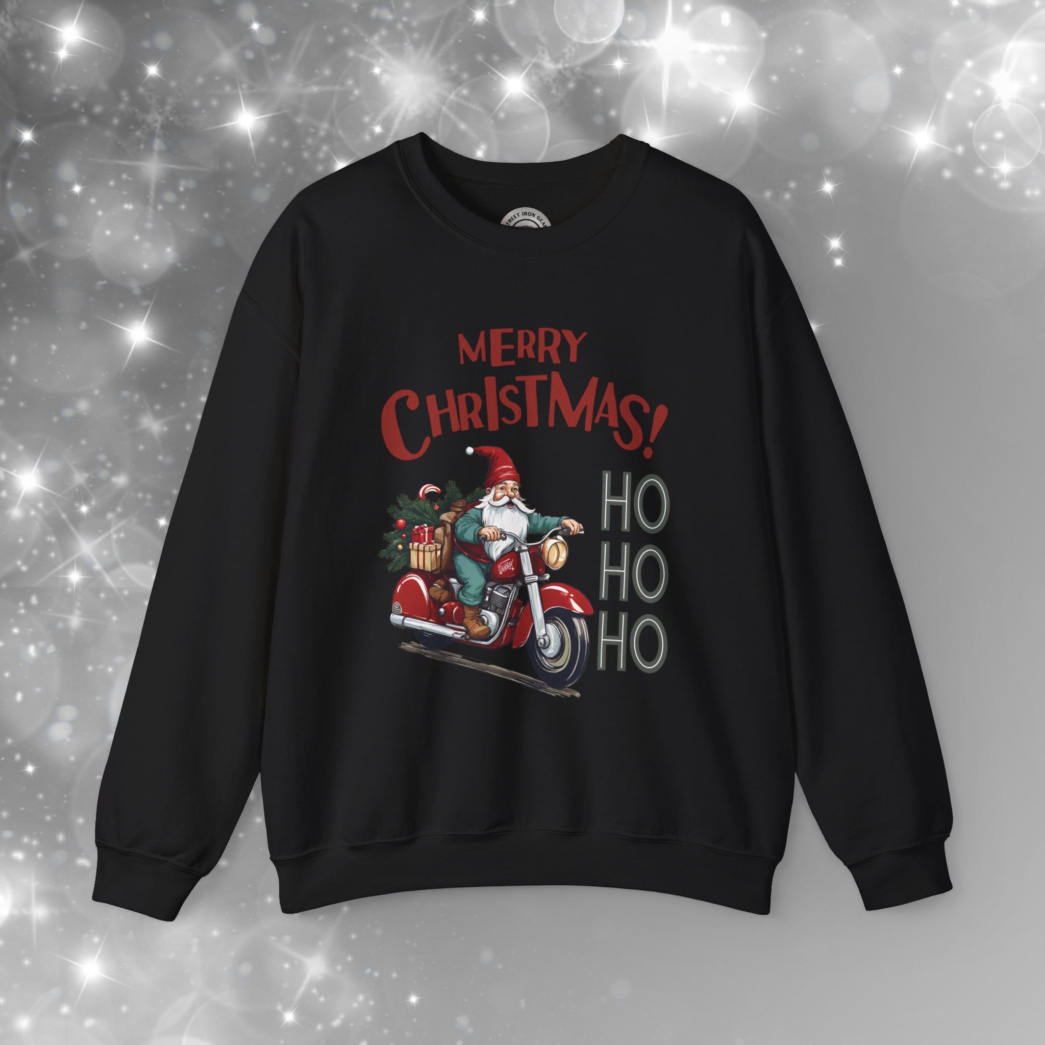 Celebrate the season in style with our Cute Christmas Sweatshirt! This festive delight features the cheerful message "Merry Christmas, Ho Ho Ho" paired with a vintage gnome Santa cruising on a red motorcycle, presents in tow.