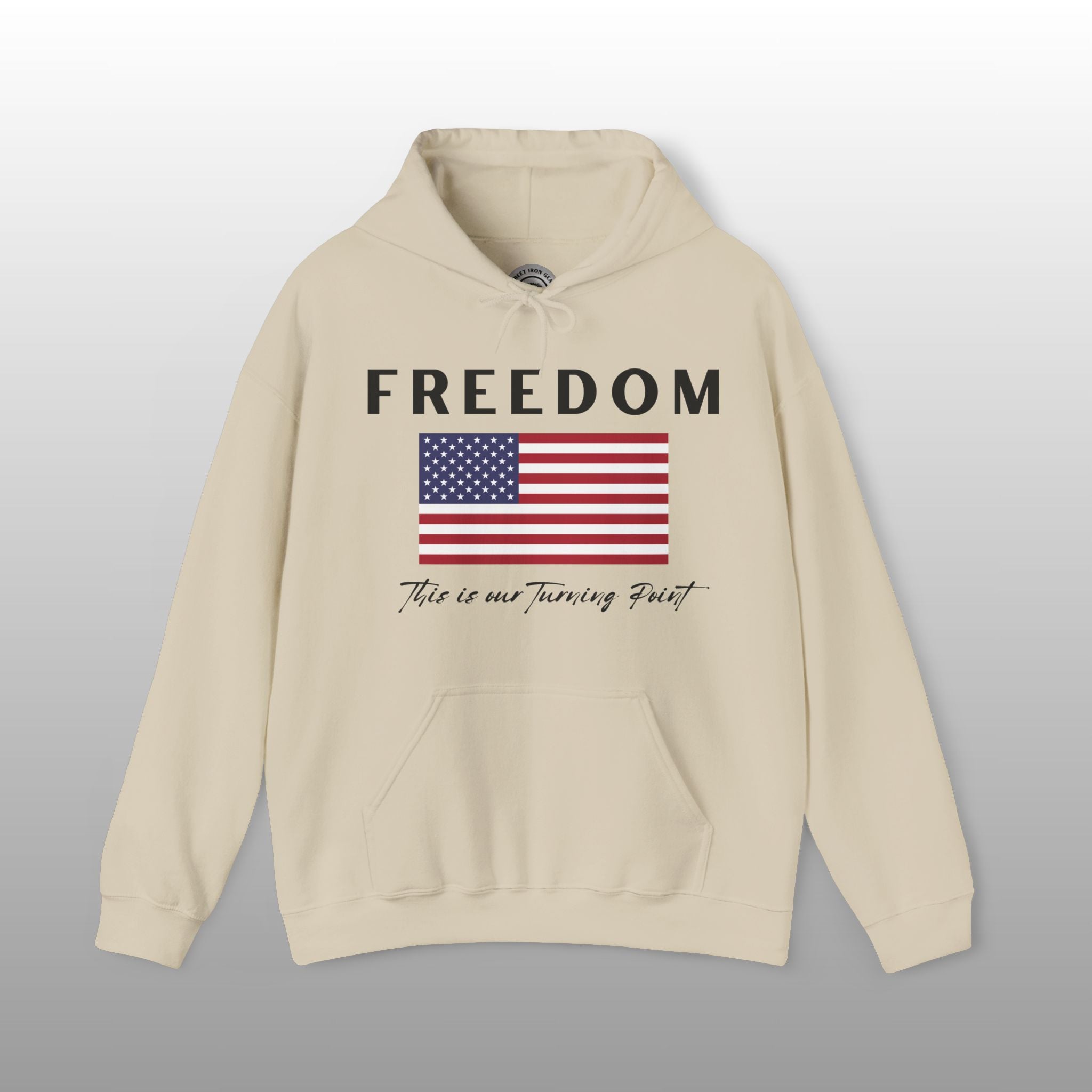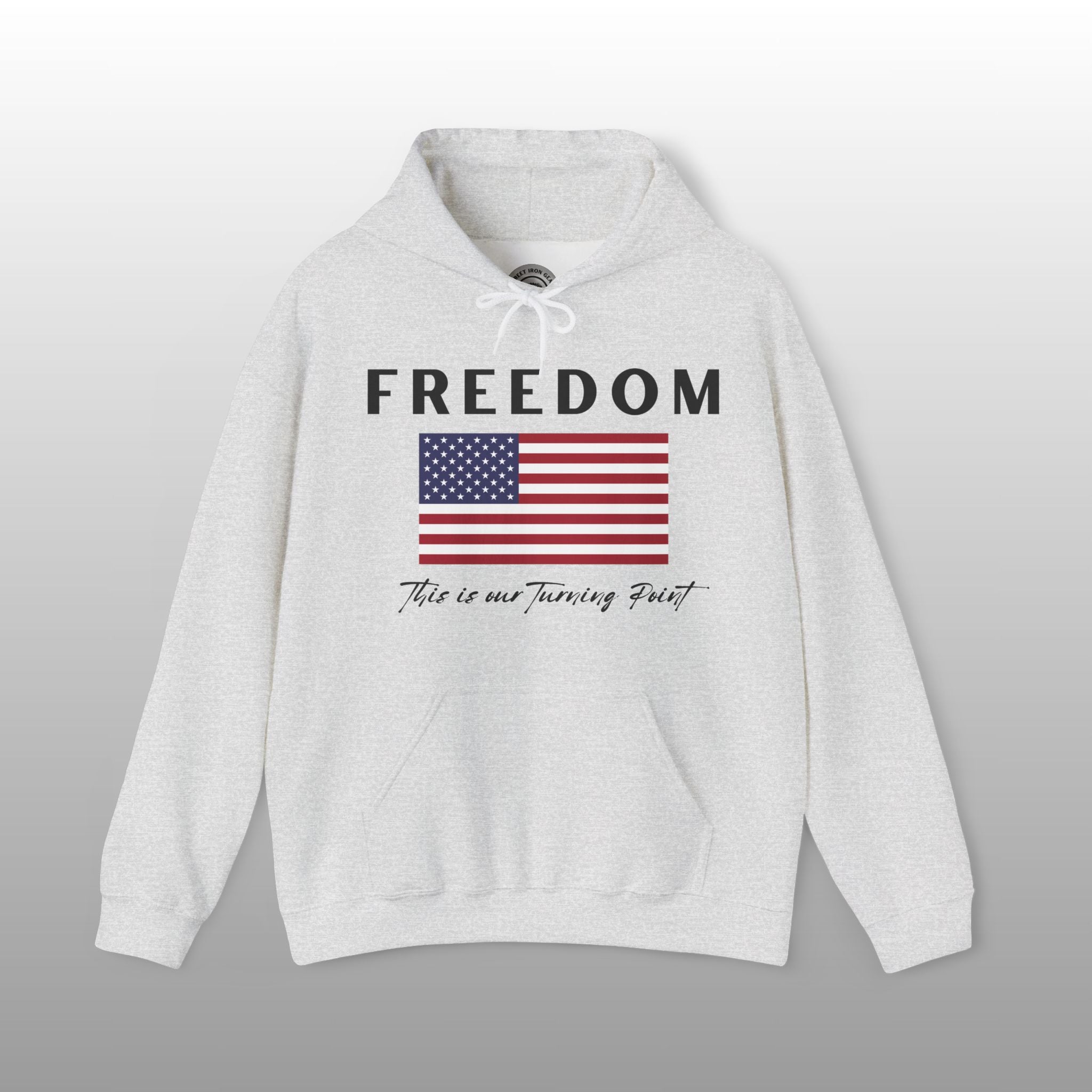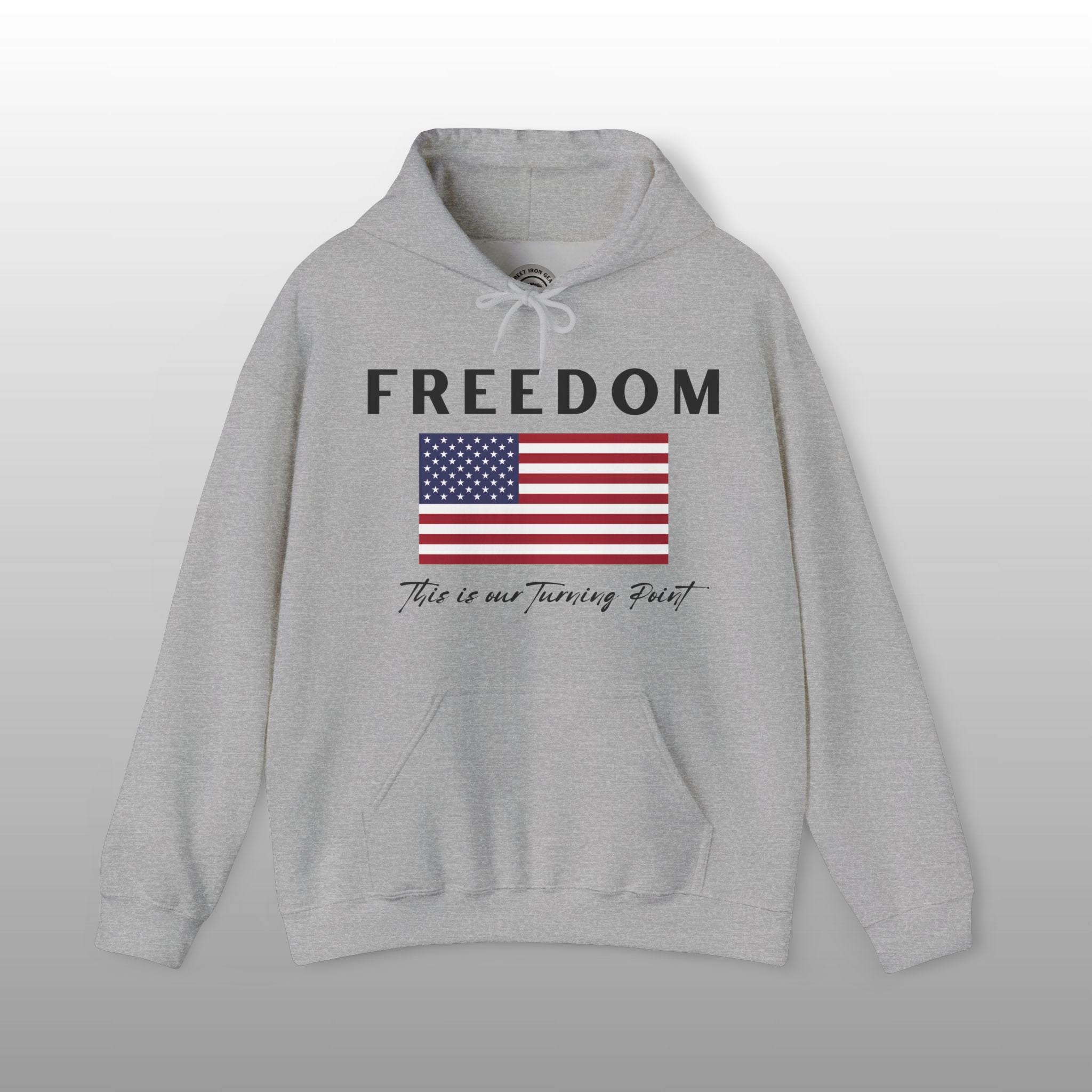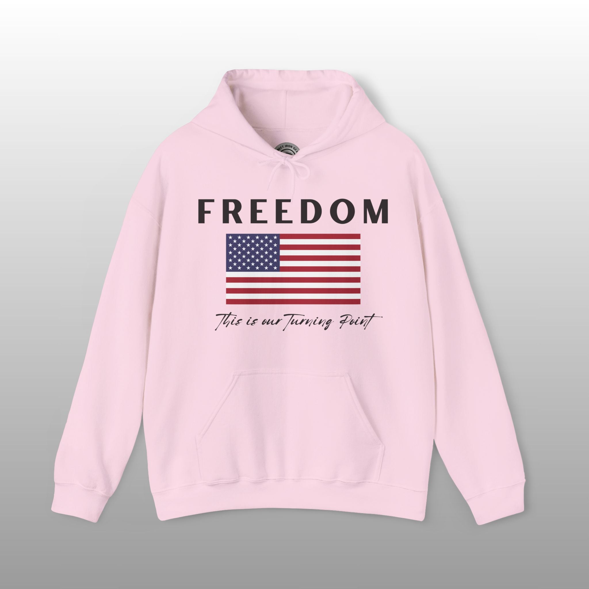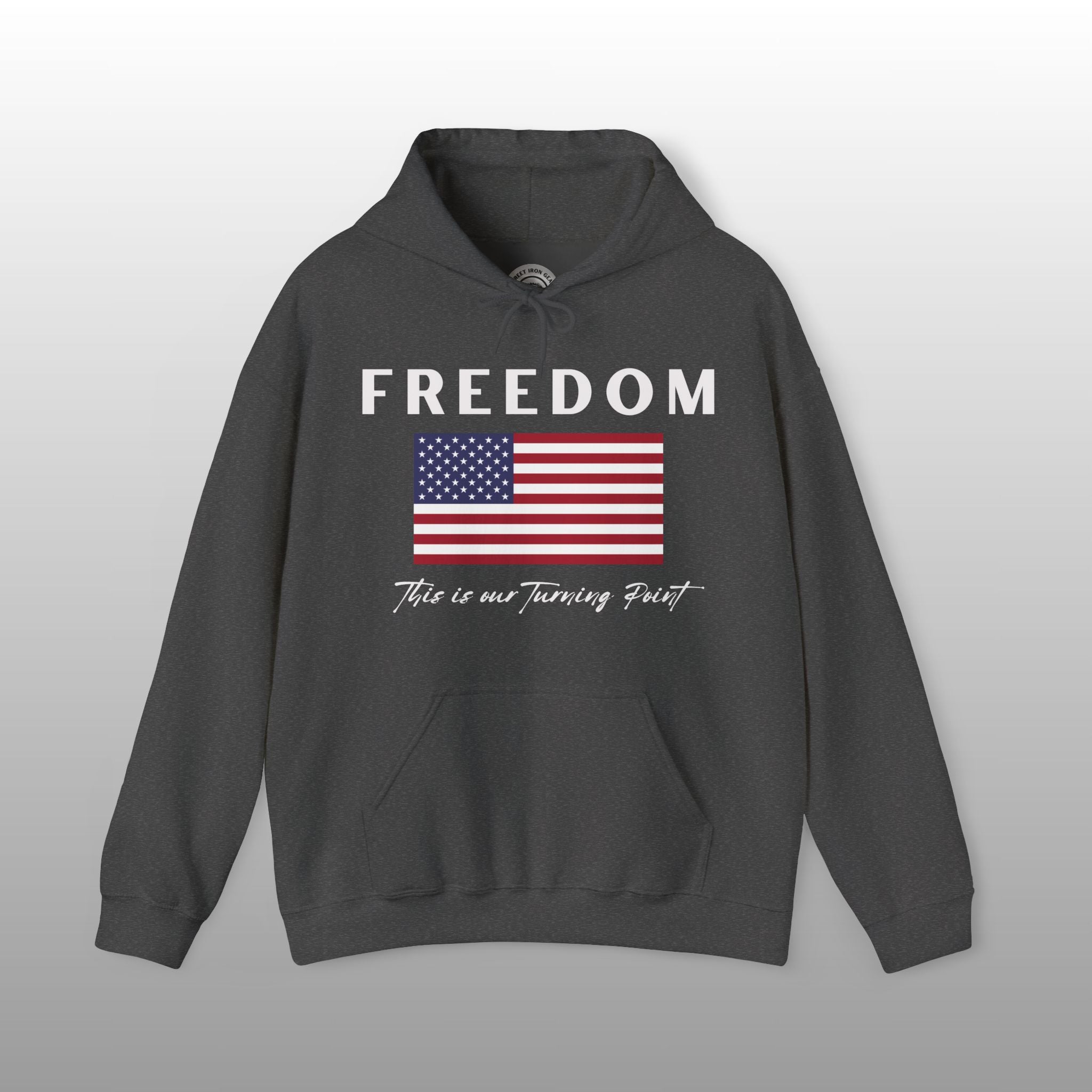 Show your patriotic spirit and commitment to American liberty with this bold hooded pullover sweatshirt. The simple yet powerful design prominently features the word 'FREEDOM' in large block letters across the chest, complemented by a distressed United States Flag graphic and the inspiring phrase, 'This is our Turning Point' below it—a tribute to the movement popularized by Charlie Kirk. This cozy and high-quality patriotic hoodie is made for comfort and is perfect for cooler weather, political rallies, or everyday wear. It makes an excellent gift for men or women who are proud American patriots, political enthusiasts, or anyone who supports conservative values and the fight for freedom. Wear your belief in America's future and spread the message of this powerful turning point in history.