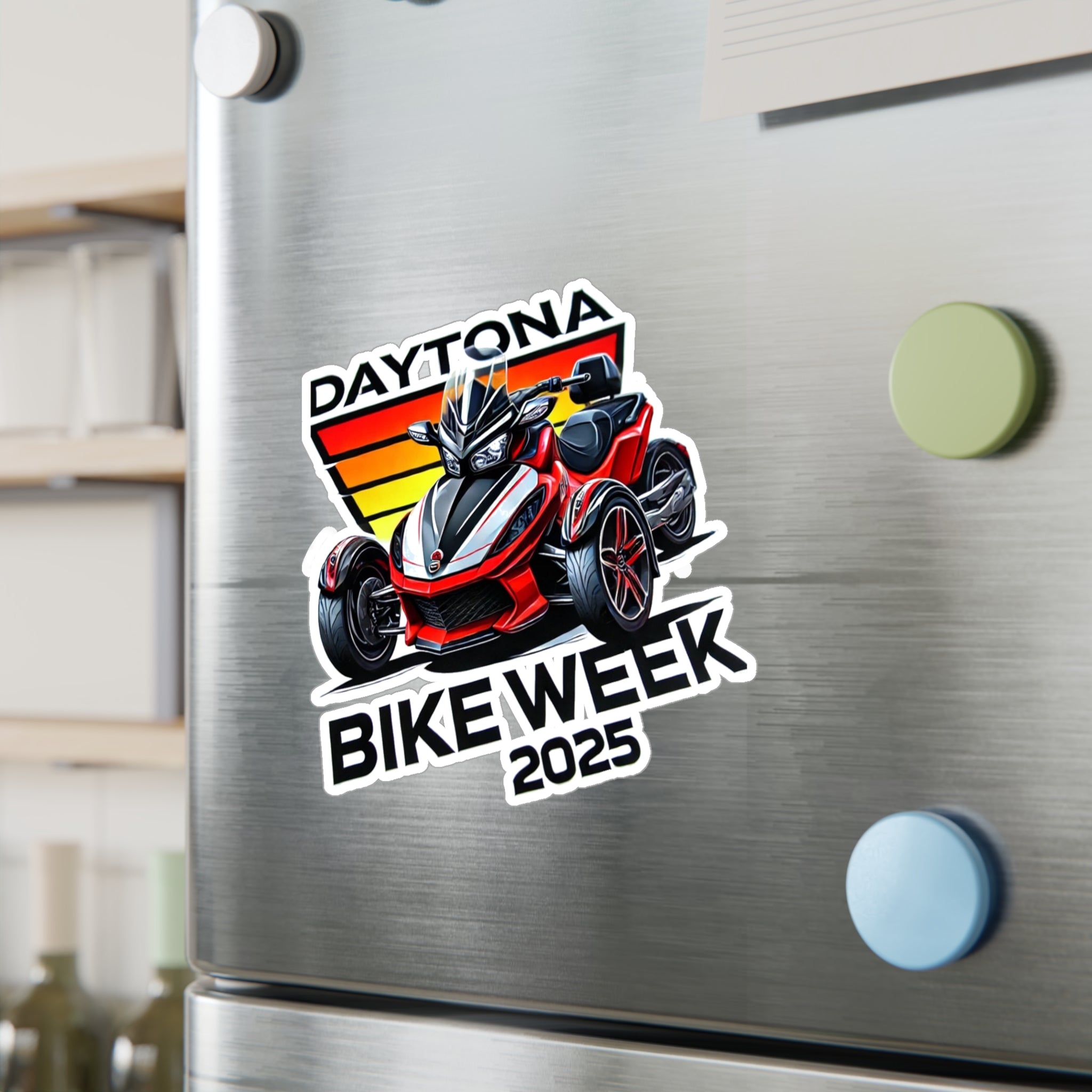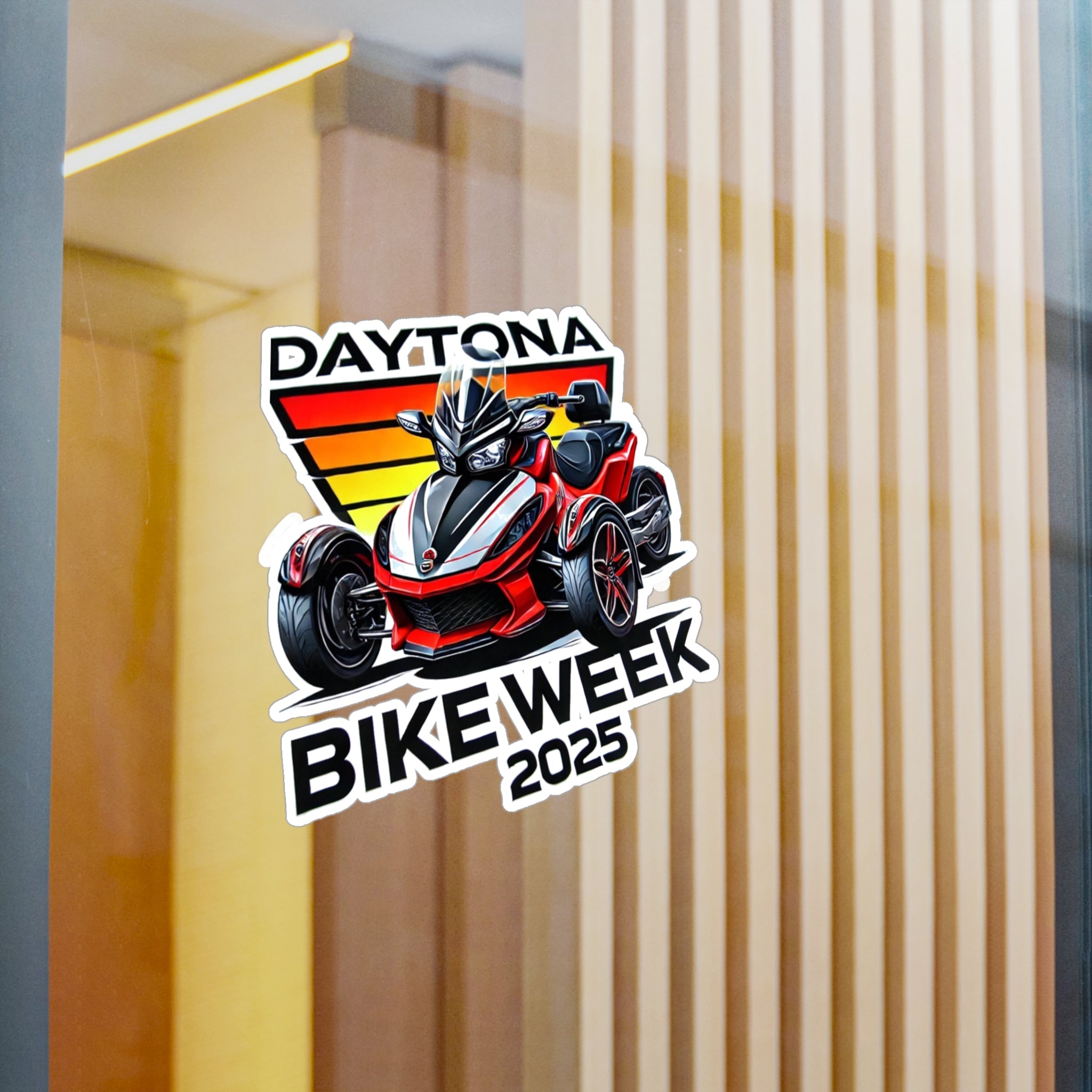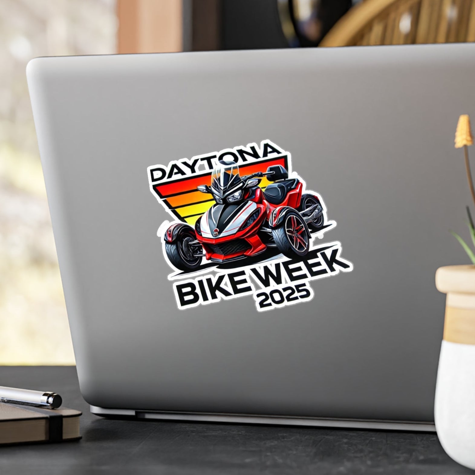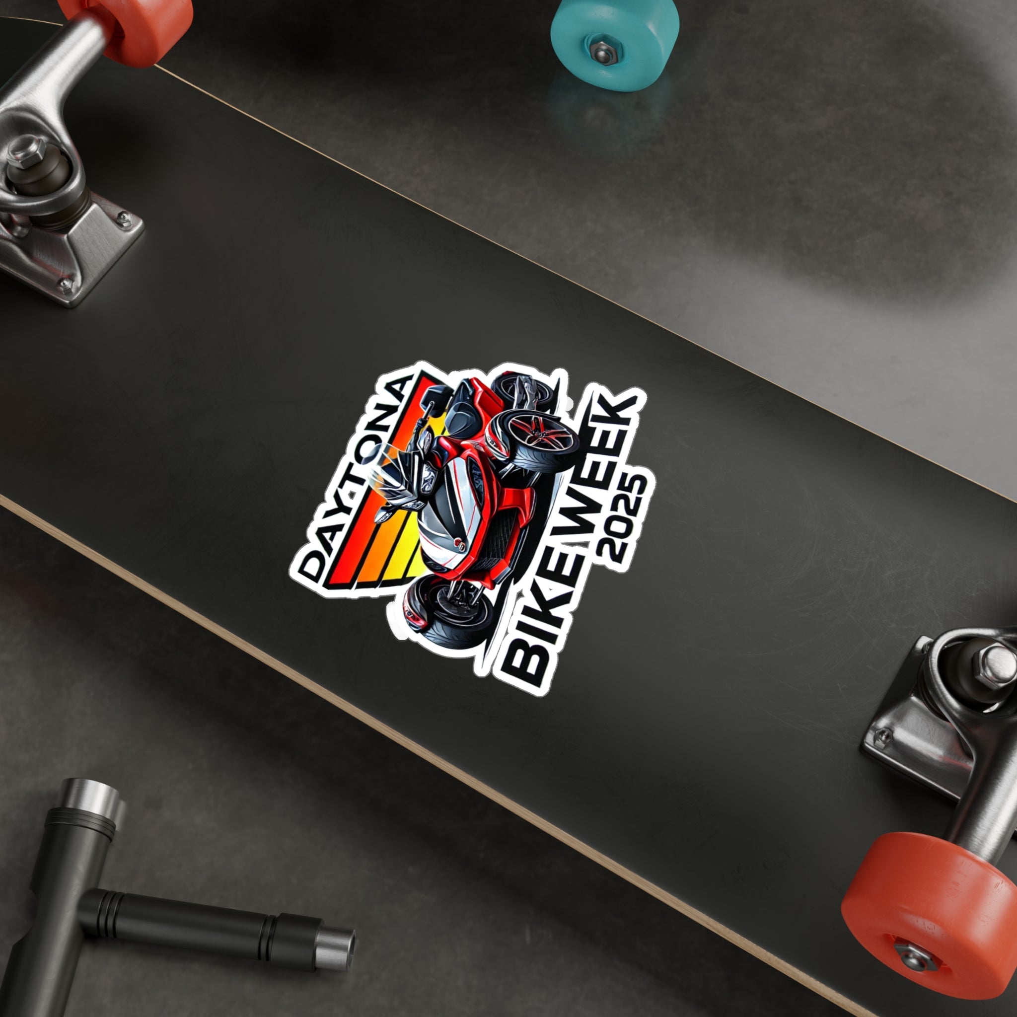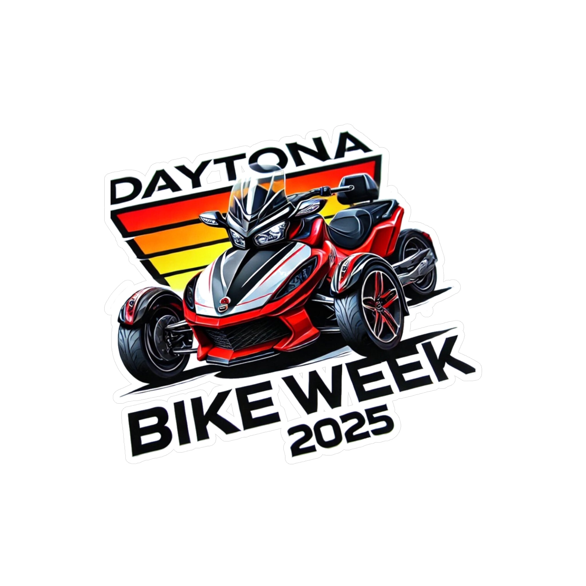 Commemorate the ultimate motorcycle event with our Daytona Beach Bike Week 2025 Kiss Cut Decal! Featuring a sleek Can-Am Spyder with a colorful retro background and bold text reading "Daytona Bike Week 2025," this high-quality vinyl decal is perfect for helmets, Spyder fenders, laptops, or car windows. It’s a must-have keepsake for every Bike Week enthusiast.